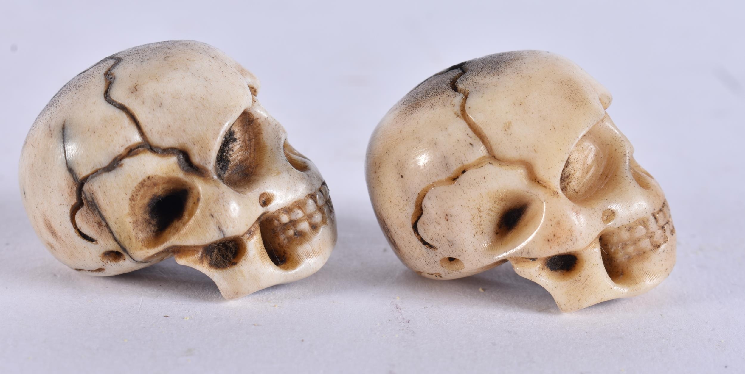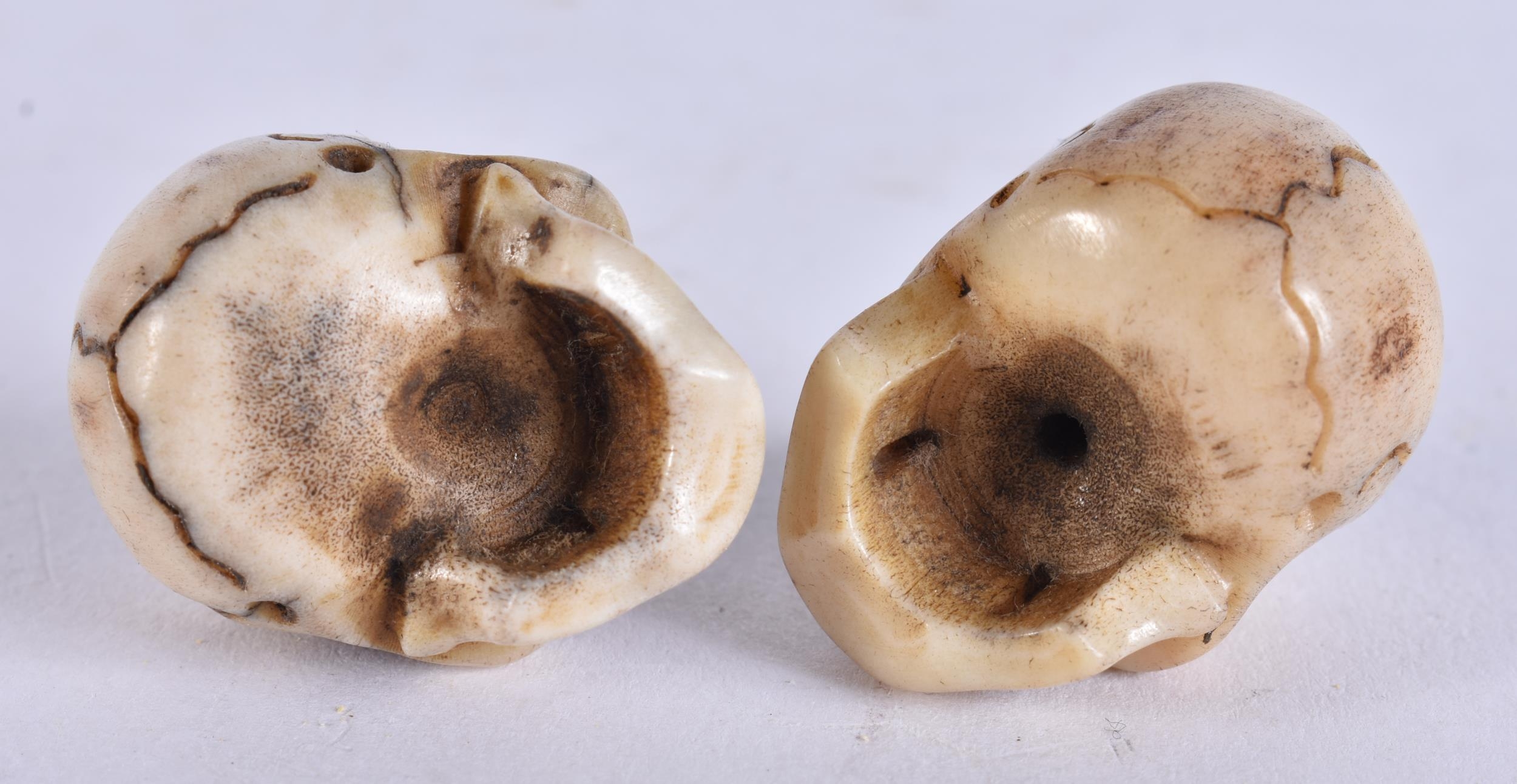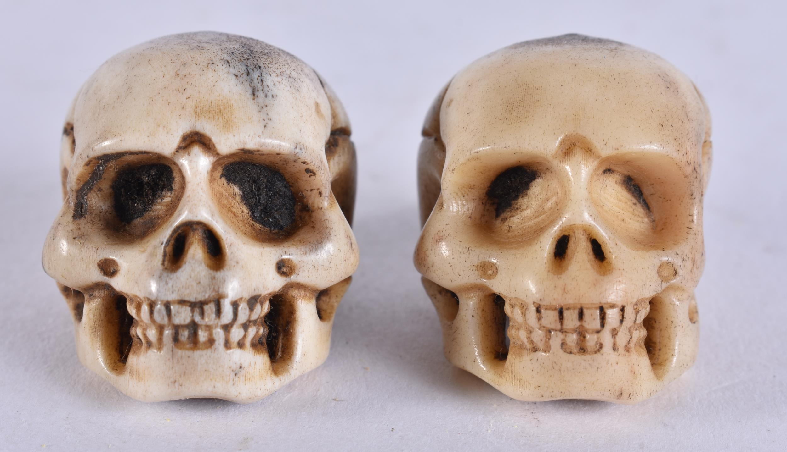 TWO MEMENTO MORI CARVED ANTLER HORN SKULLS. 28 grams. 2.75 cm x 2.75 cm. (2)