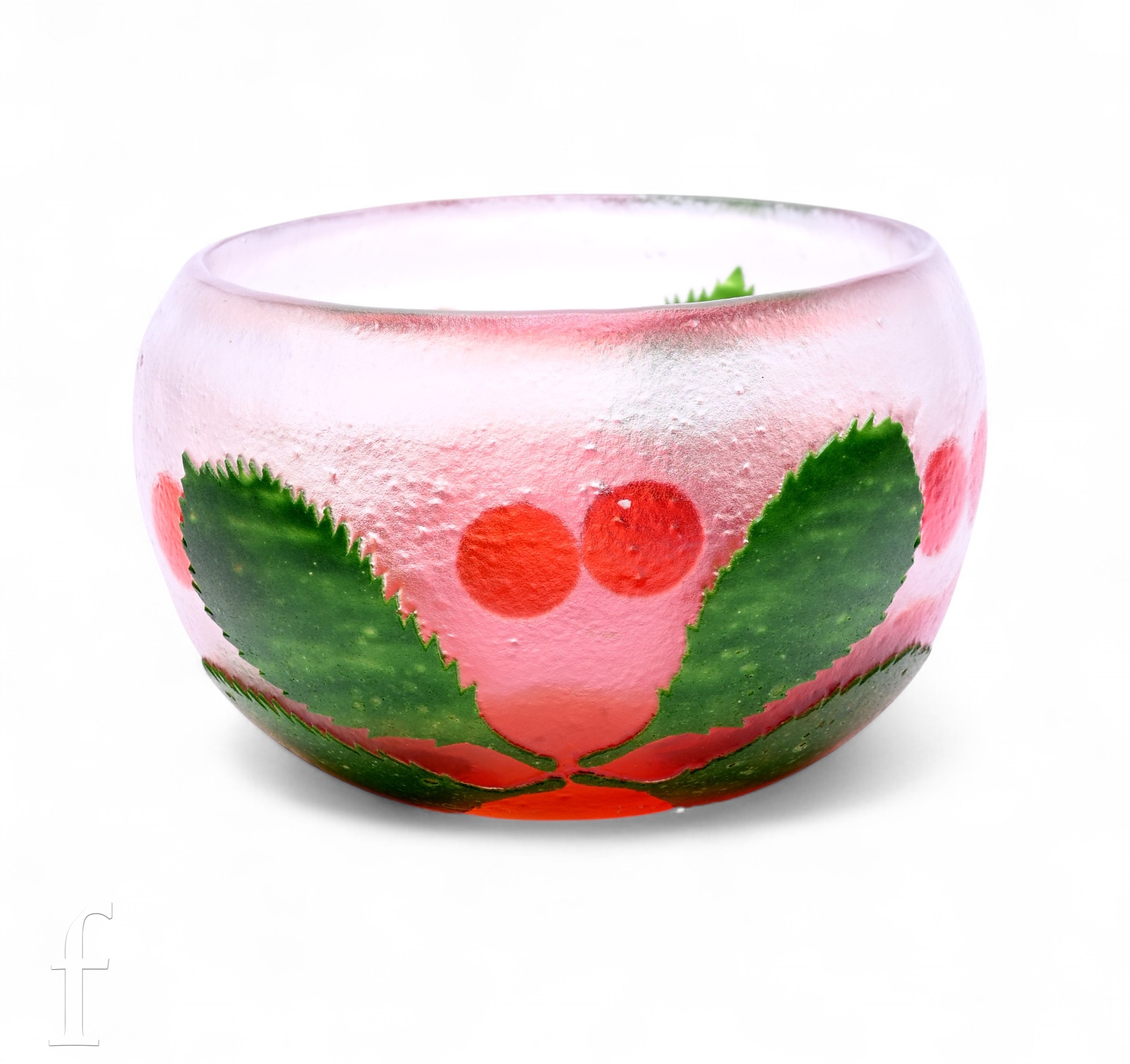 A large cameo glass bowl circa 1970 designed by Paul Hoff for Kosta, the swollen ovoid bowl cased in green over clear within internal red and interior red casement, cut with stylised leaves and berries, signed to the base, width 23cm.