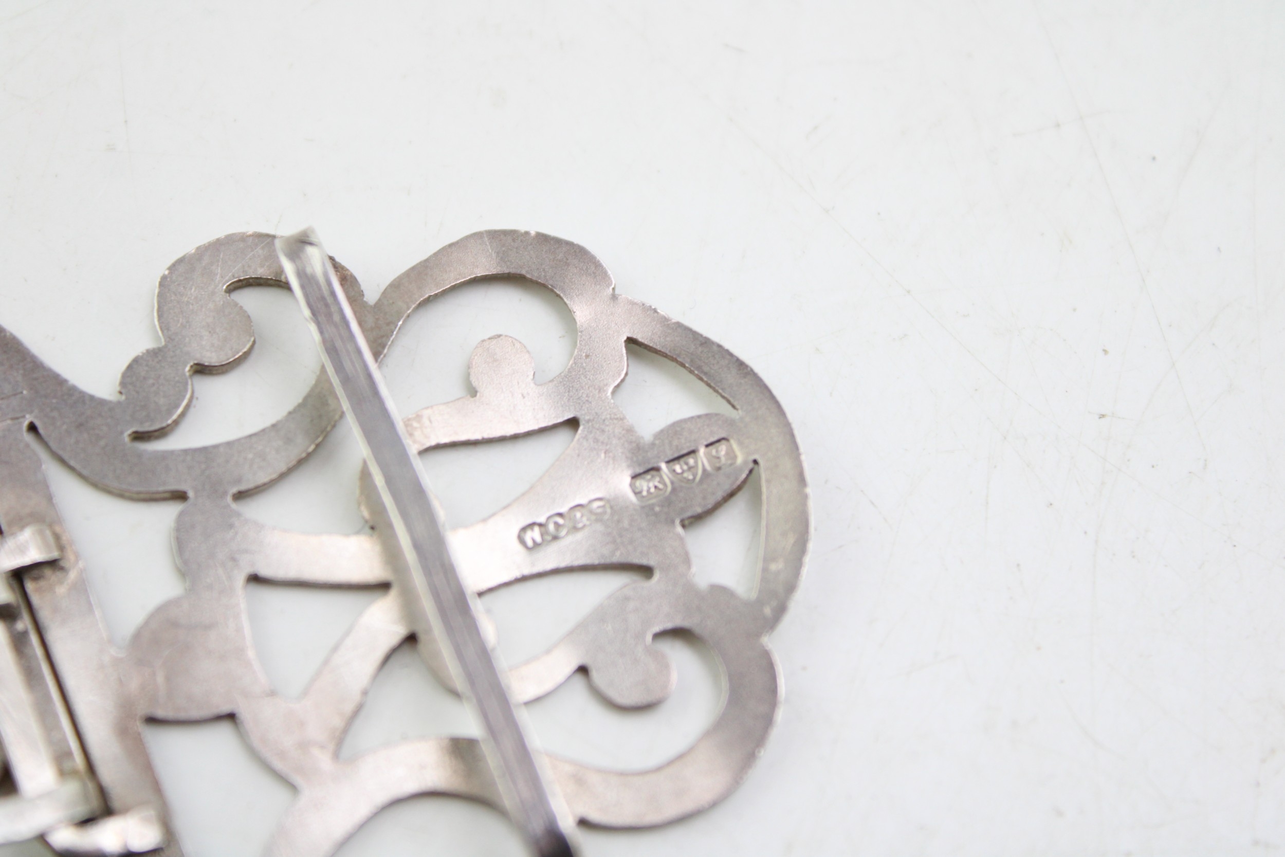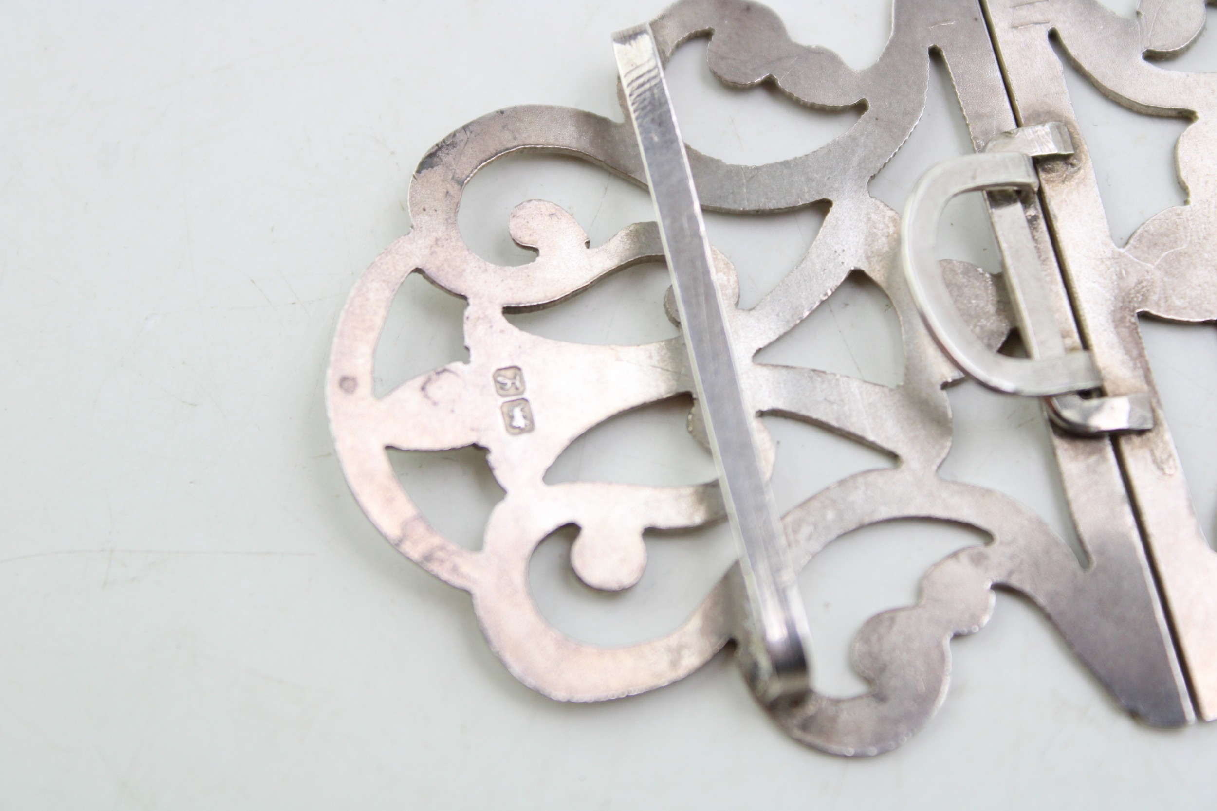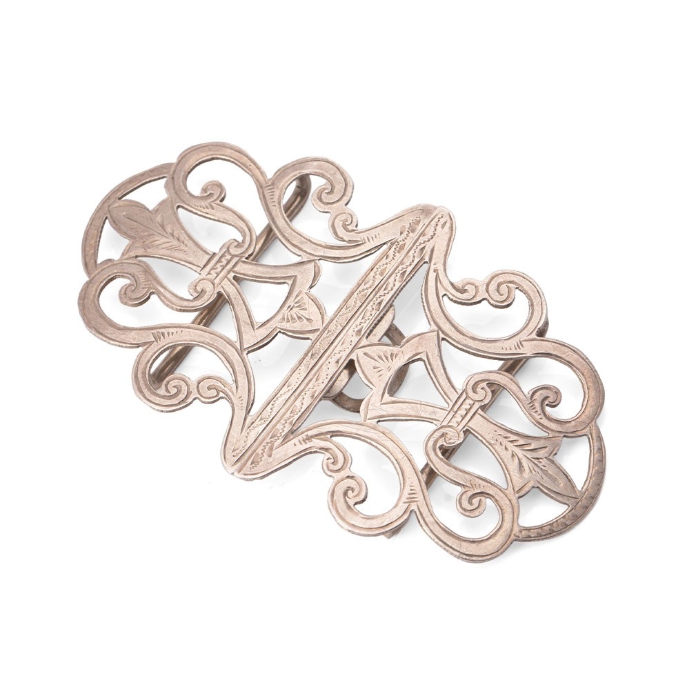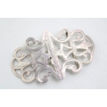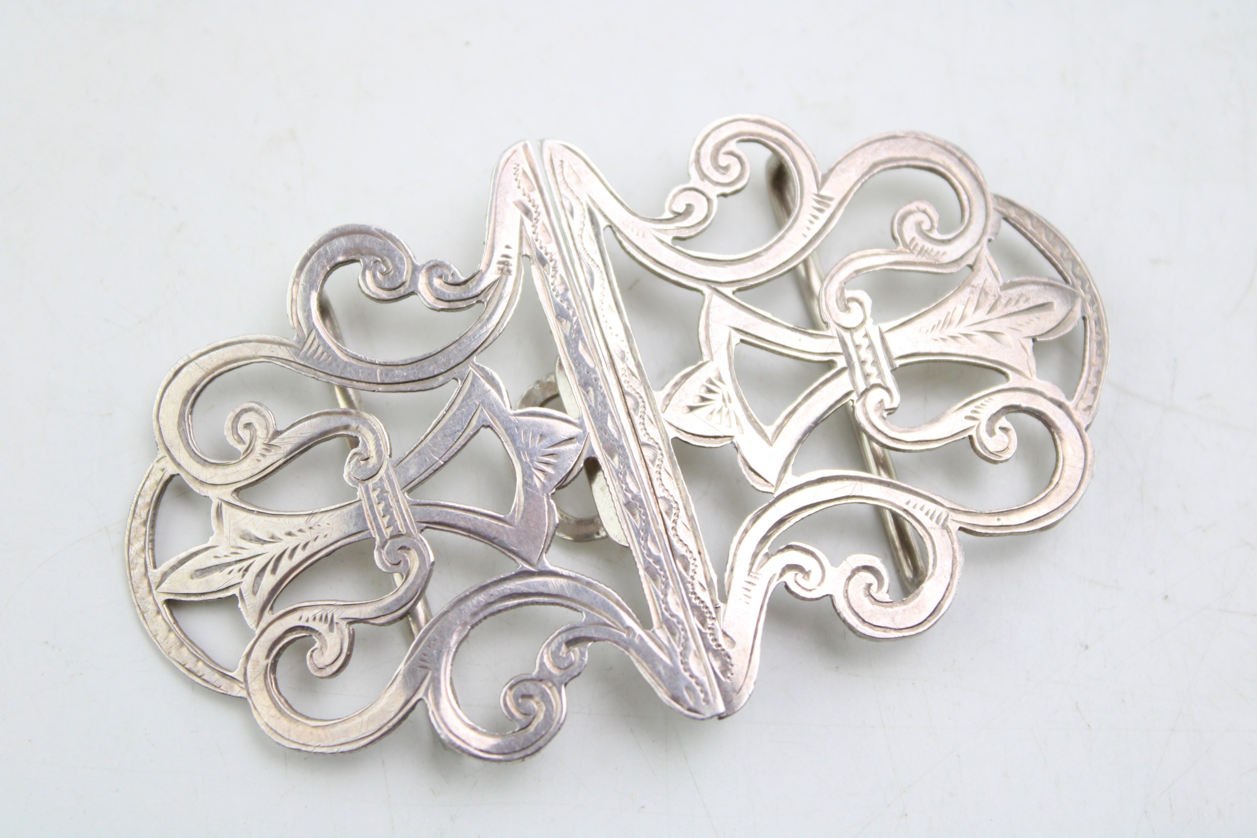 A silver nurse's buckle of scrolling strapwork form with engraved detail, William Clarke & Son, Chester 1911, 15.3g, 0.49toz.