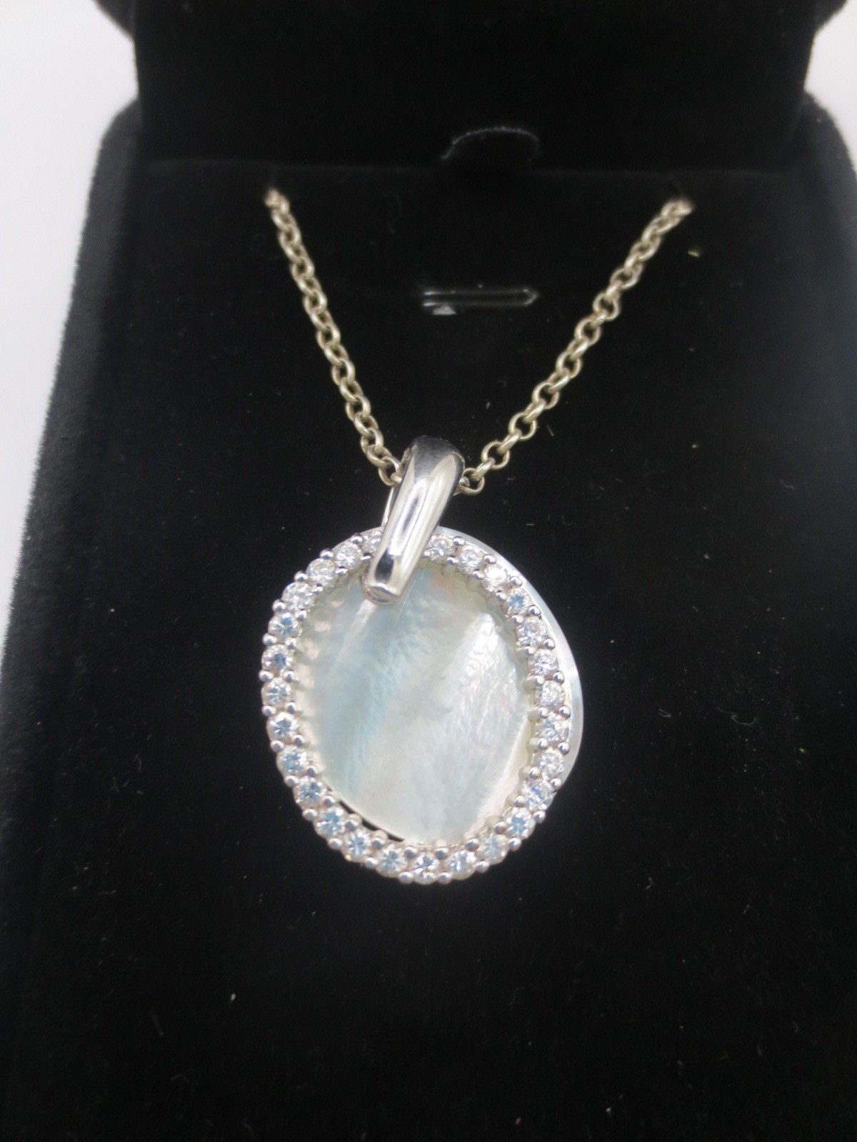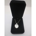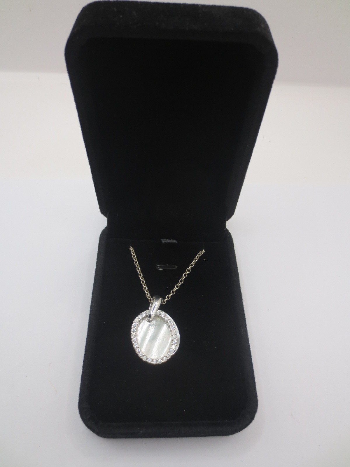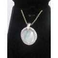 A 925 silver necklace with a 925 silver, cubic zirconia and mother of pearl oval pendant. With a black presentation box