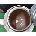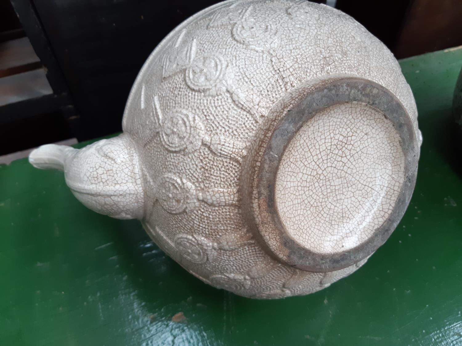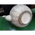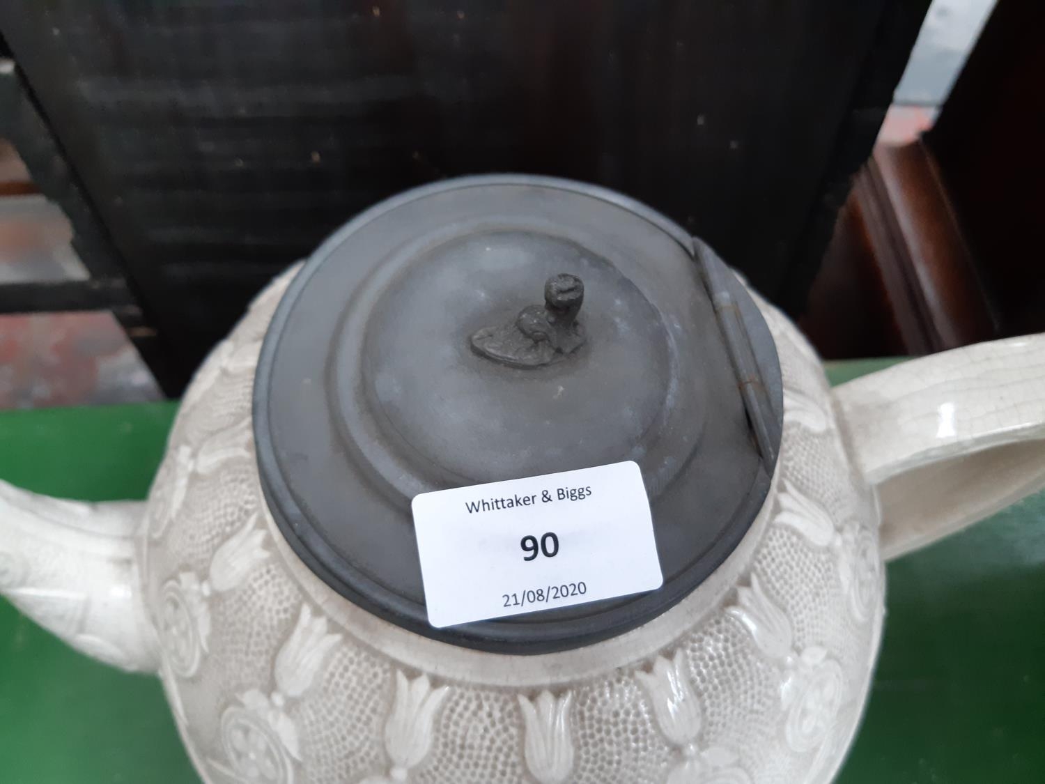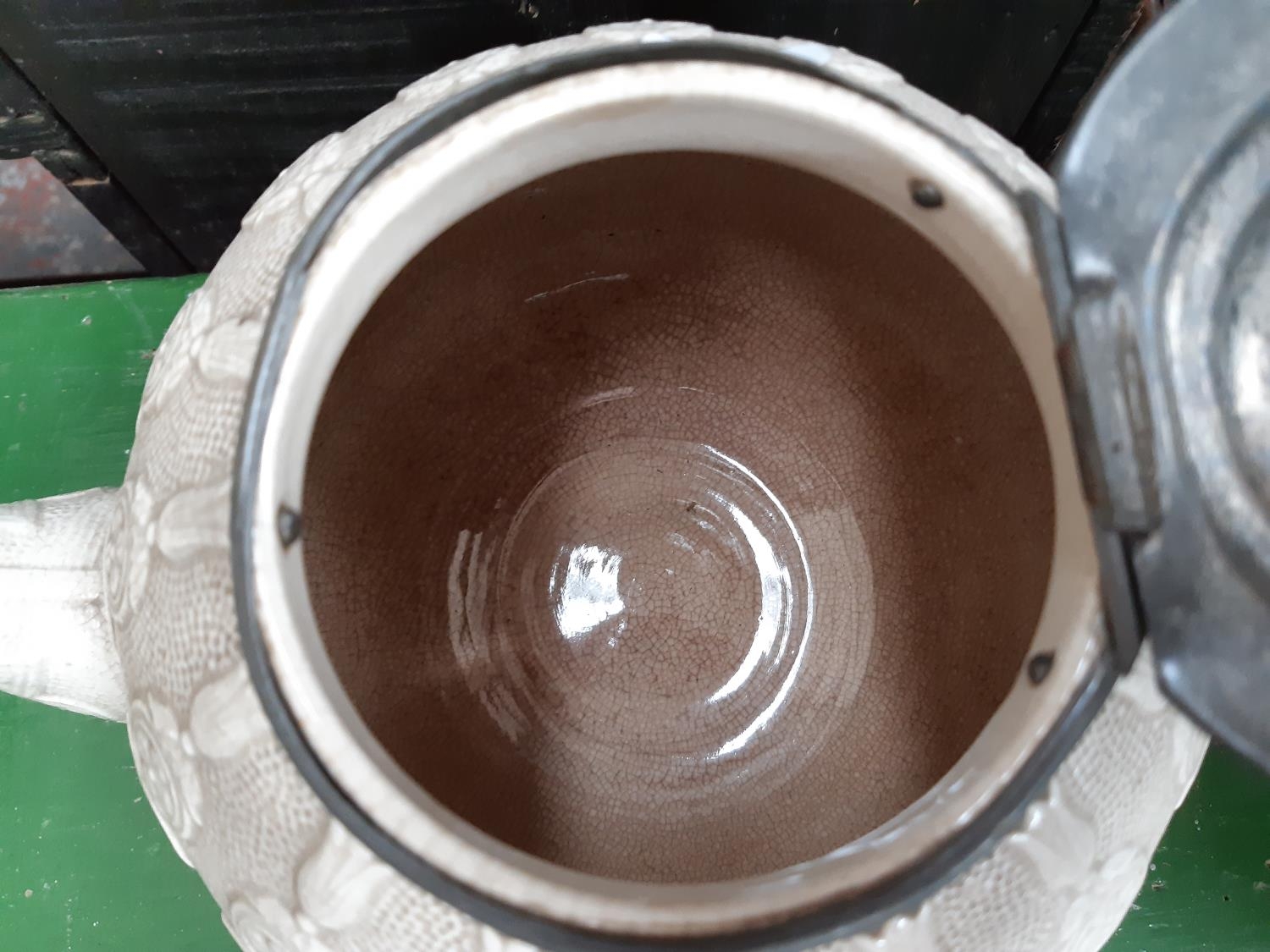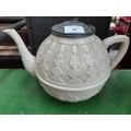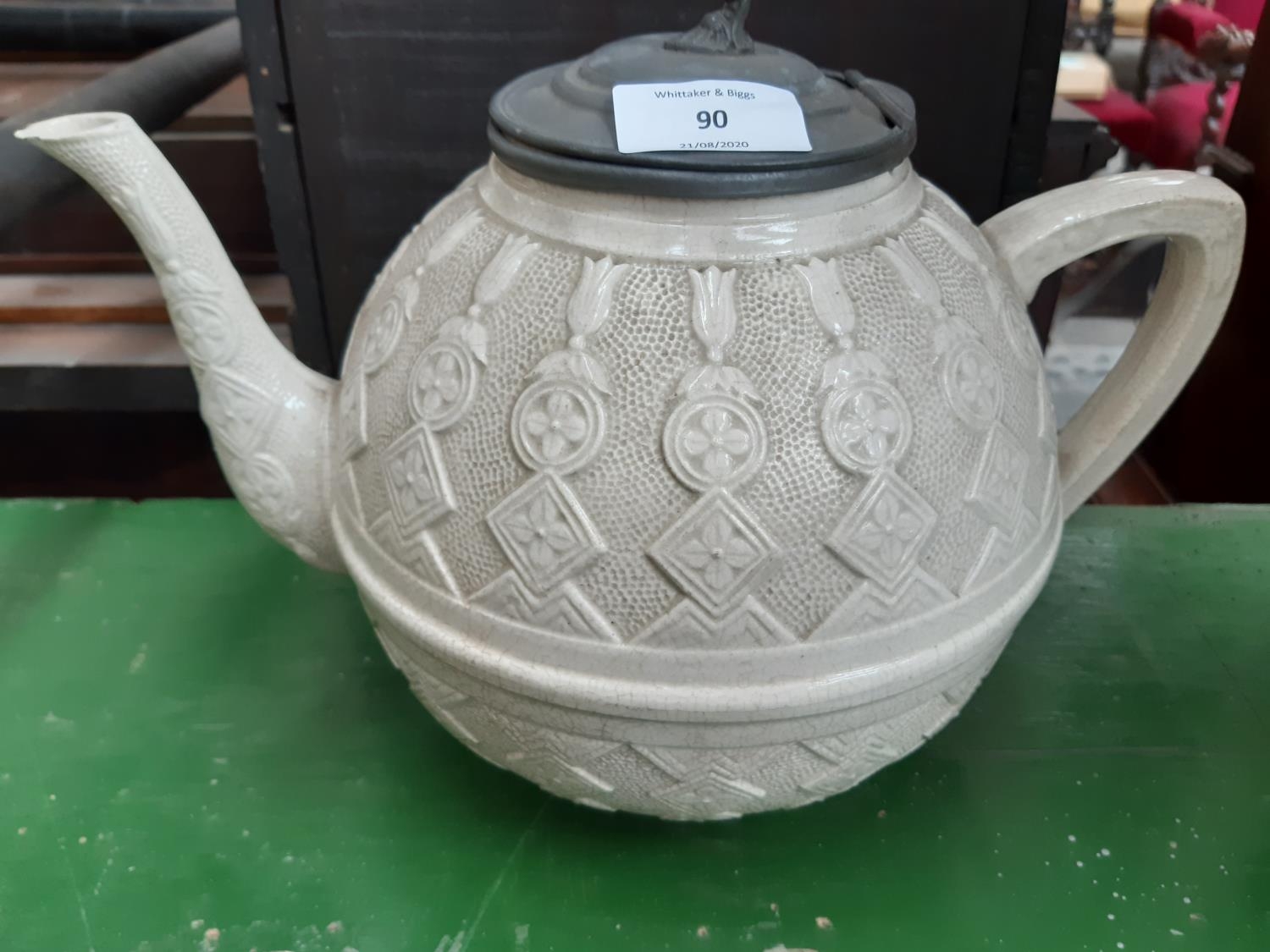 A Victorian white creamware teapot with pewter lid