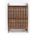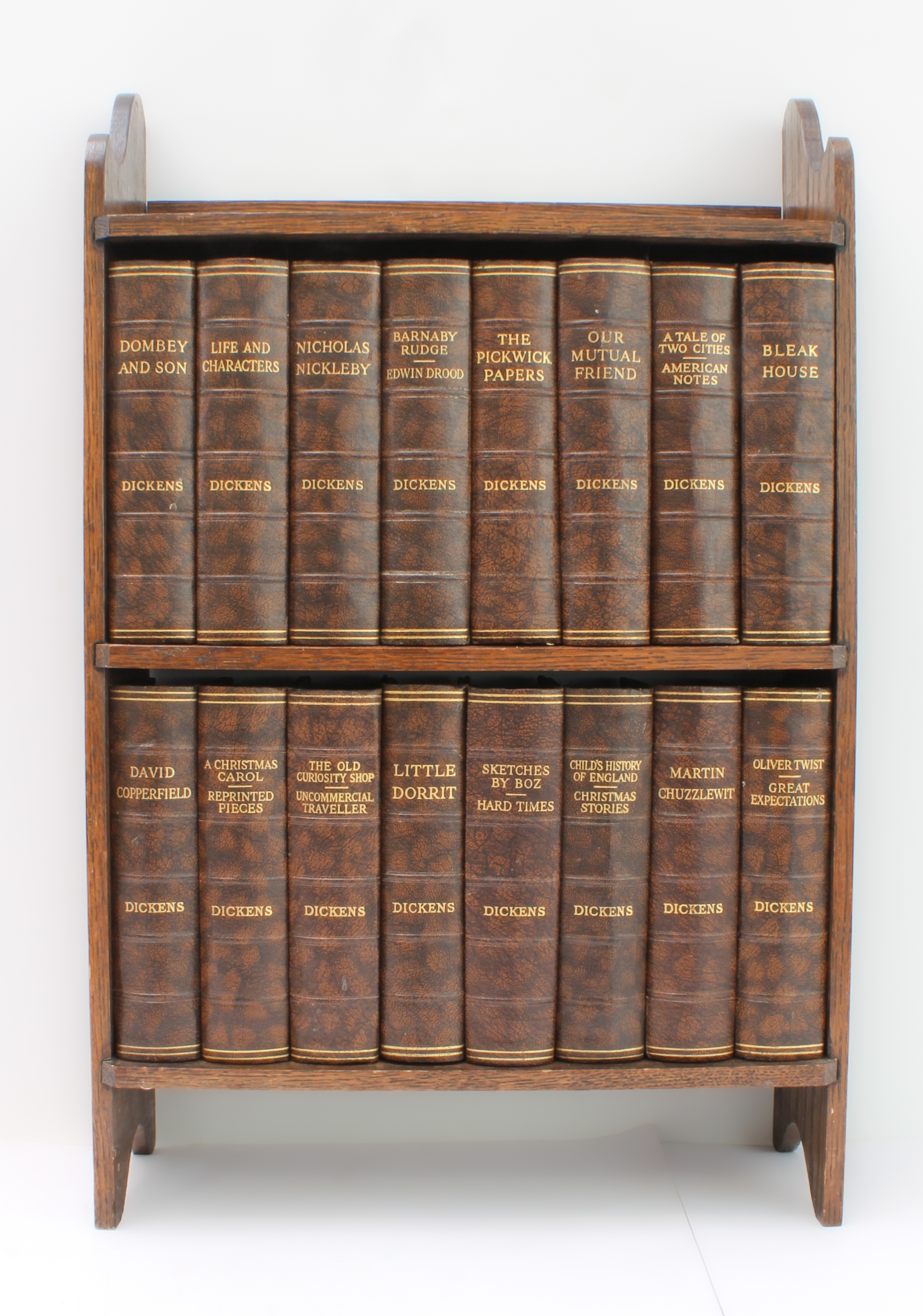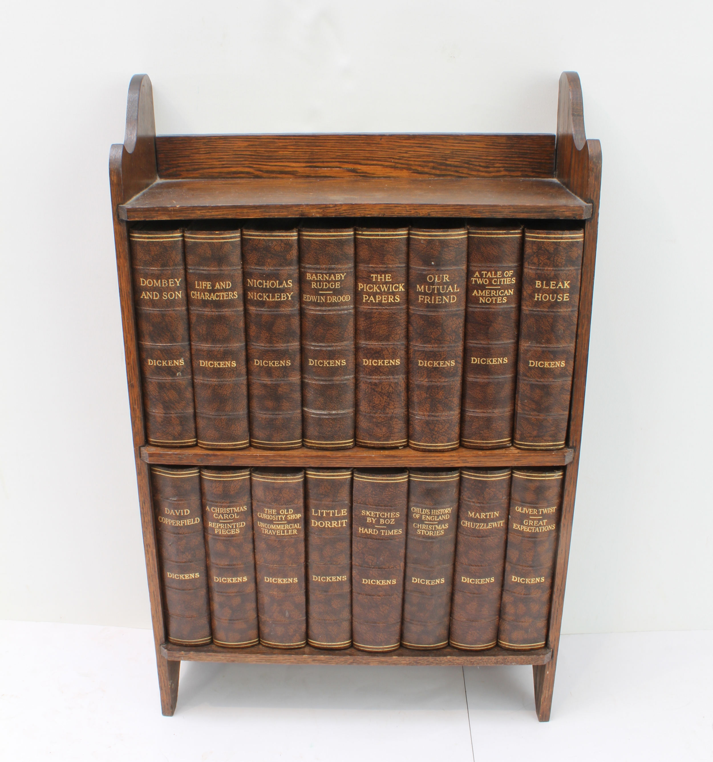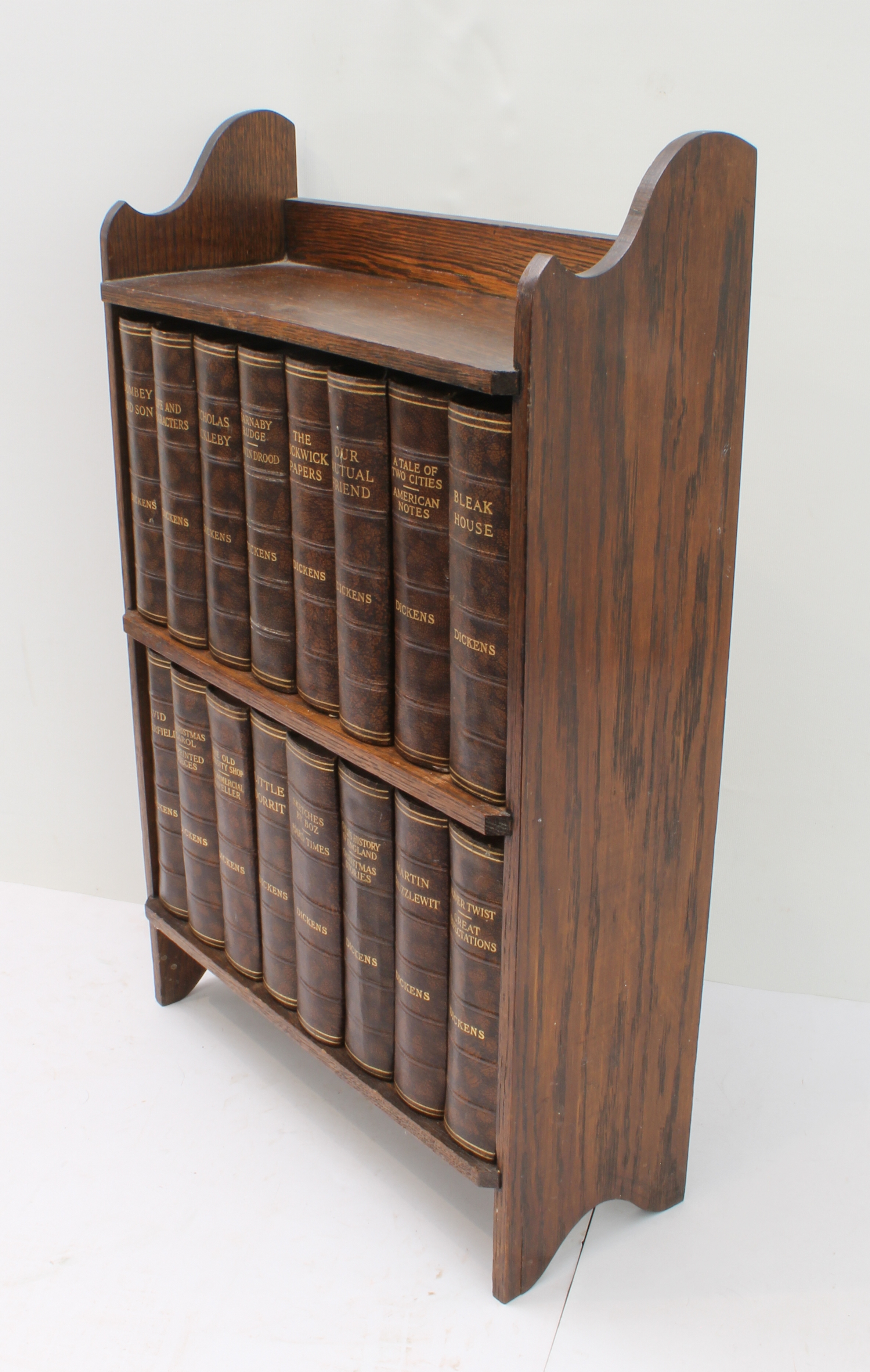 A set of 16 Charles Dickens volumes in their oak tabletop bookshelf (LWH 36 x14 x 56 cm).