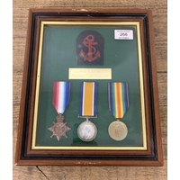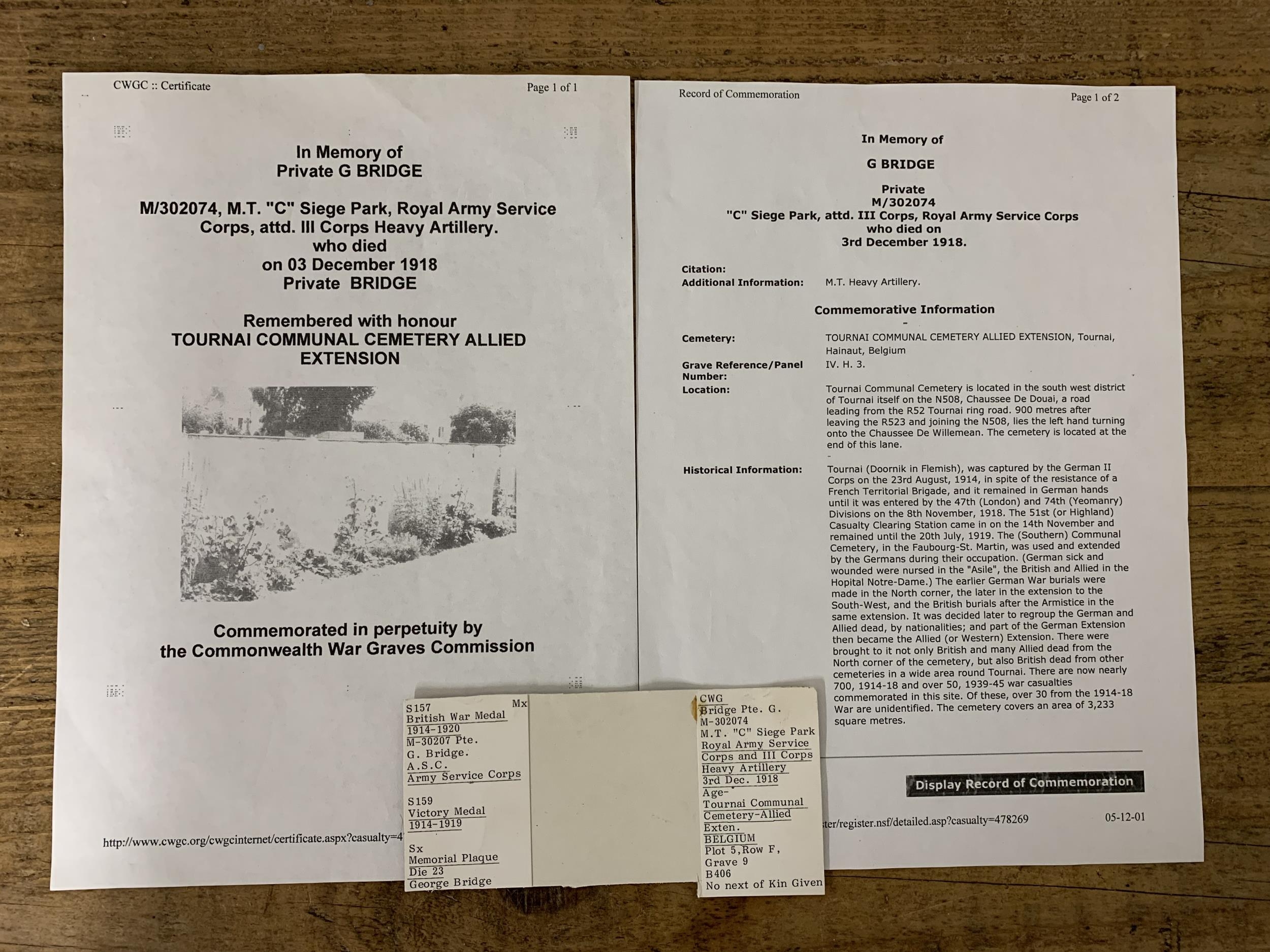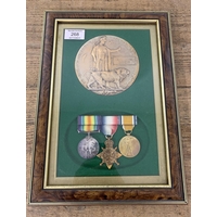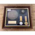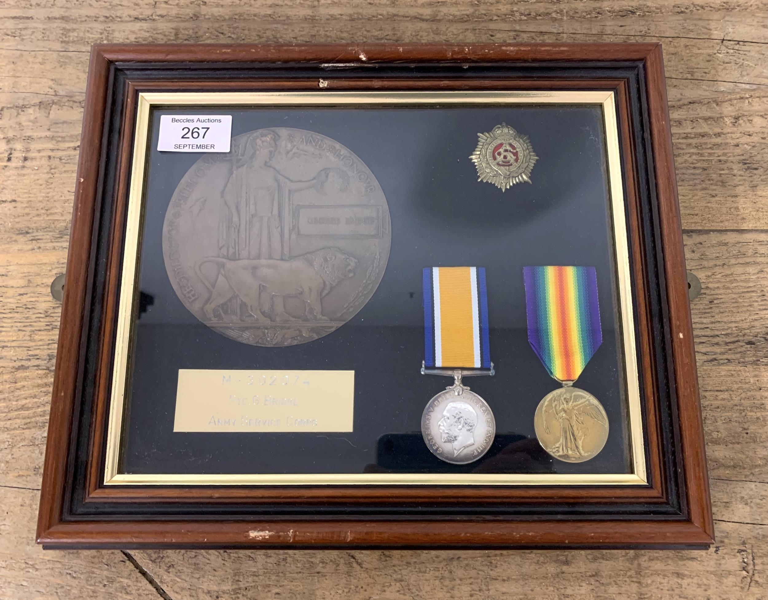 A framed WW1 pair of medals and associated memorial plaque, internal plaque reads 'M-302074 Pte G.Bridge Army Service Corps'