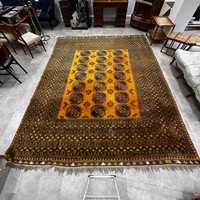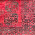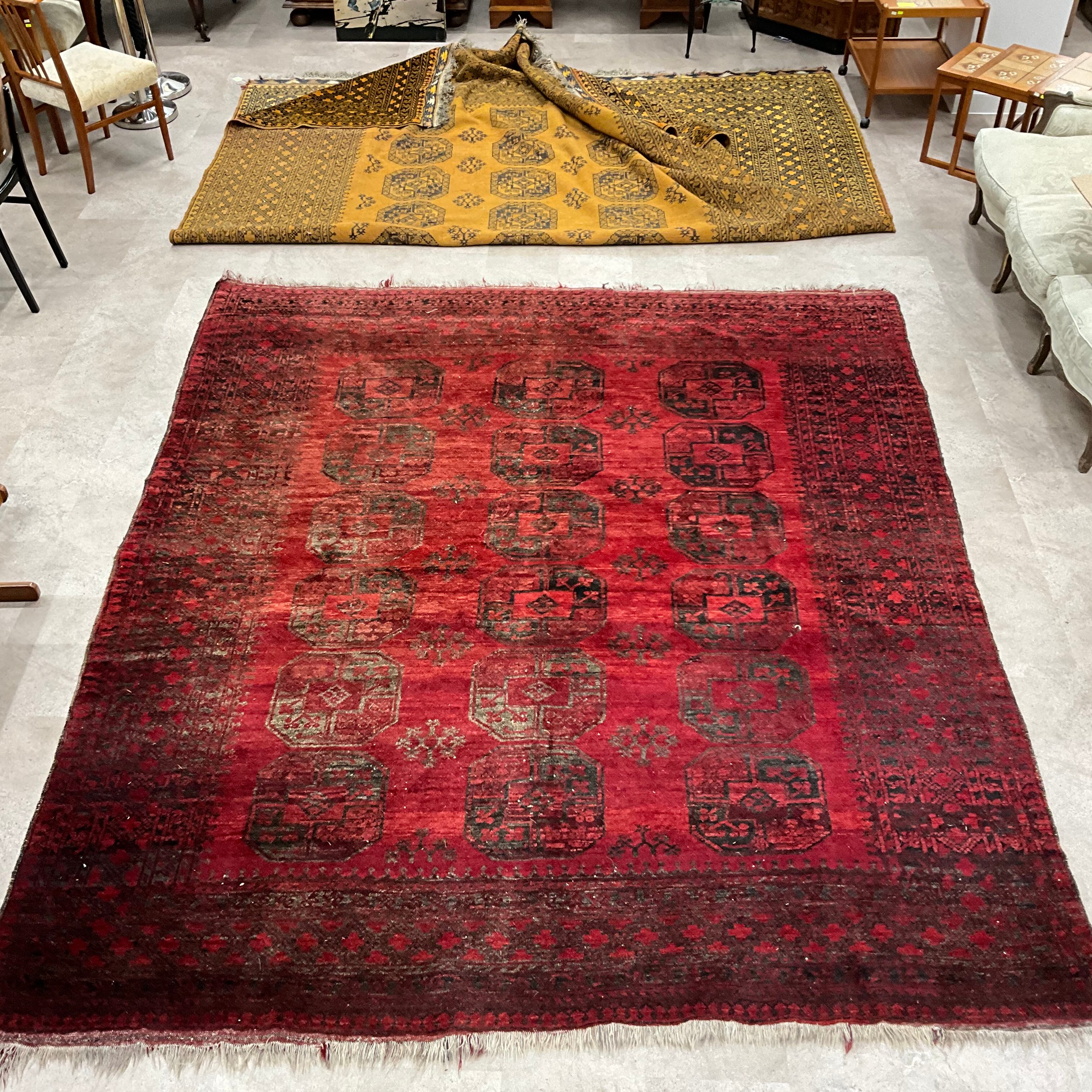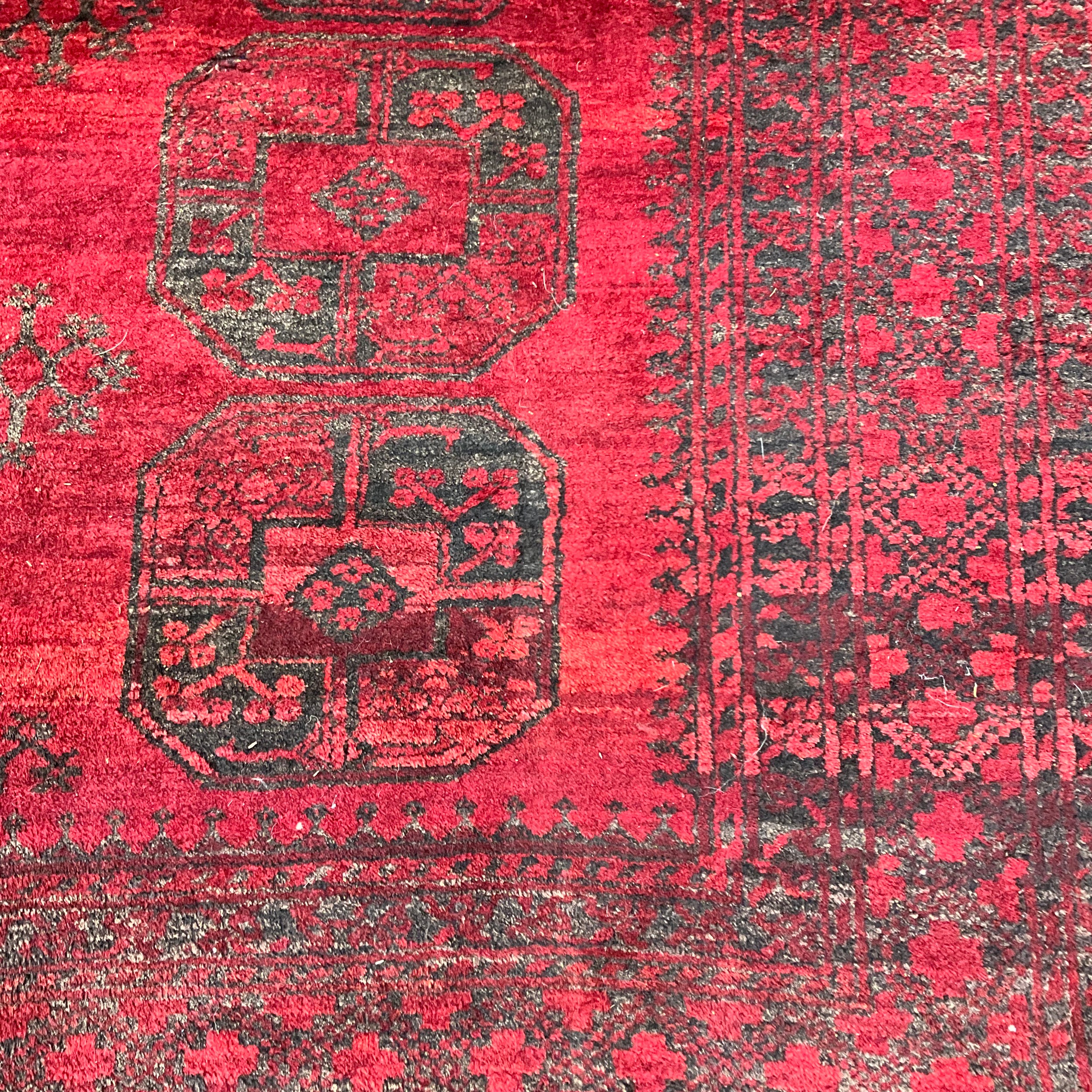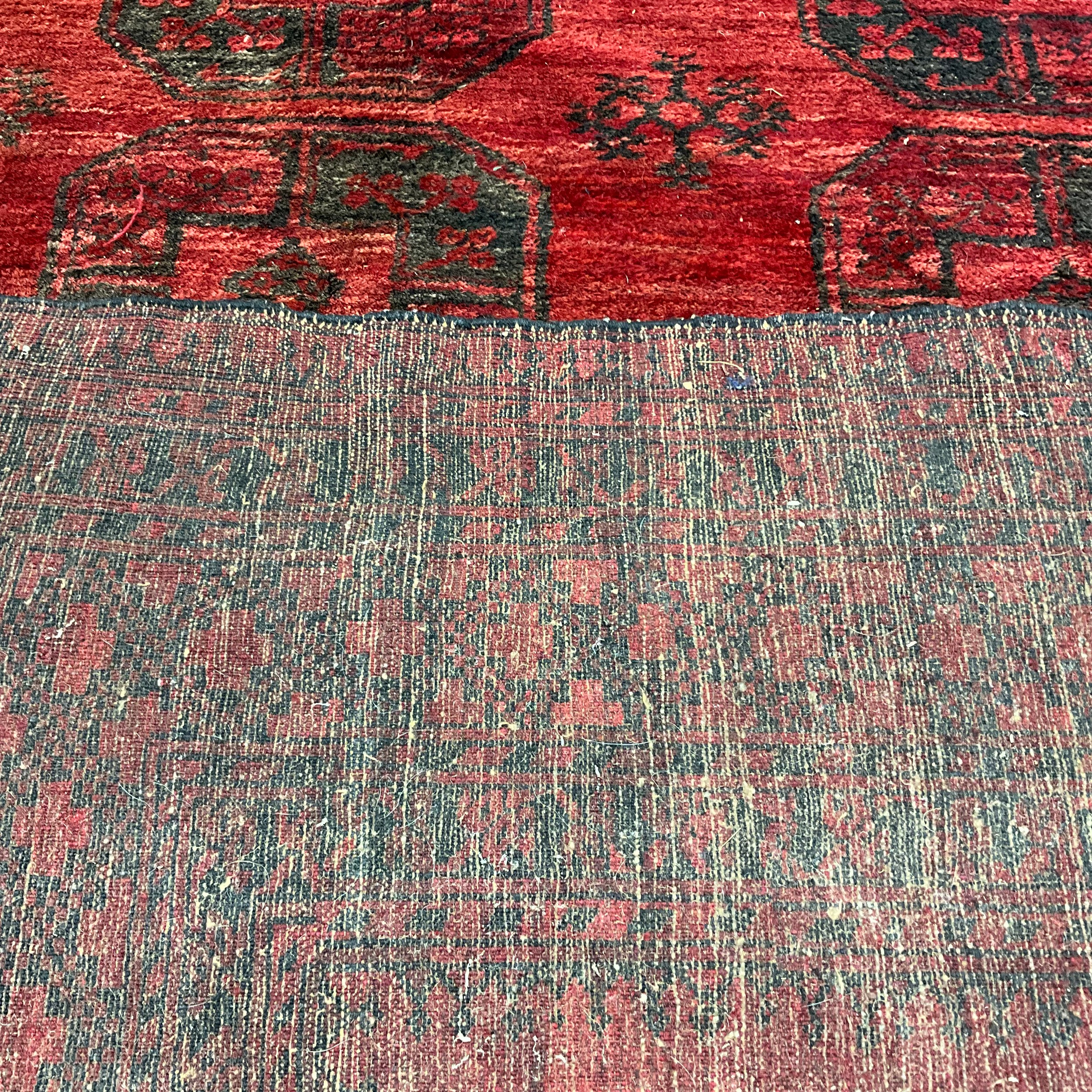 A Middle Eastern Turkman hand-knotted woollen room-sized rug, with three central rows of six medallions, on a red ground, within multiple borders. 255cm x 300cm.