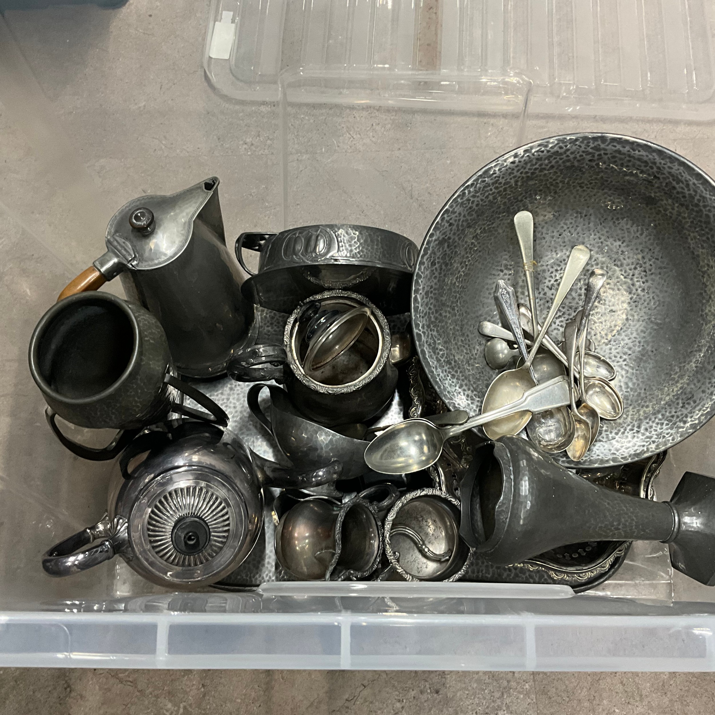 Large collection of Art Nouveau pewter and silver plated items to include self pouring tea pot.