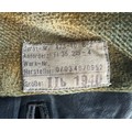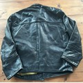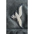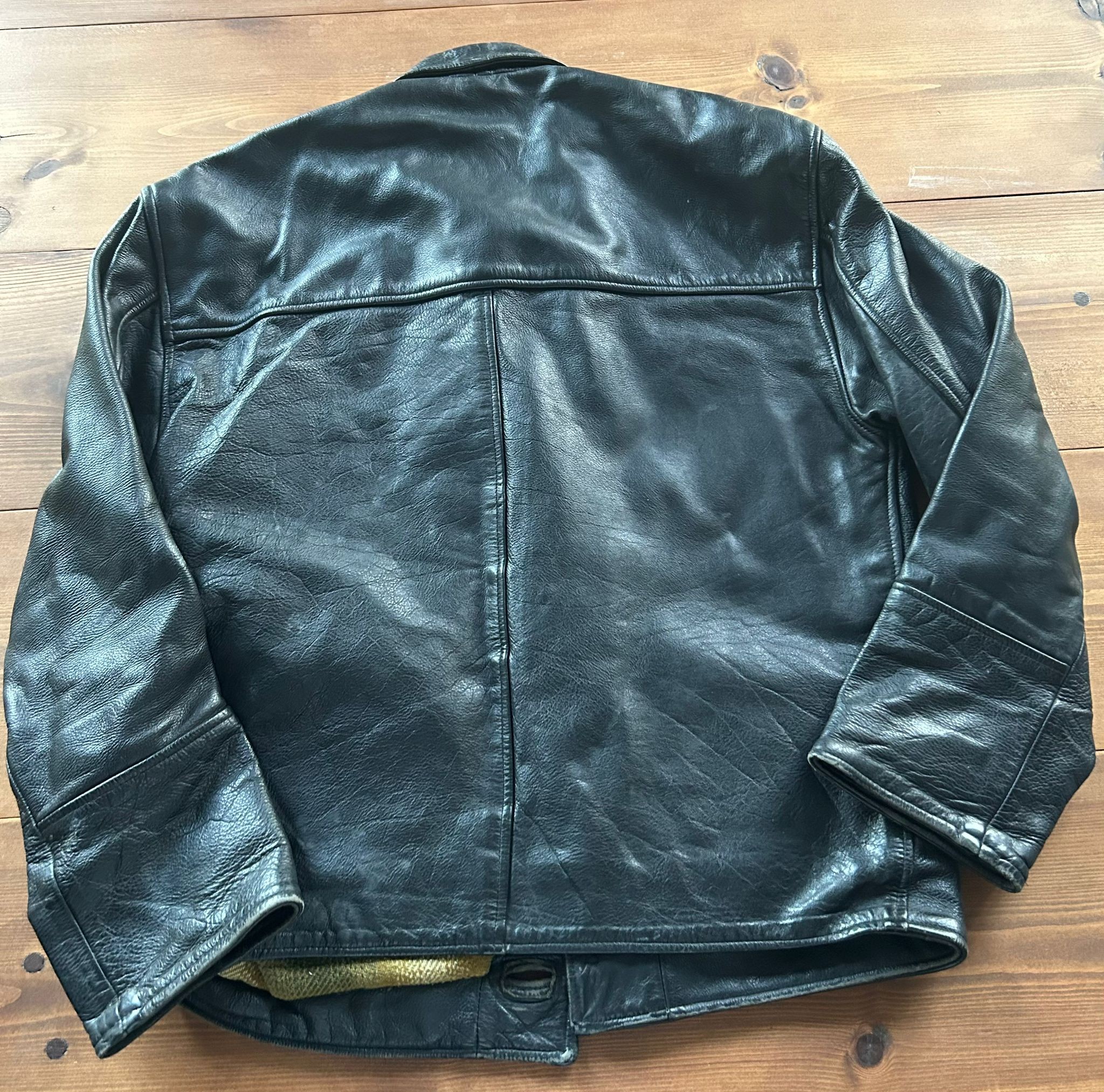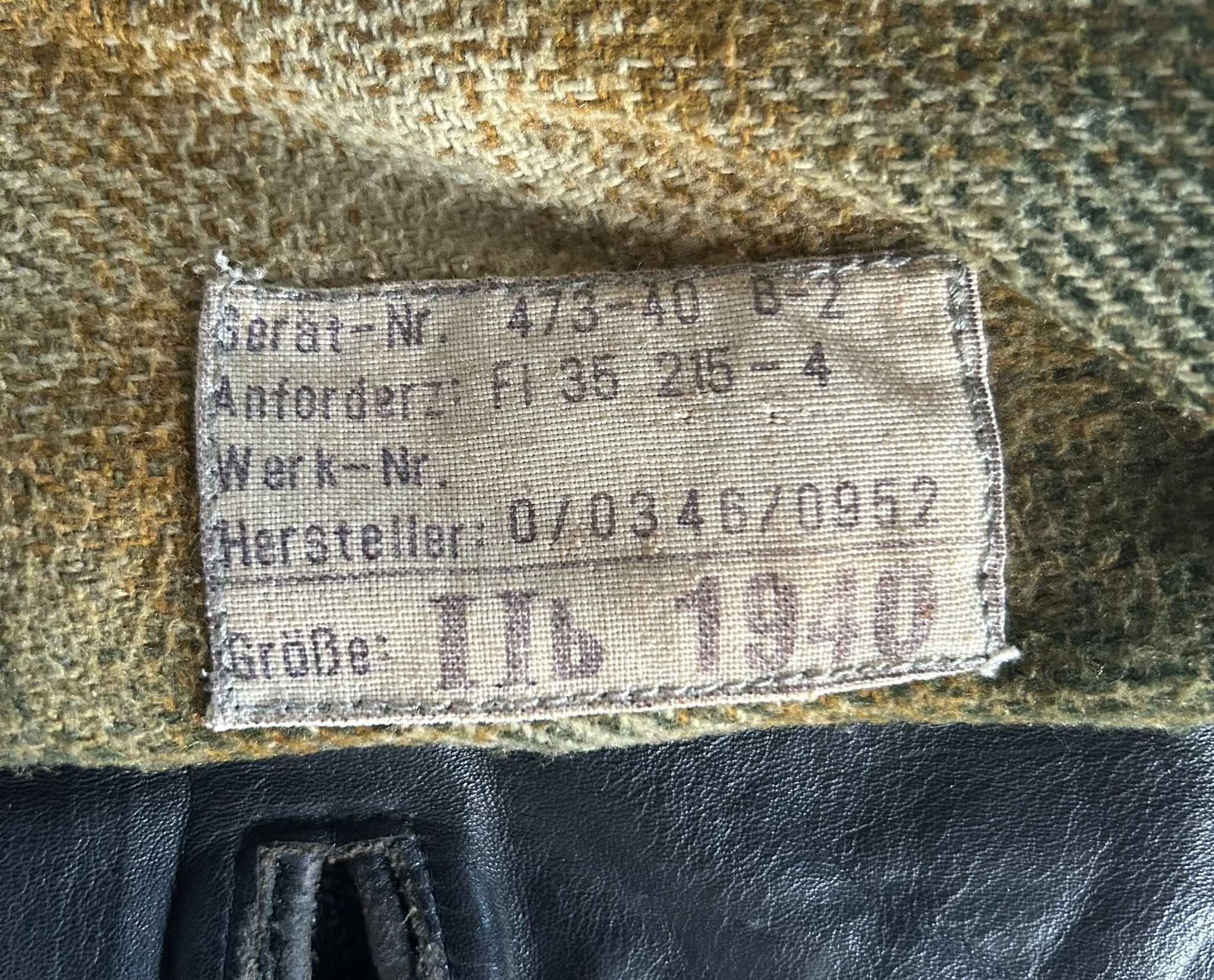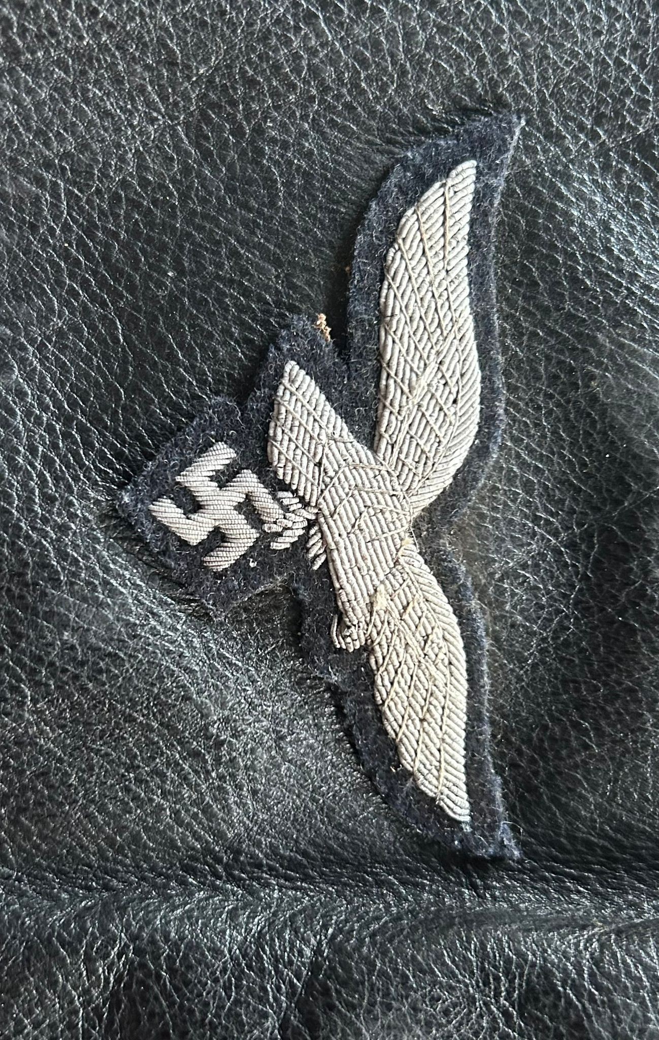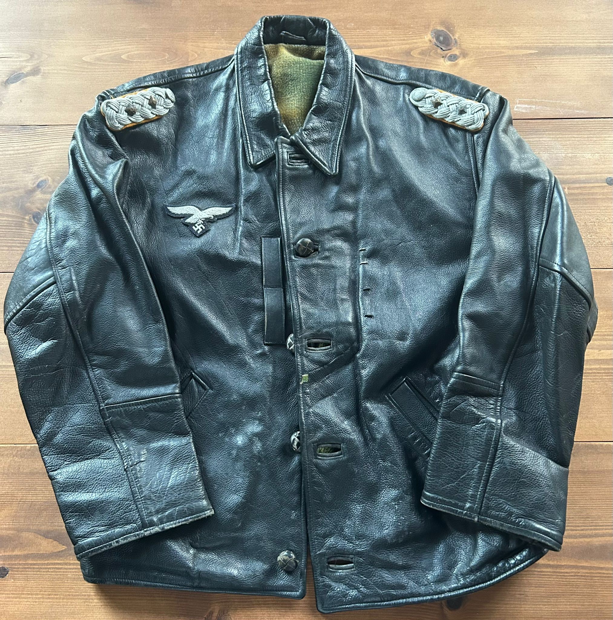 Leather jacket in the style of a World War II Luftwaffe Pilots jacket, label inside of jacket reads 1940 FL35–215–4 chest has a cloth Luftwaffe Eagle attached and fight obest tabs on shoulders.
