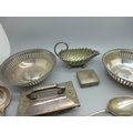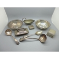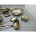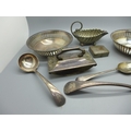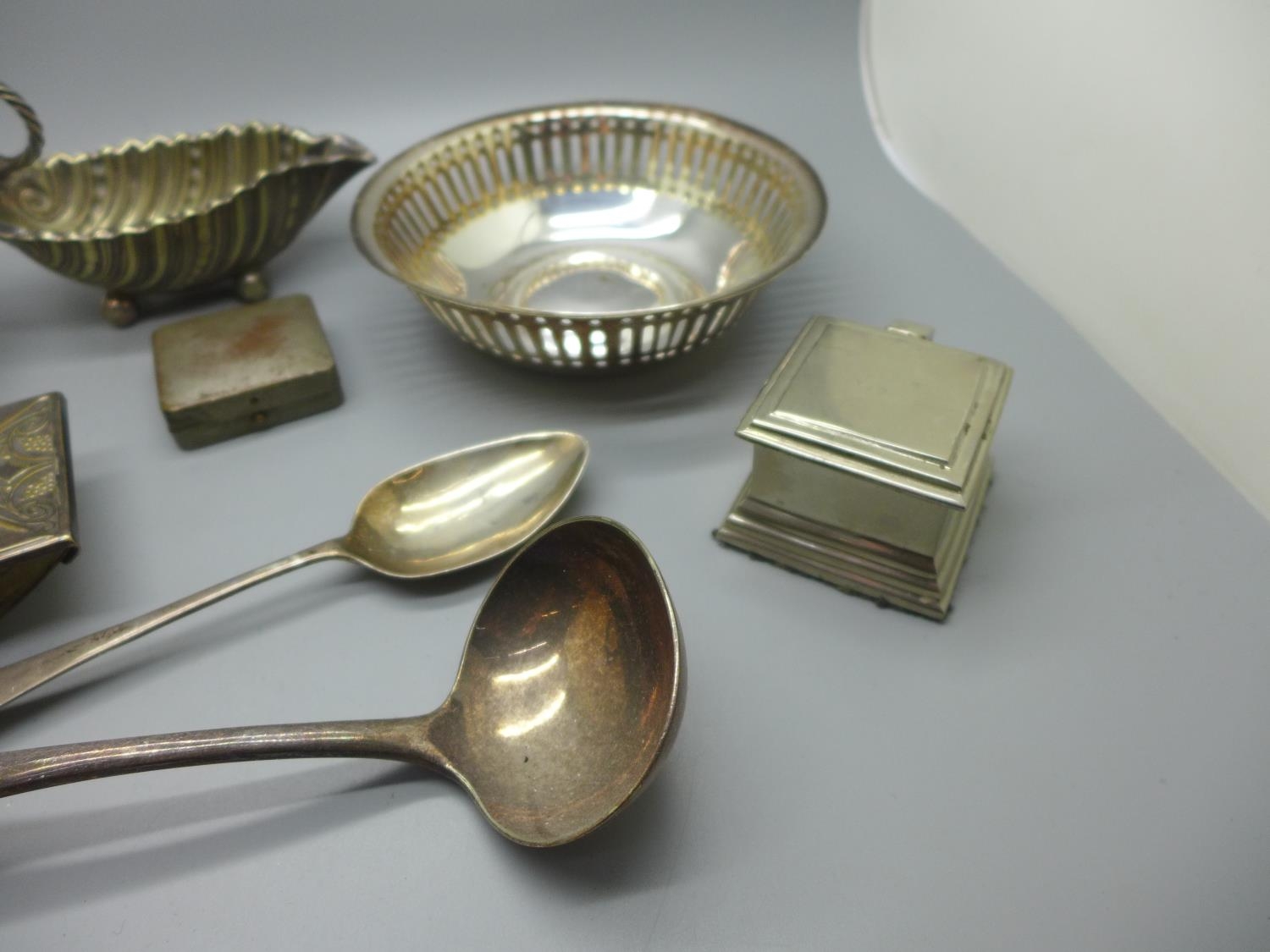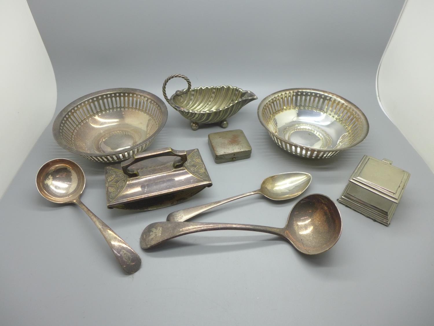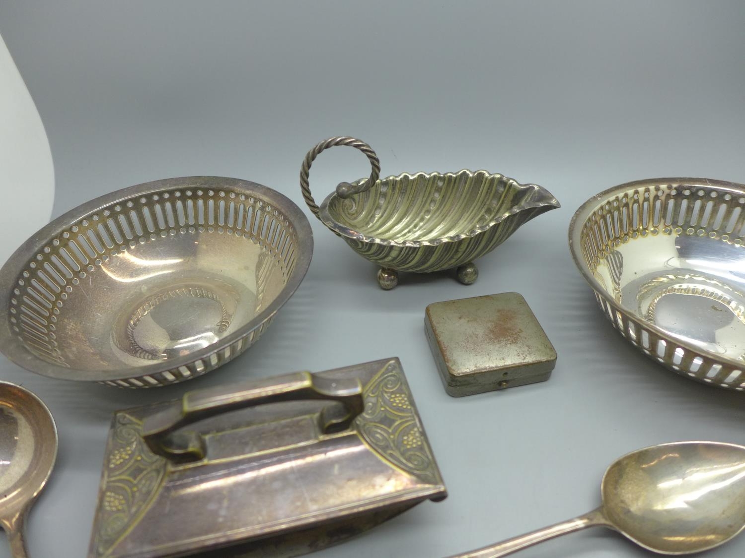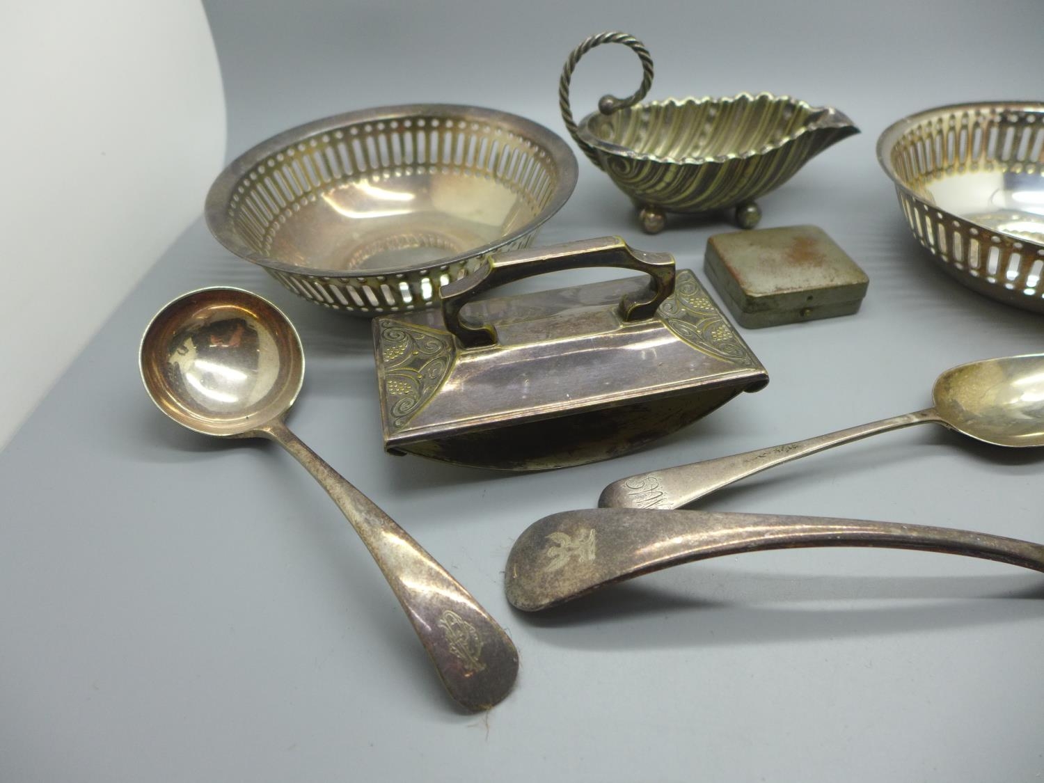 A Georgian silver spoon, 25g, silver plated items including a jug, two pierced dishes, etc.