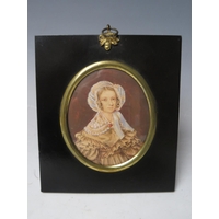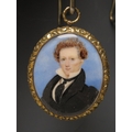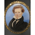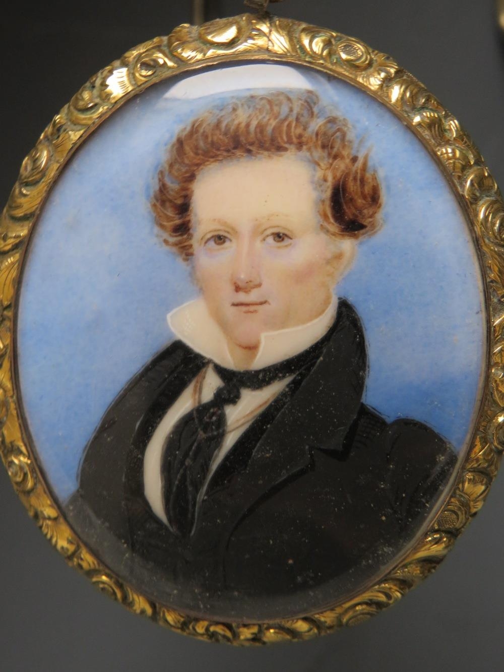 A 19TH CENTURY OVAL PORTRAIT MINIATURE OF A GEORGIAN GENTLEMAN, with black coat and tie, unsigned, in yellow metal frame (possibly 15ct), and glazed, 5 x 4 cm