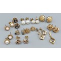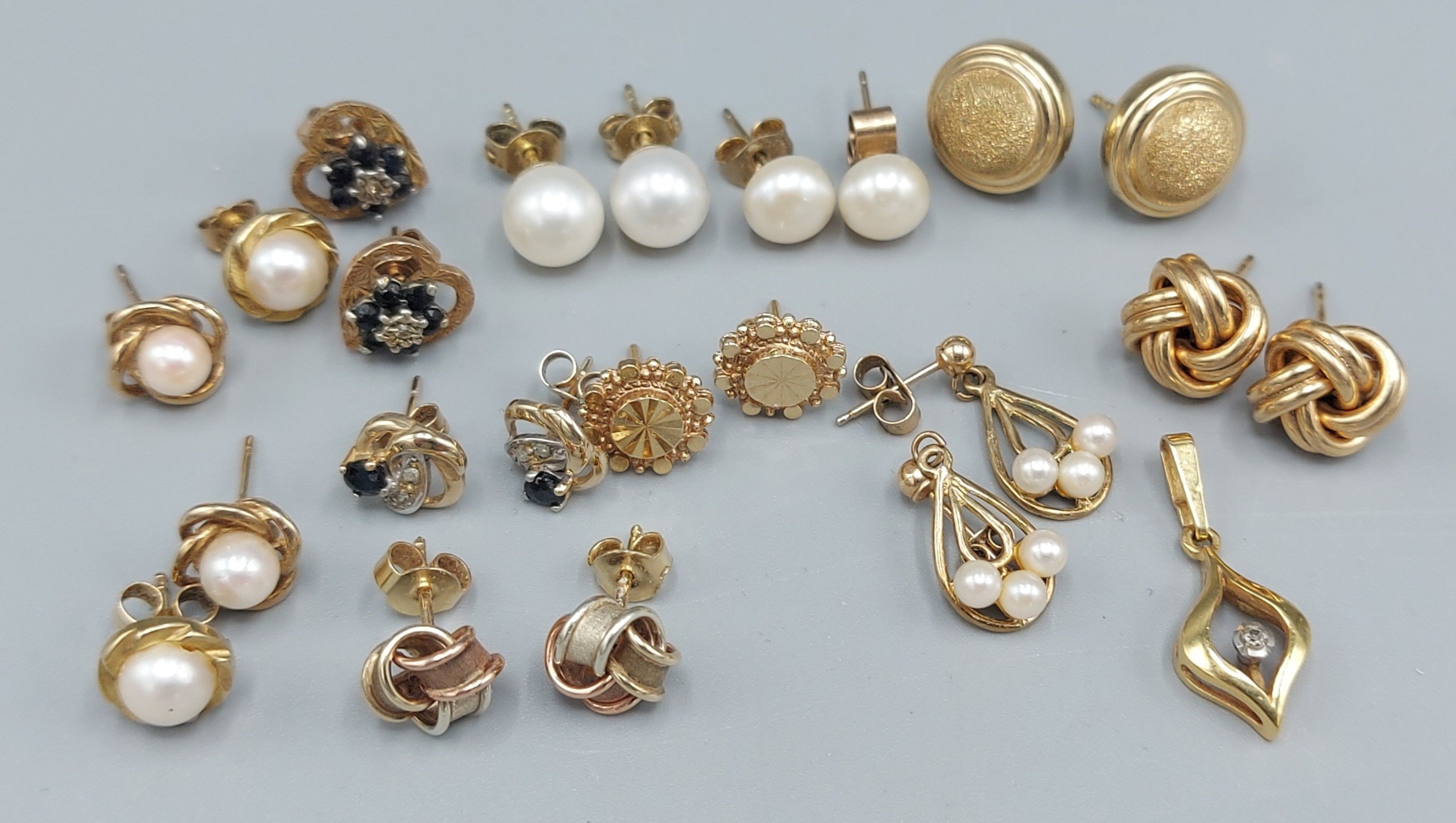 A collection of eleven pairs of 9ct gold ear studs, together with a 9ct gold pendant, 5gms