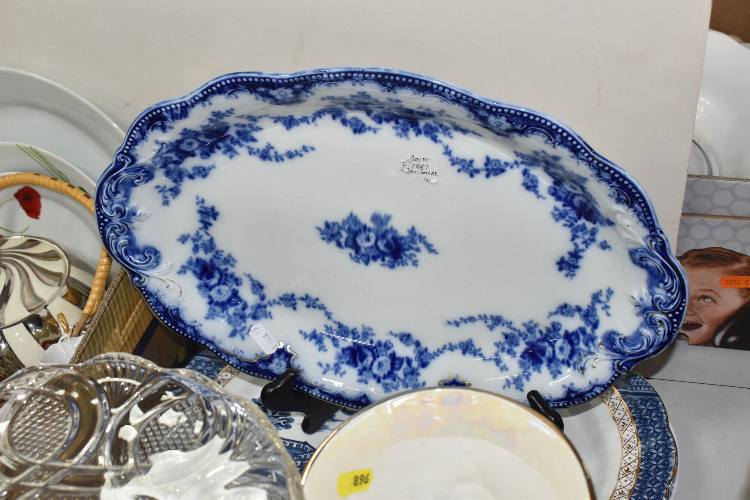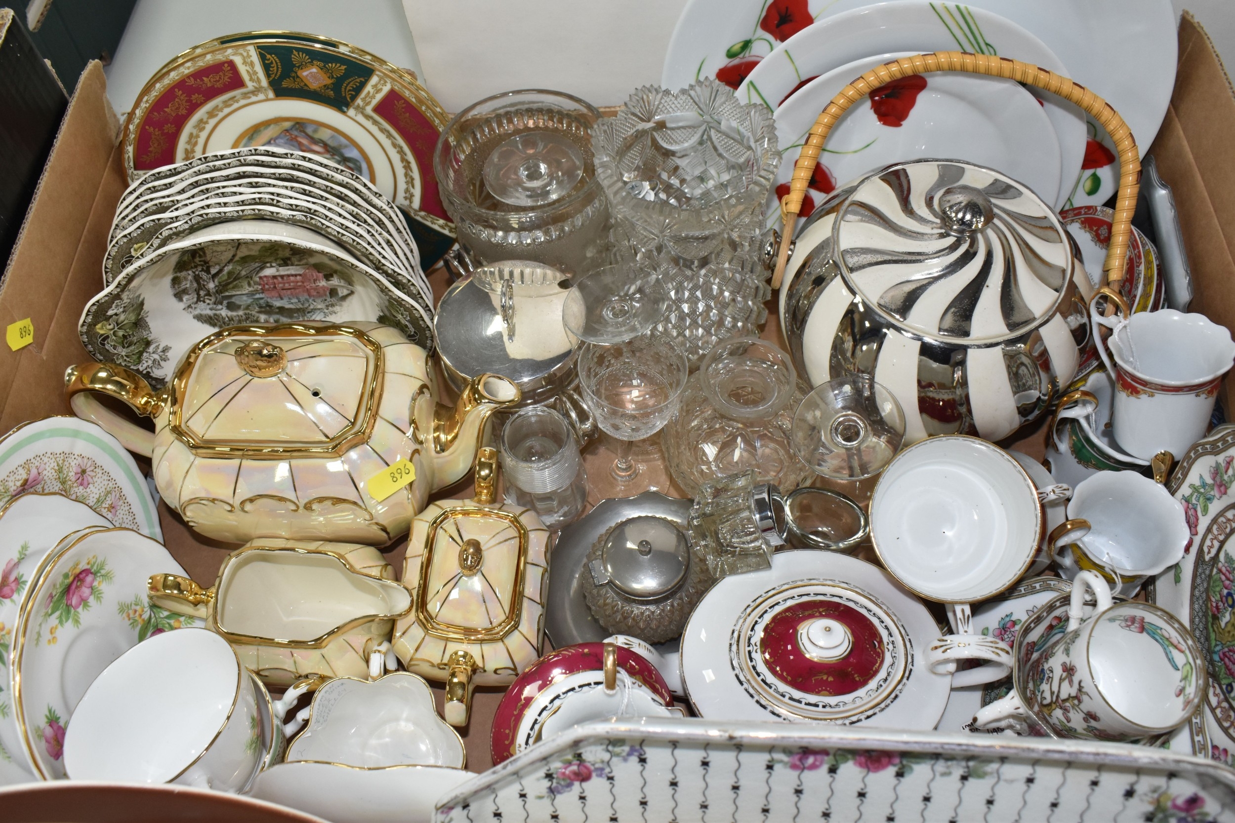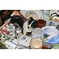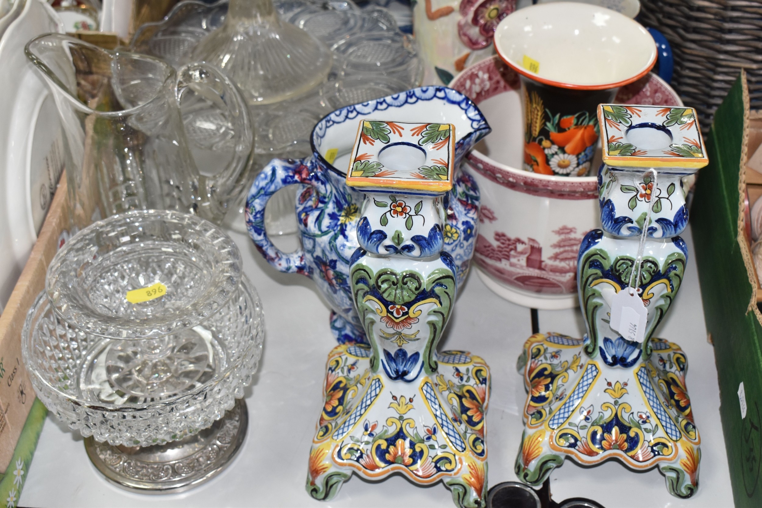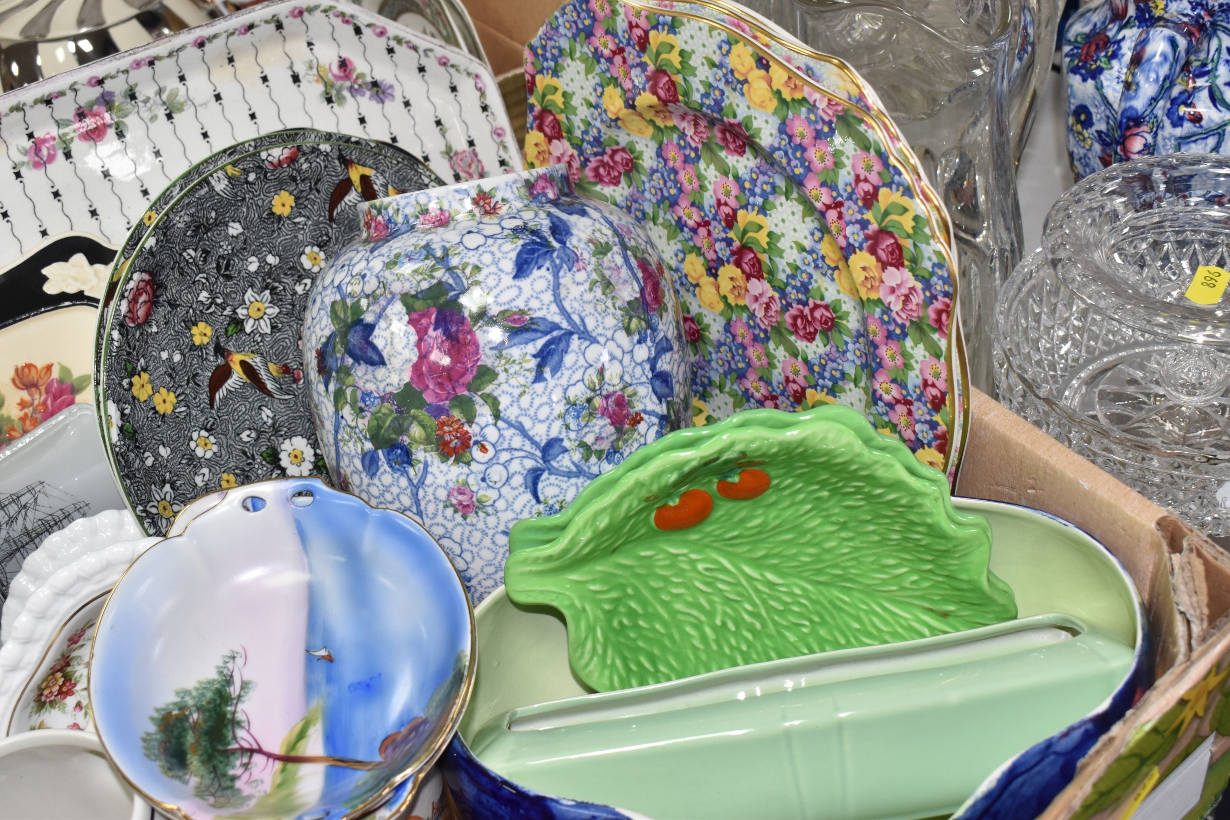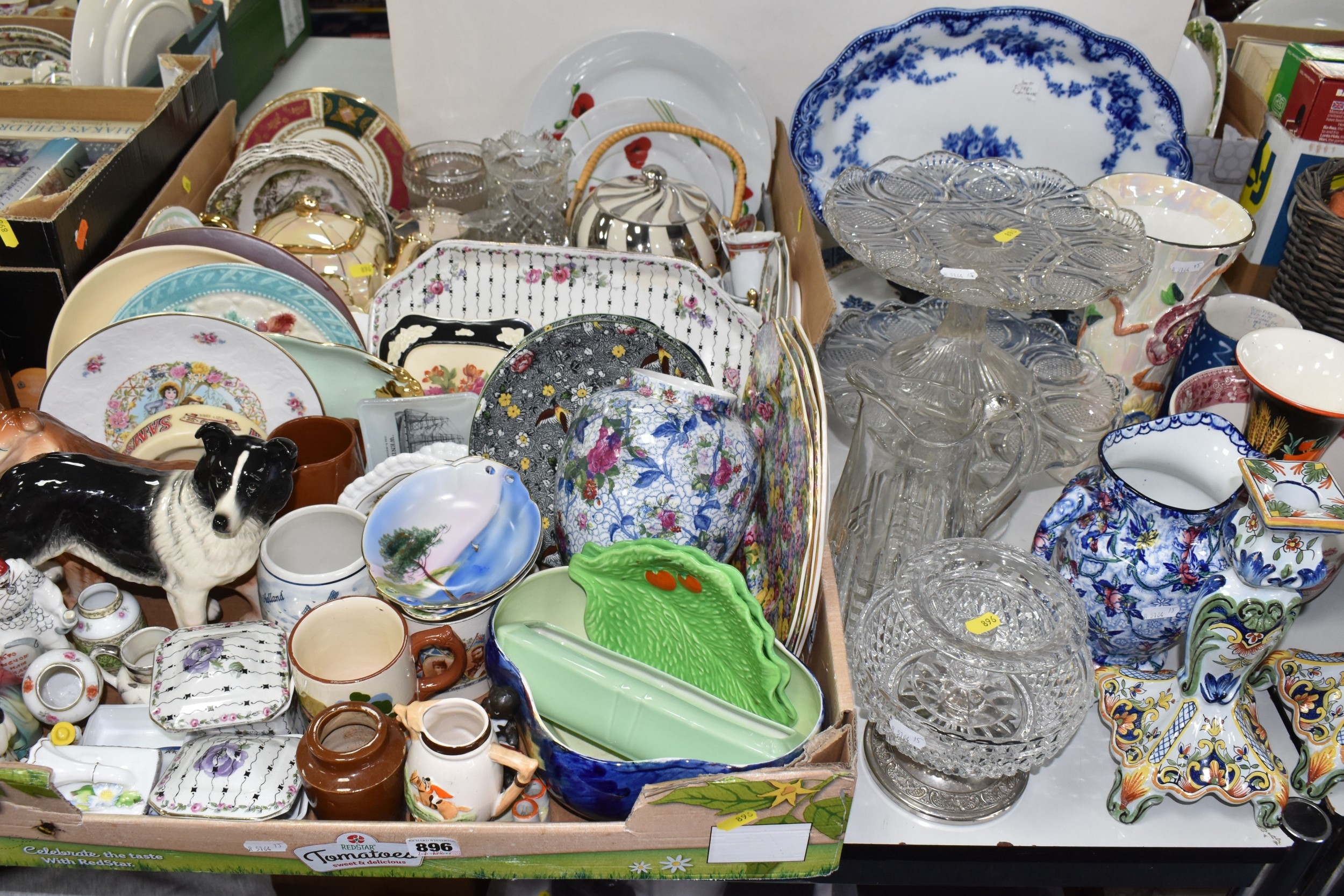 TWO BOXES AND LOOSE CERAMICS AND GLASS, to include large meat platters, tea and dinnerware, cake stands, vases, planters, candle sticks, etc. names include Coalport, Booths, Beswick Ware, Crown Devon, Arthur Wood, Maling, Royal Winton, Johnson Bros, etc. (2 boxes + loose), (sd/af)