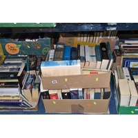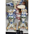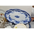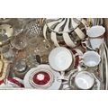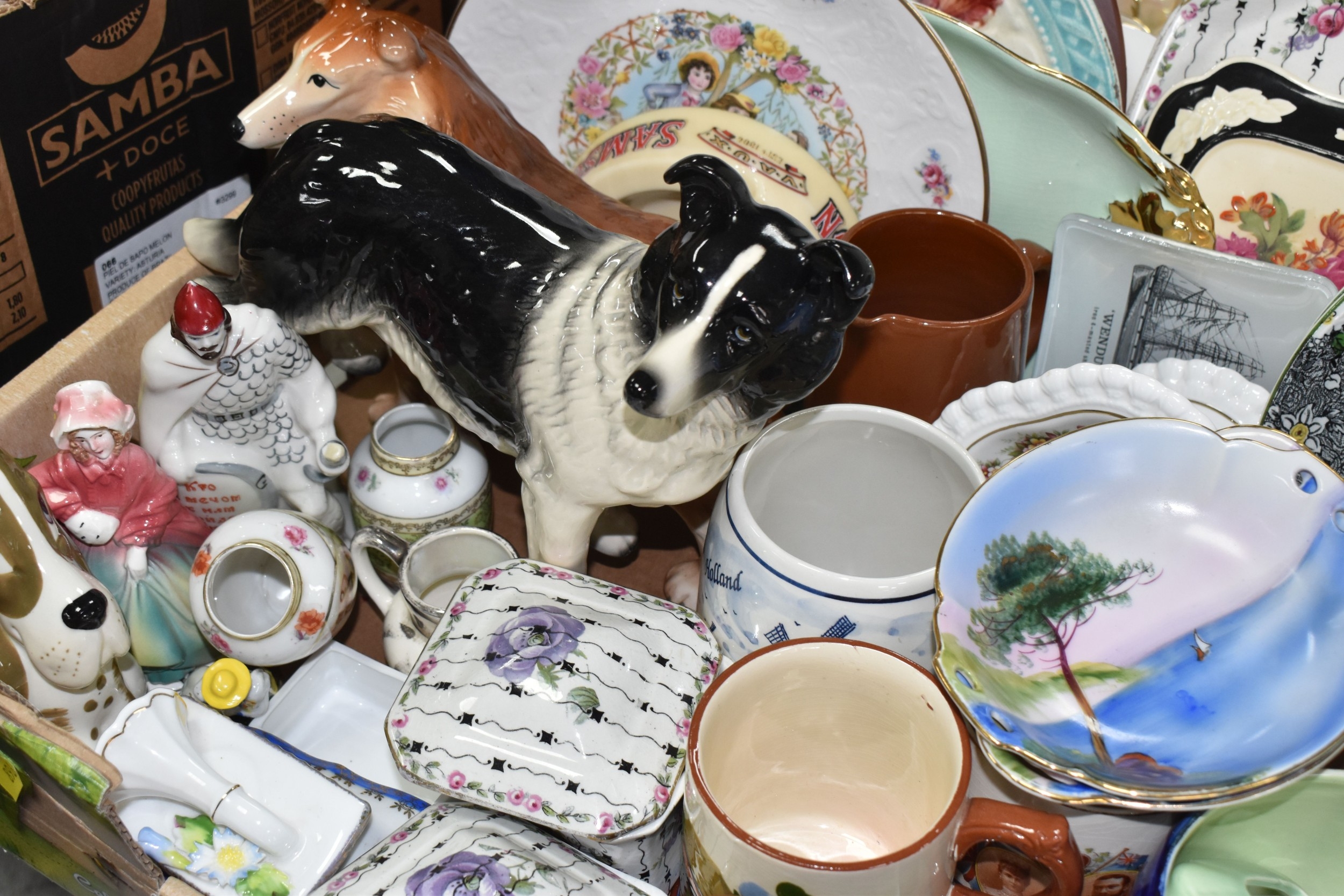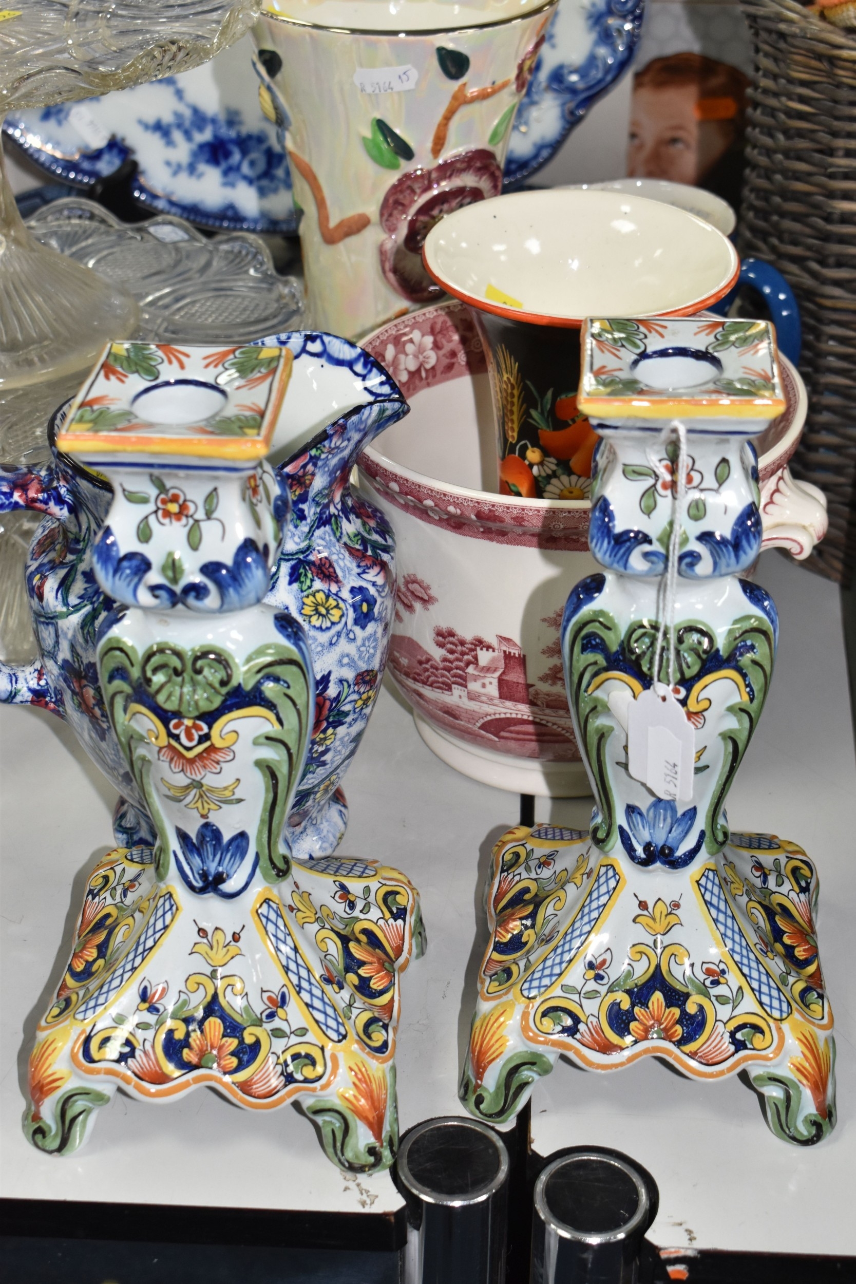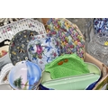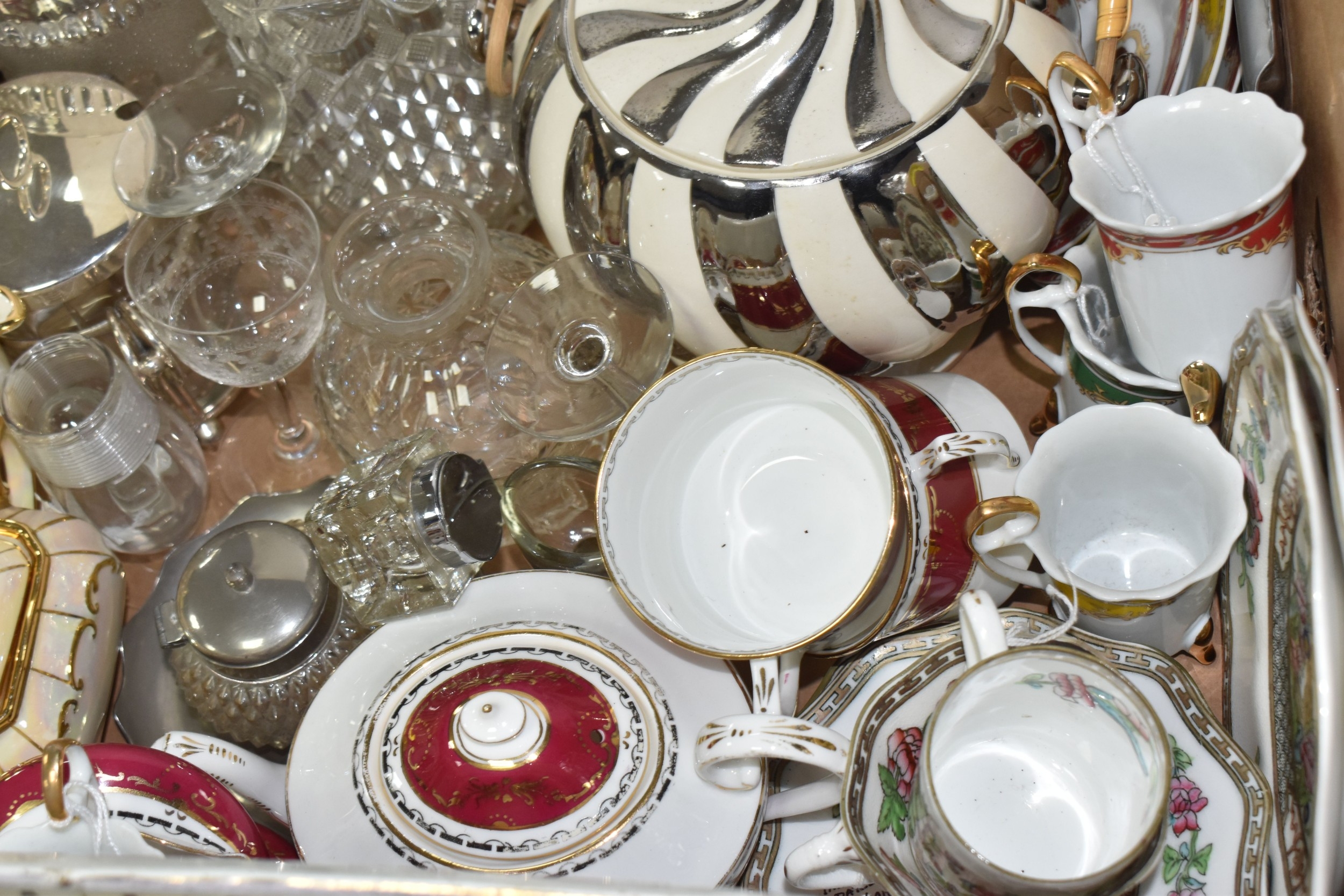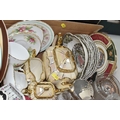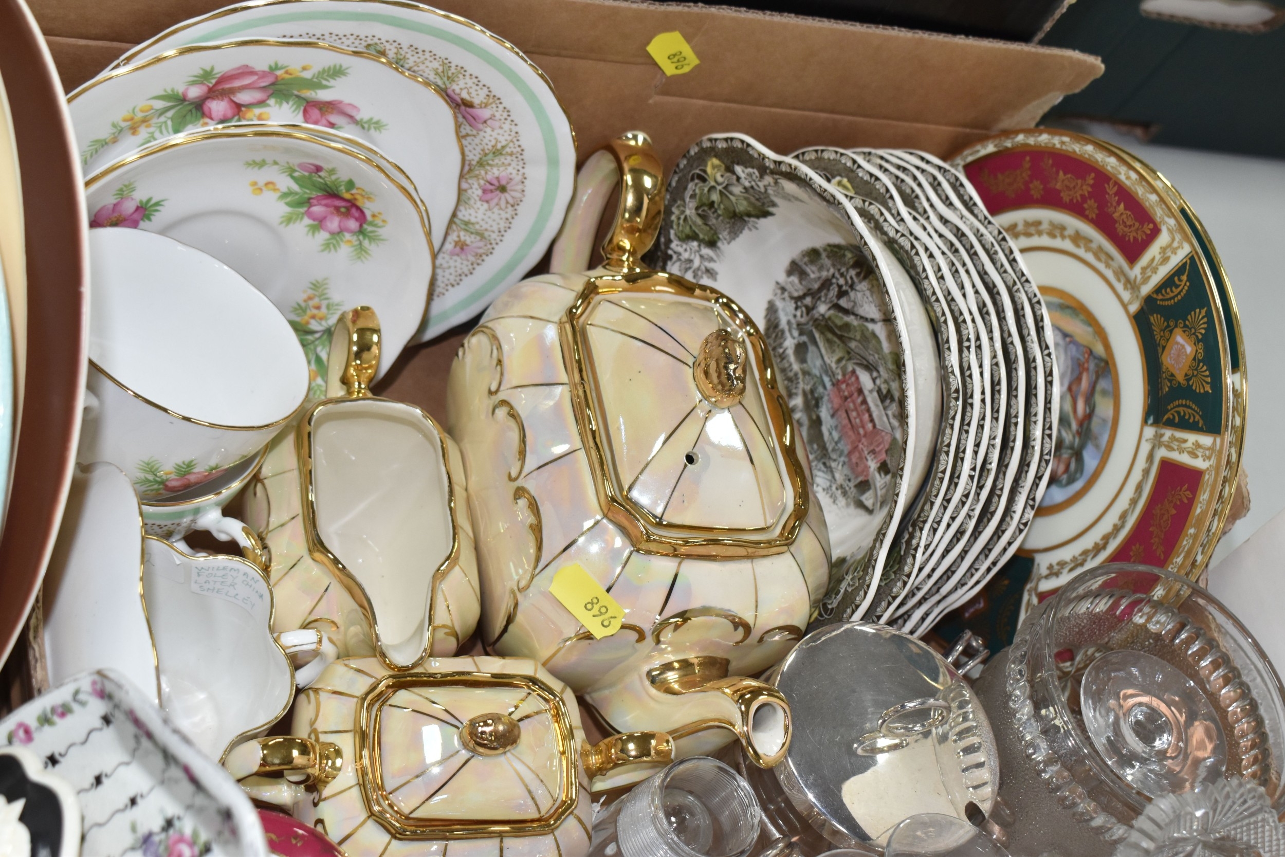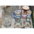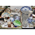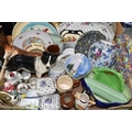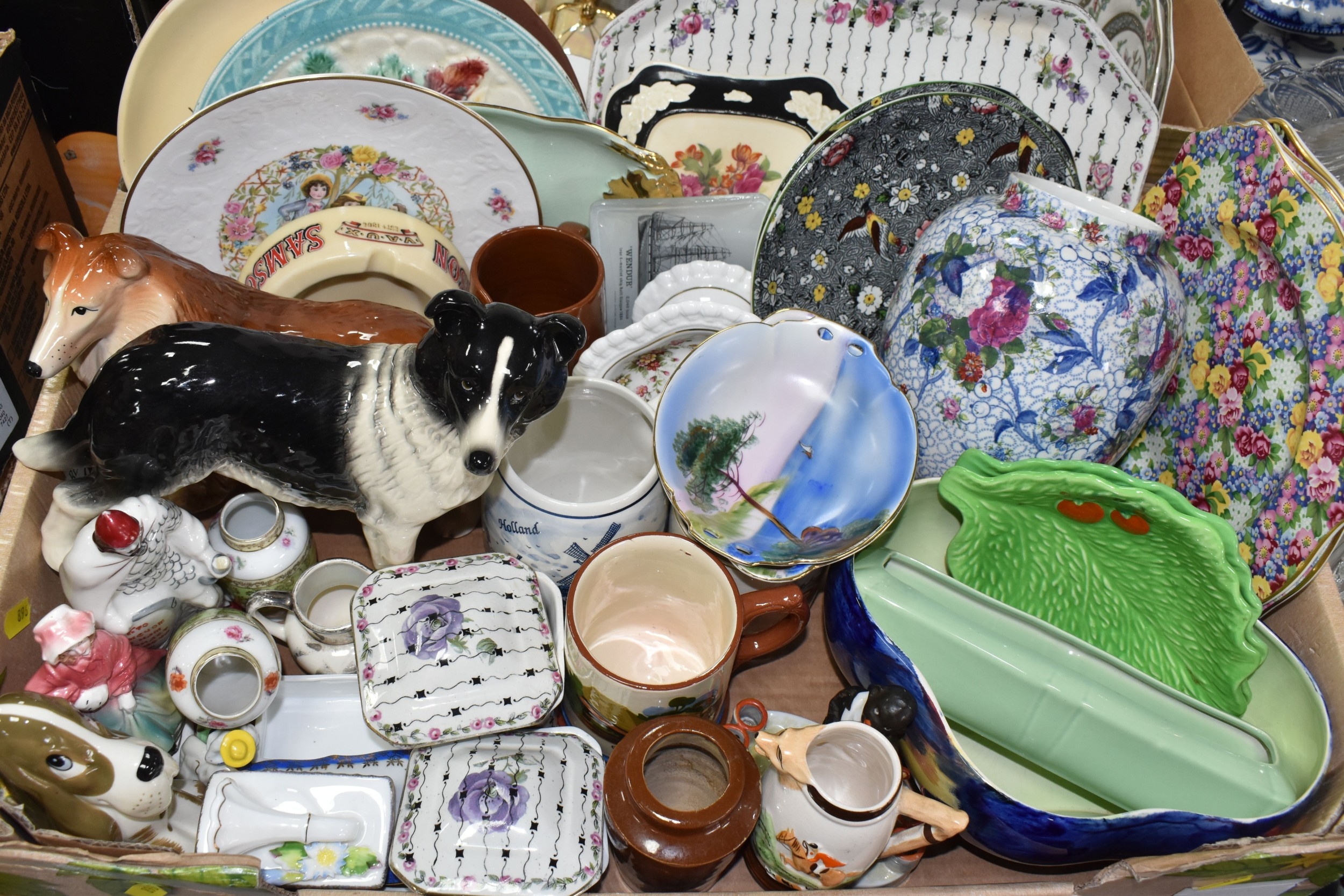 TWO BOXES AND LOOSE CERAMICS AND GLASS, to include large meat platters, tea and dinnerware, cake stands, vases, planters, candle sticks, etc. names include Coalport, Booths, Beswick Ware, Crown Devon, Arthur Wood, Maling, Royal Winton, Johnson Bros, etc. (2 boxes + loose), (sd/af)