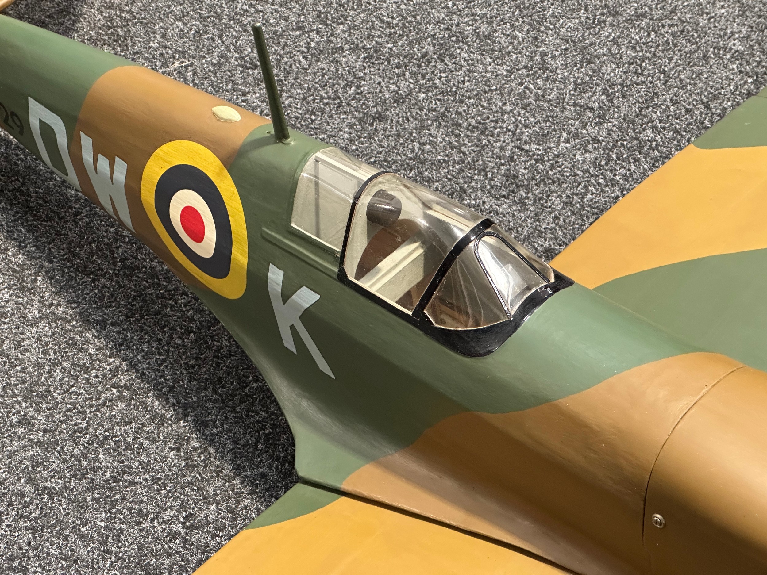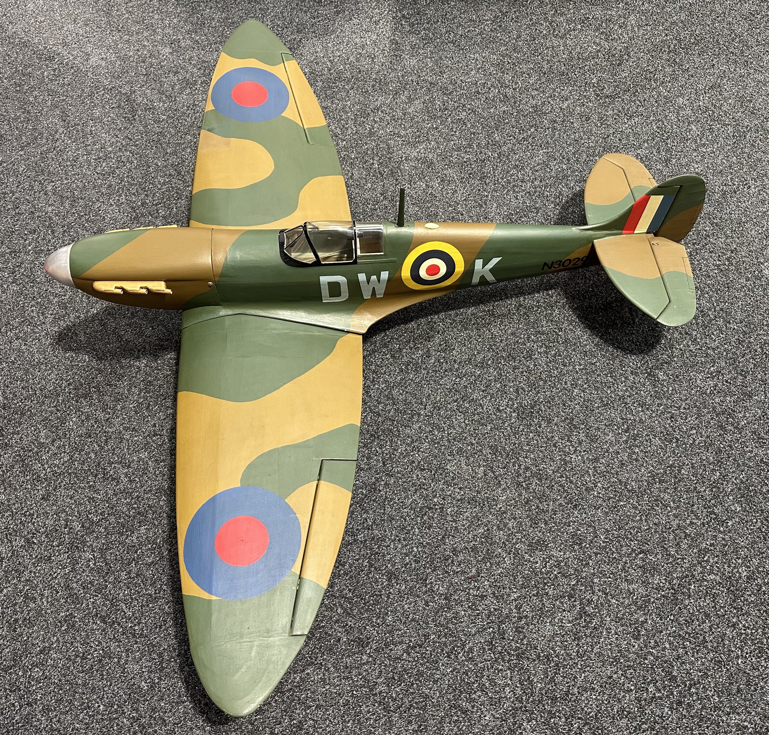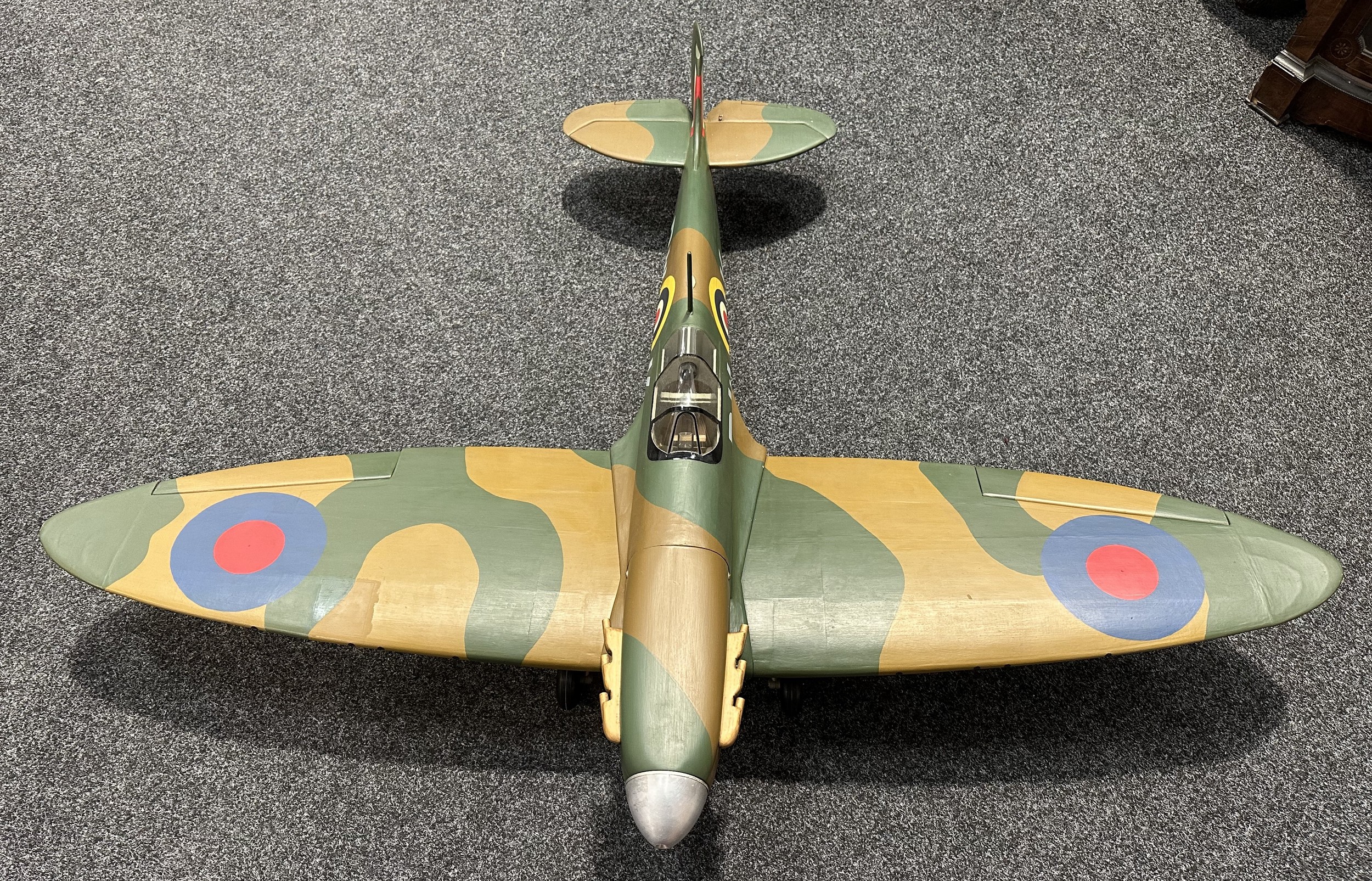 Large size 1/70th Scale Model Supermarine Spitfire. Wingspan 130cm overall length 164cm . Wooden construction. Designed to fly. Wings can be removed from the fuselage. Modeled with the under carriage down.