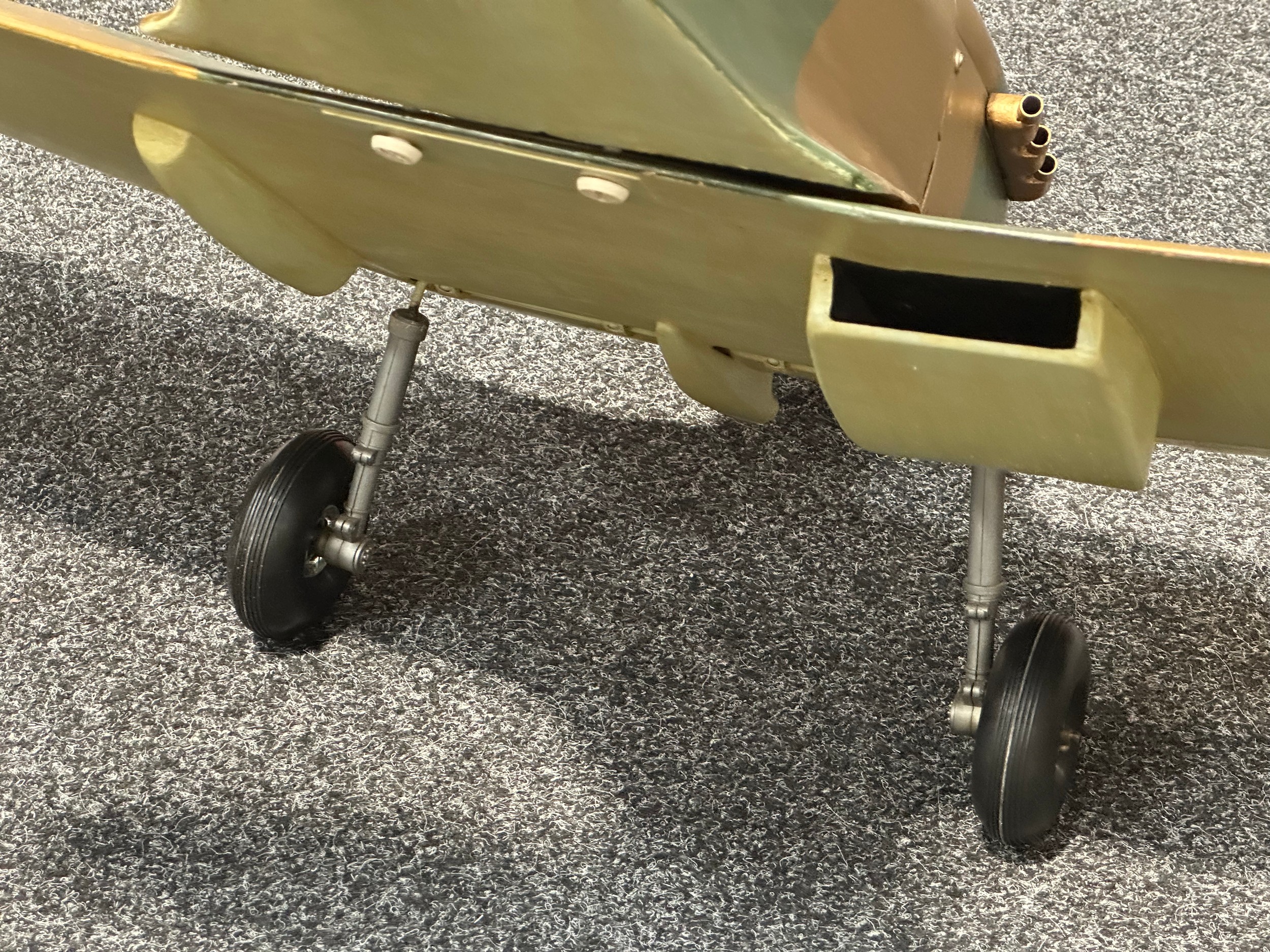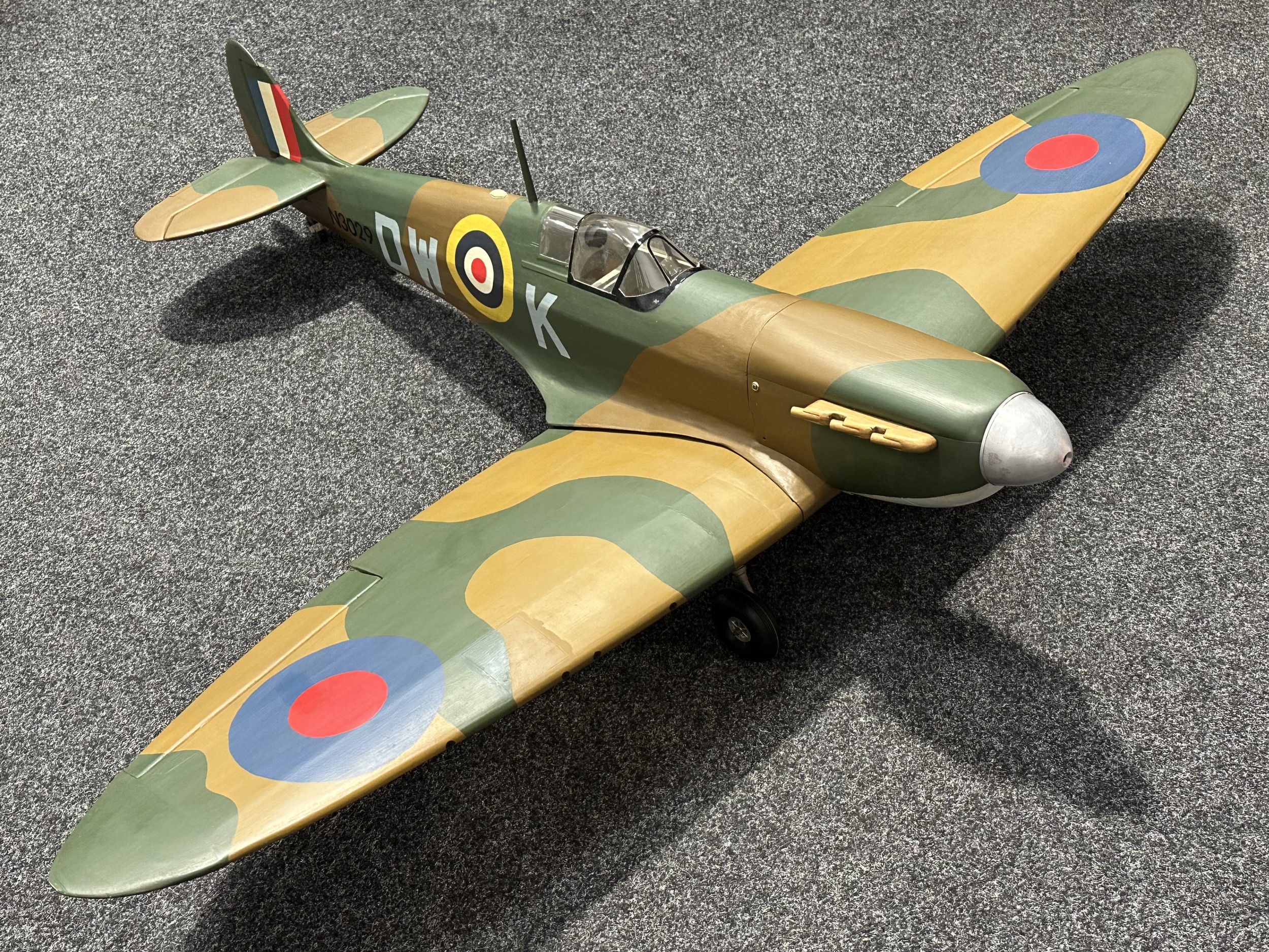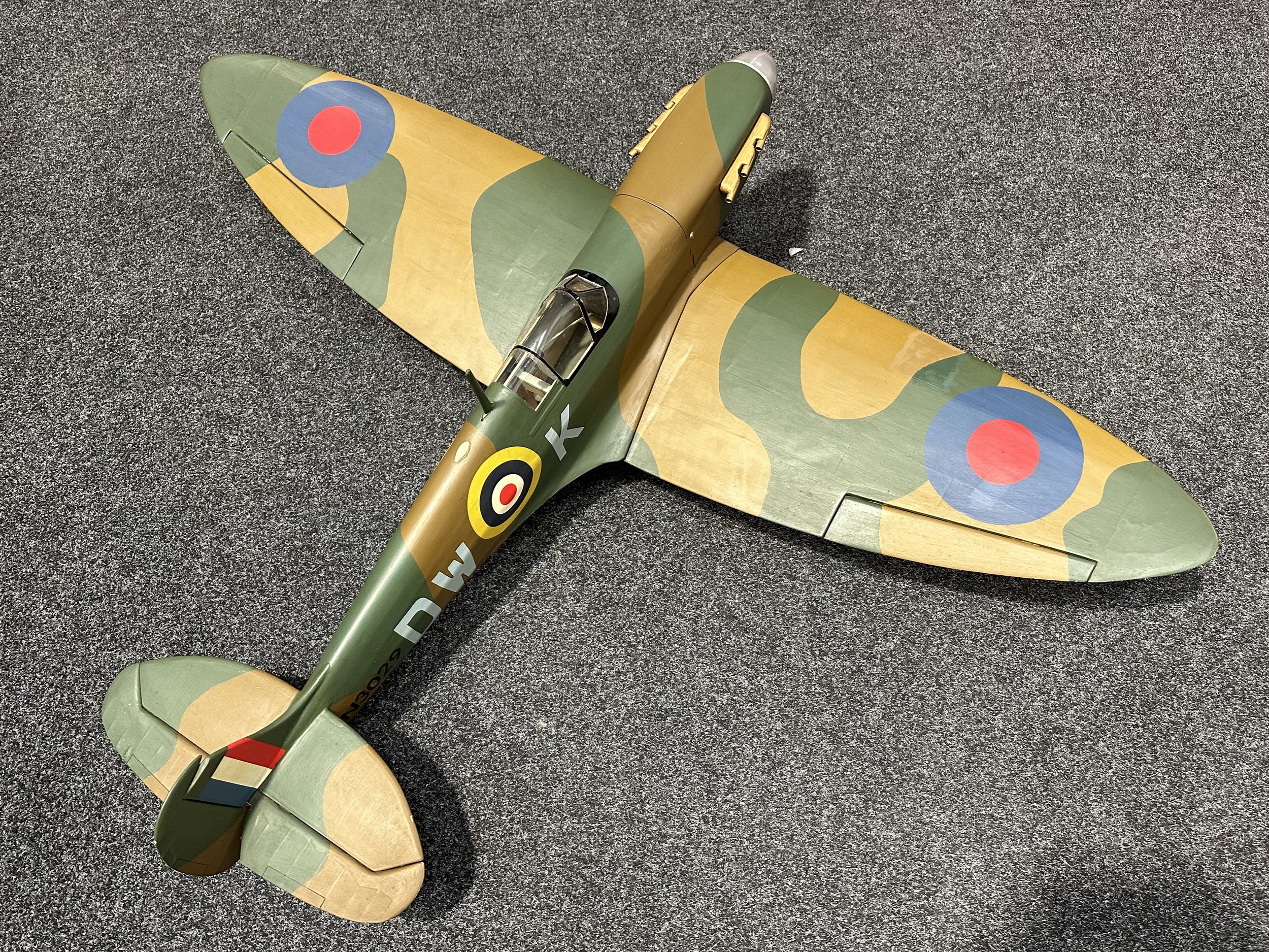 Large size 1/70th Scale Model Supermarine Spitfire. Wingspan 130cm overall length 164cm . Wooden construction. Designed to fly. Wings can be removed from the fuselage. Modeled with the under carriage down.