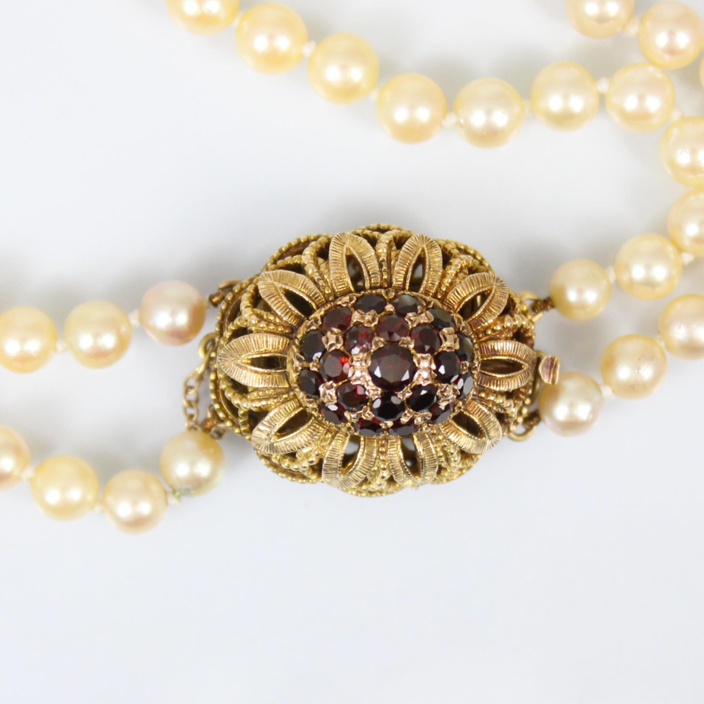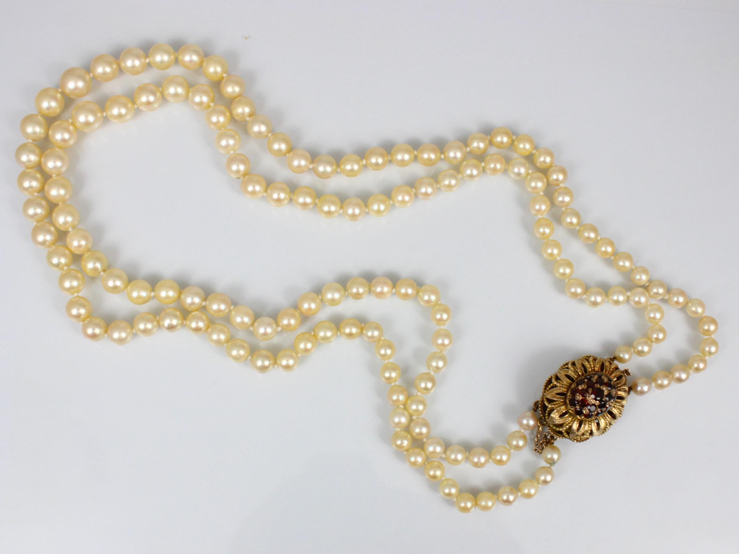 A late 20th century double strand of cultured pearls, of graduated spherical form, with garnet set 9ct clasp, of domed openwork form, 48cm long, 74gms, smallest pearls 5mm, largest 9mm