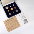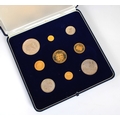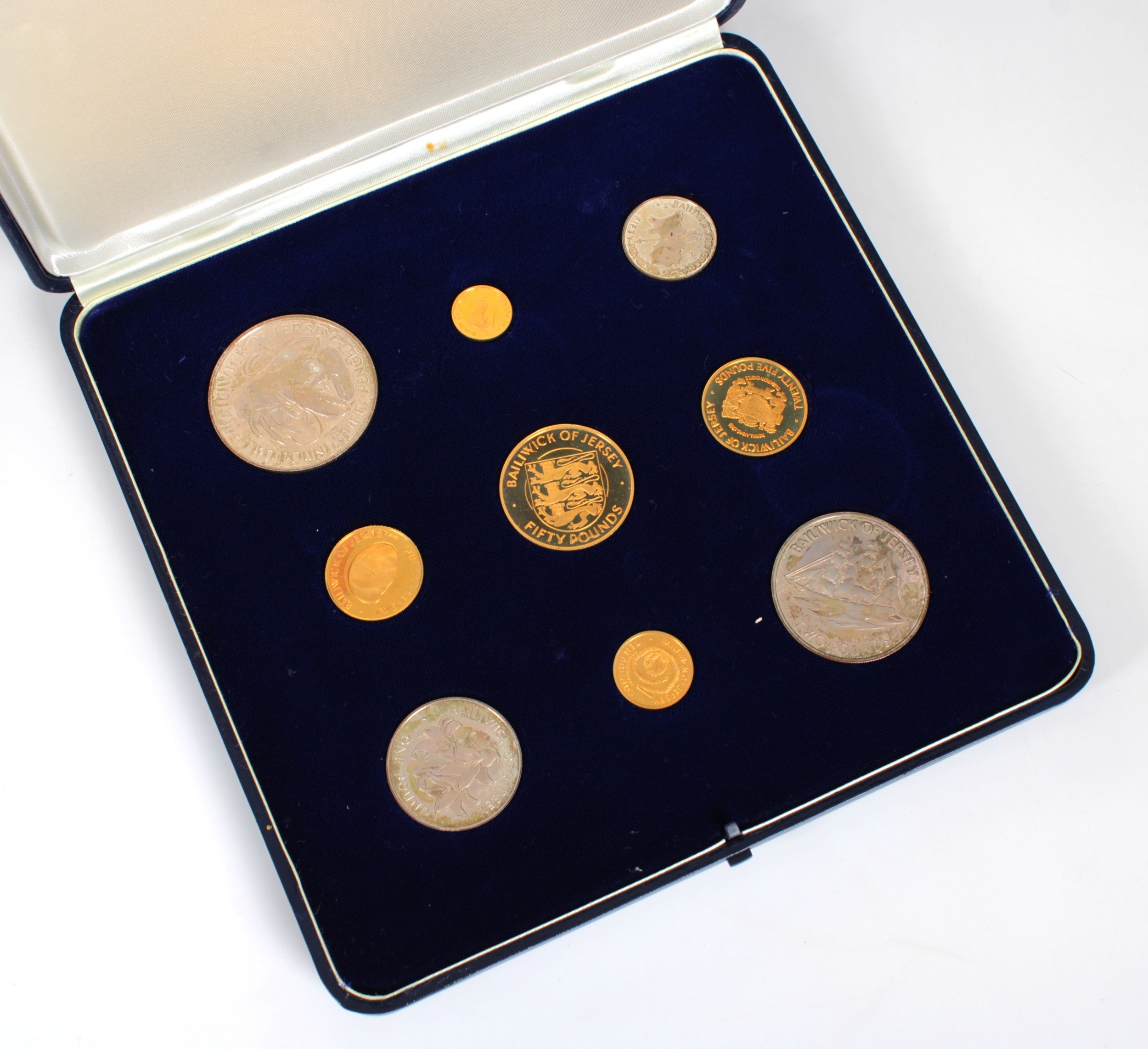 Jersey 1972 Royal Wedding Anniversary gold and silver proof cased coin set comprising 50, 25, 20, 10 and 5 gold coins, total weight of 22ct gold coins 51.05g, and 2.50, 2, 1 and 50p, total weight of silver coins 65g, in original fitted case with certificate.