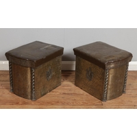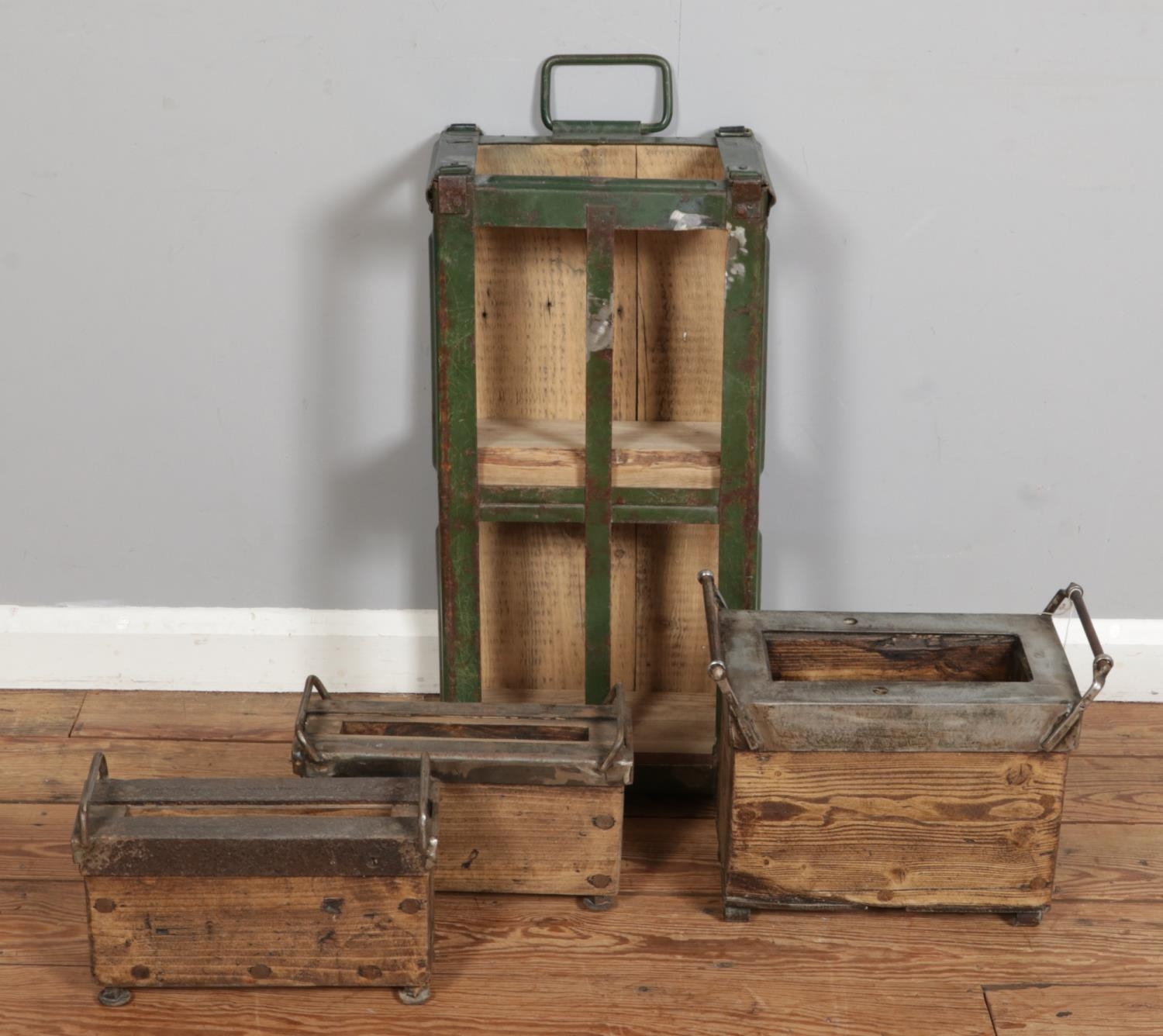 A military gear twin handled crate/box converted into a decorative shelving unit alongside three bespoke crafted garden planters modelled as carts. H66CM.