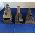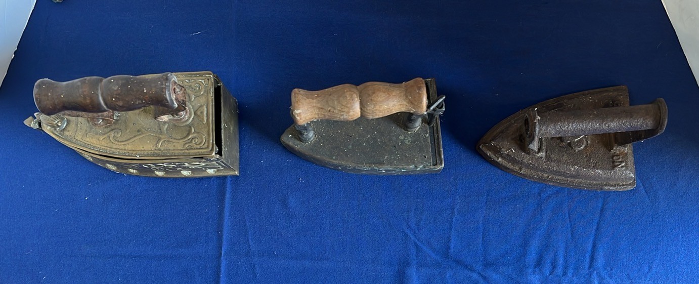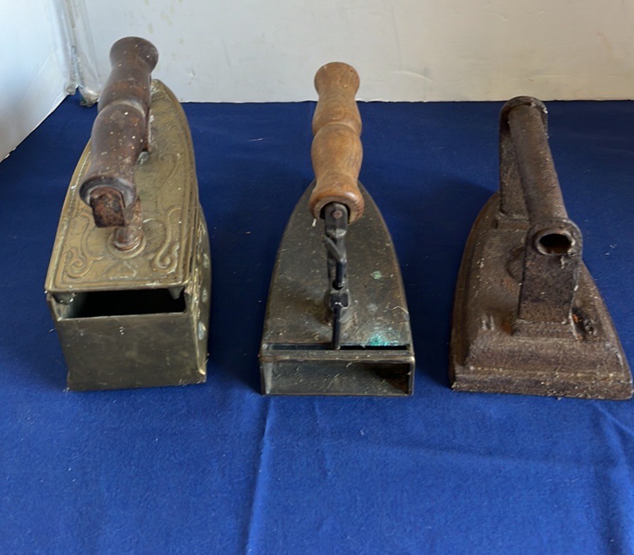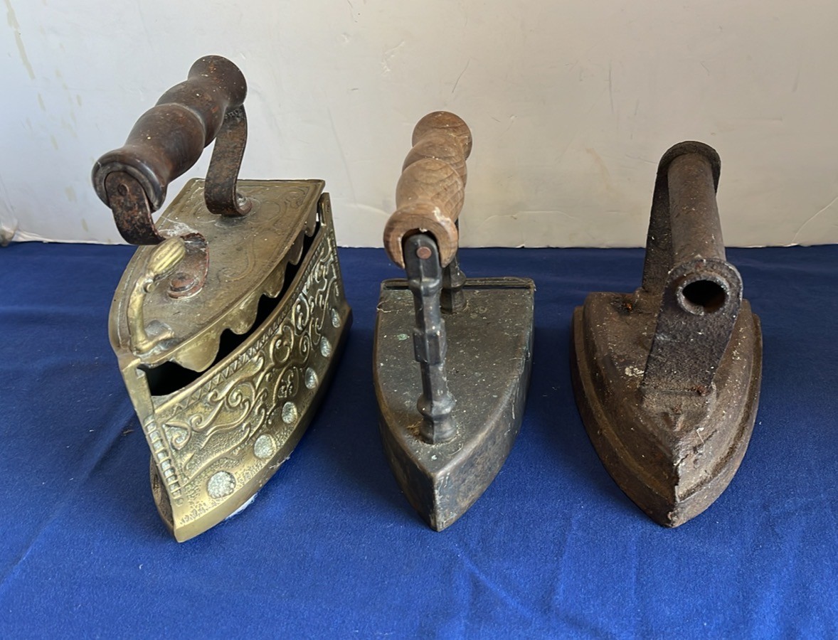 SELECTION OF BRASS AND METAL FLAT IRONS