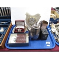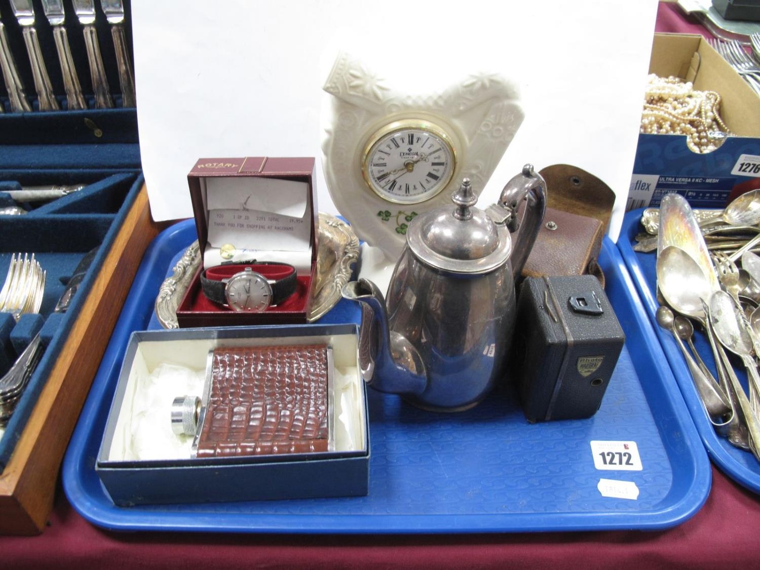 A 1930's Zeiss Ikon Baby Box Tengor Camera, whiskey flask, Rotary watch, Donegal Parian ware table clock plated tea pot etc:- One Tray.