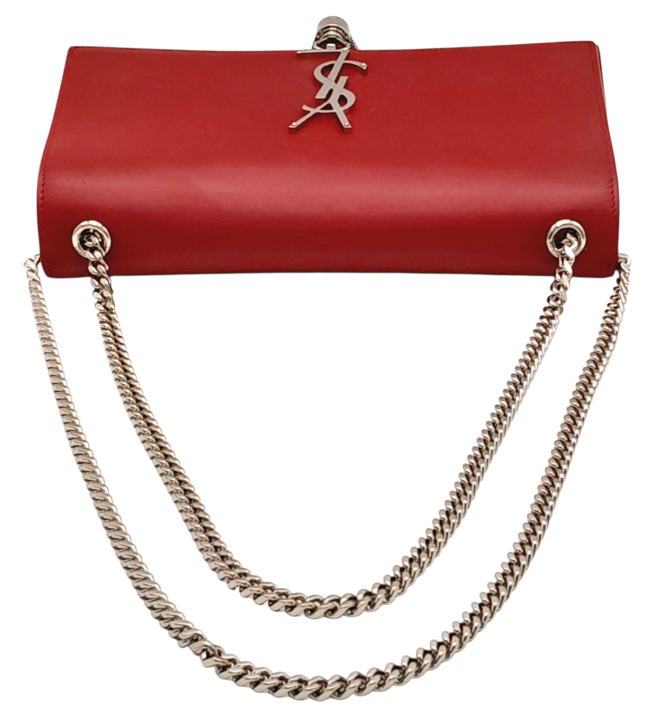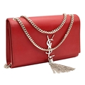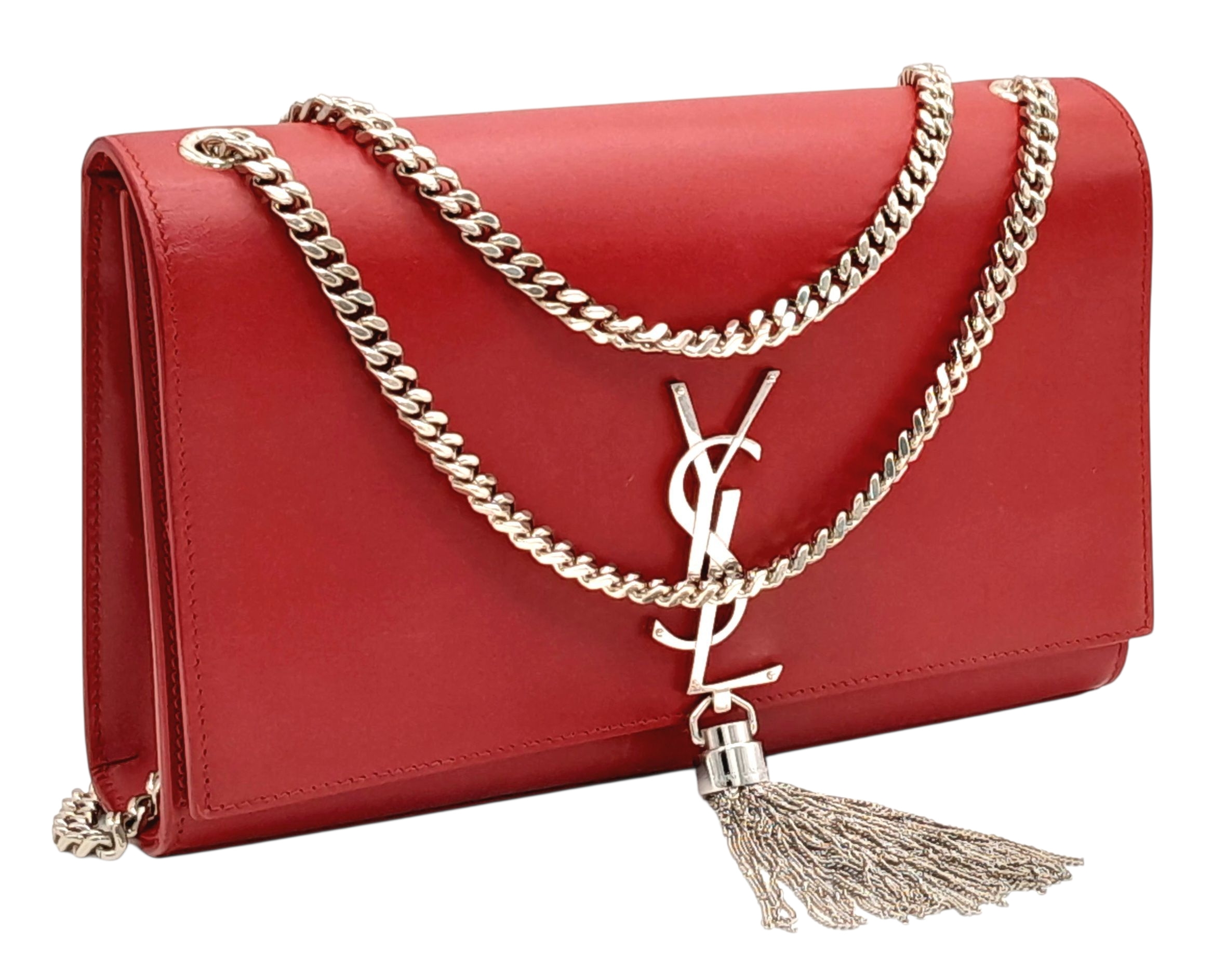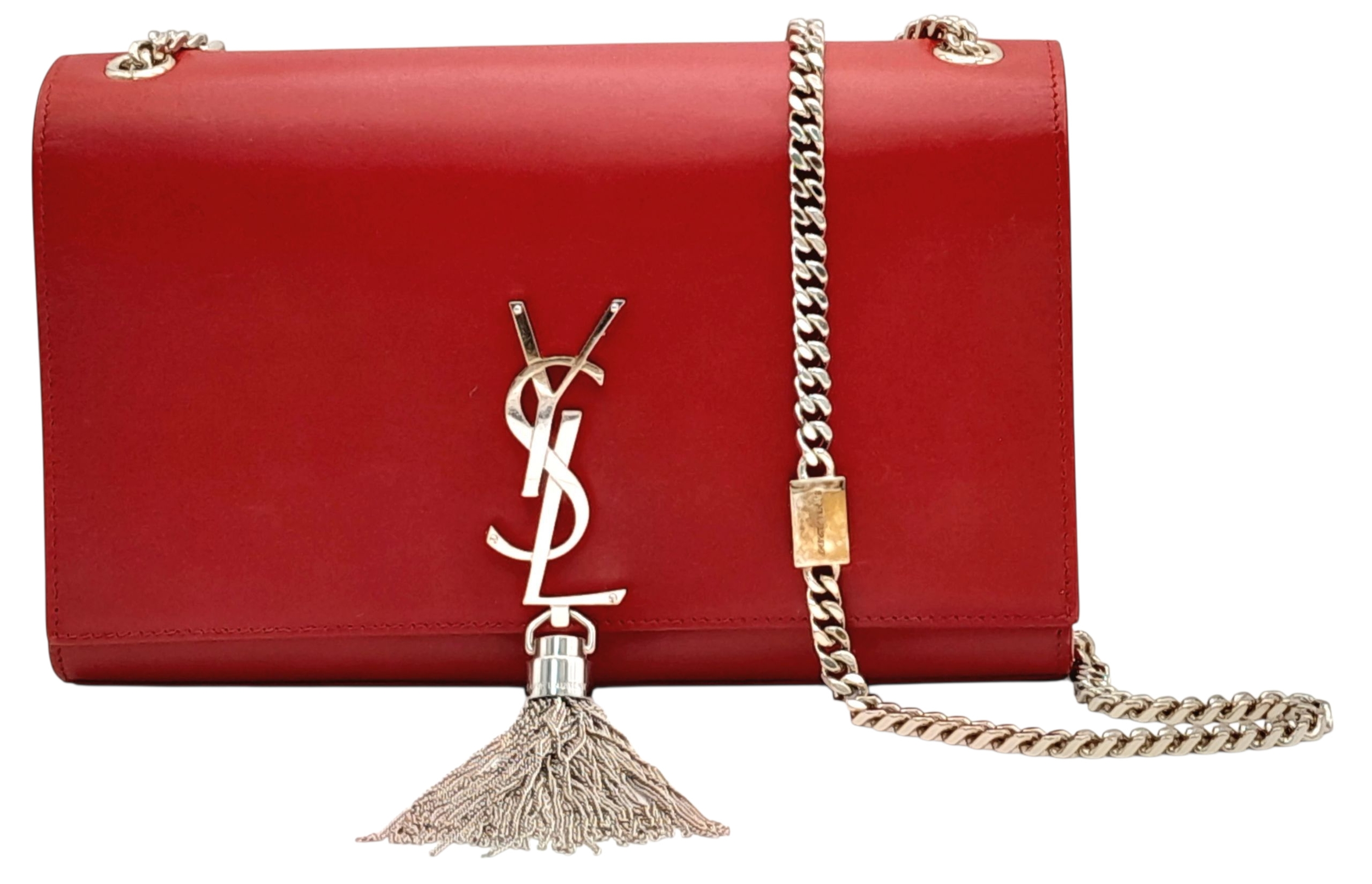 A Saint Laurent Ruby Red Classic Kate Tassel Shoulder Bag. Leather exterior with silver-toned hardware, the iconic YSL logo, chain strap and magnetic closure. Red textile interior with an open side pocket. Comes with dust cover. Approximately 24cm length x 15cm height. Some scuffs and scratches to exterior - please see photos for conditions or request a condition report. . REF: STK024866