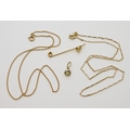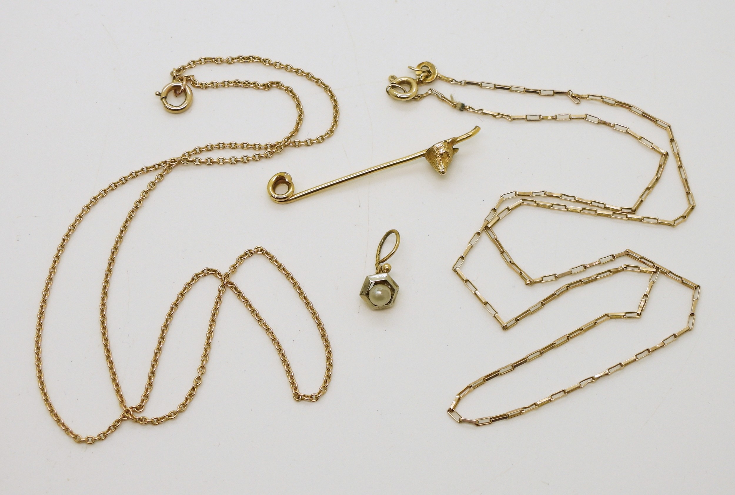 Two 9ct gold chains, lengths 41cm, 42cm, a yellow metal partial fox pin and single earring made into a pendant, weight all together 5.2gms