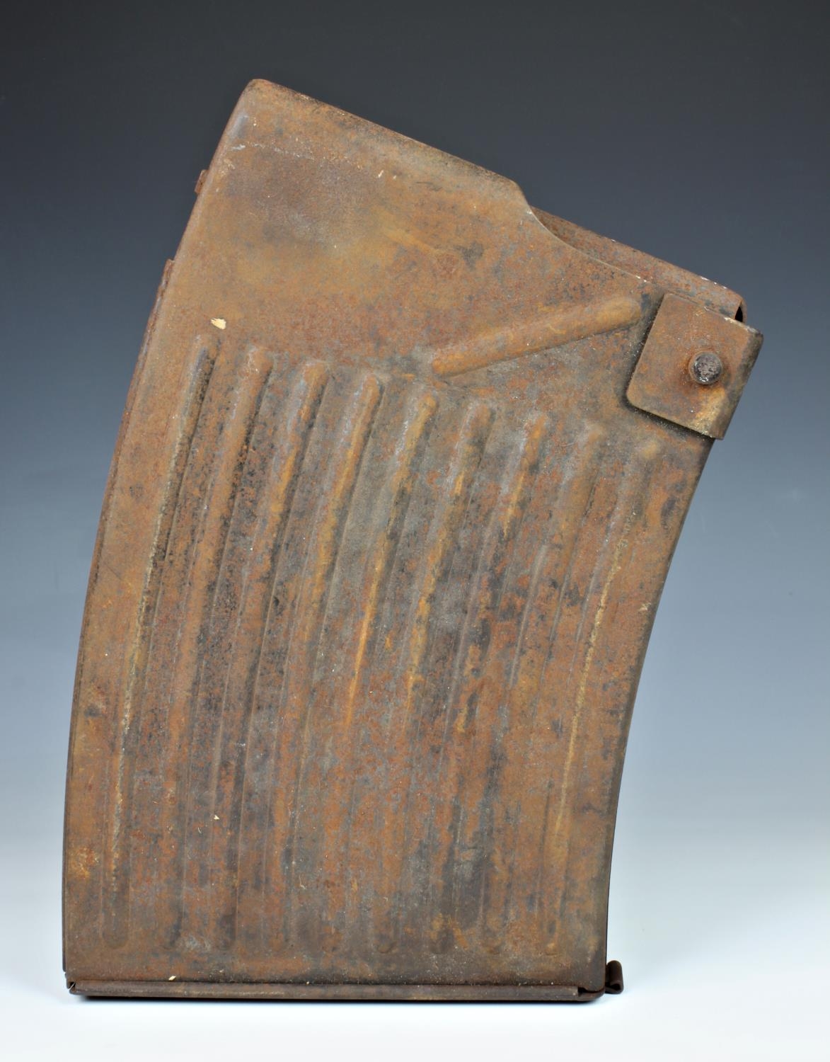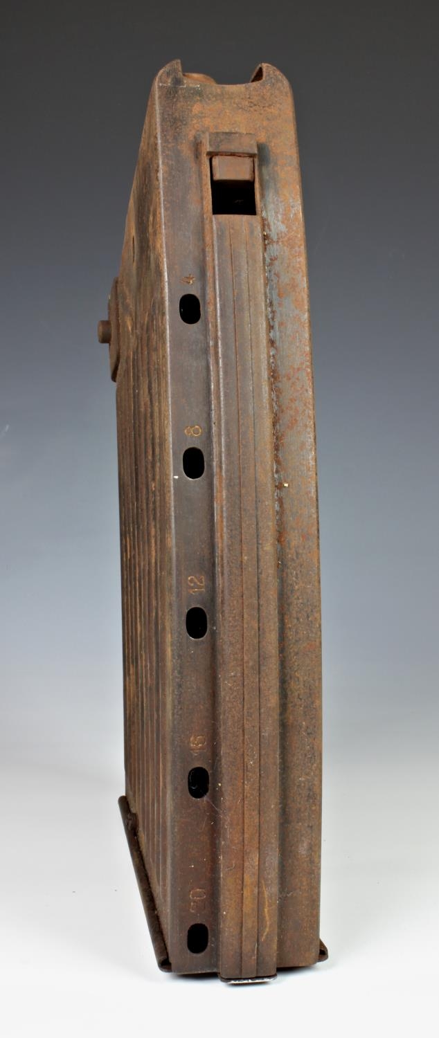 Guernsey German Occupation interest - 2cm. Flak 38 anti aircraft gun magazine, having pierced oval peep holes to the sides numbered 4,8,12,16, 20, for purpose of viewing how many bullets used, 14in. (35.5cm.) at widest.