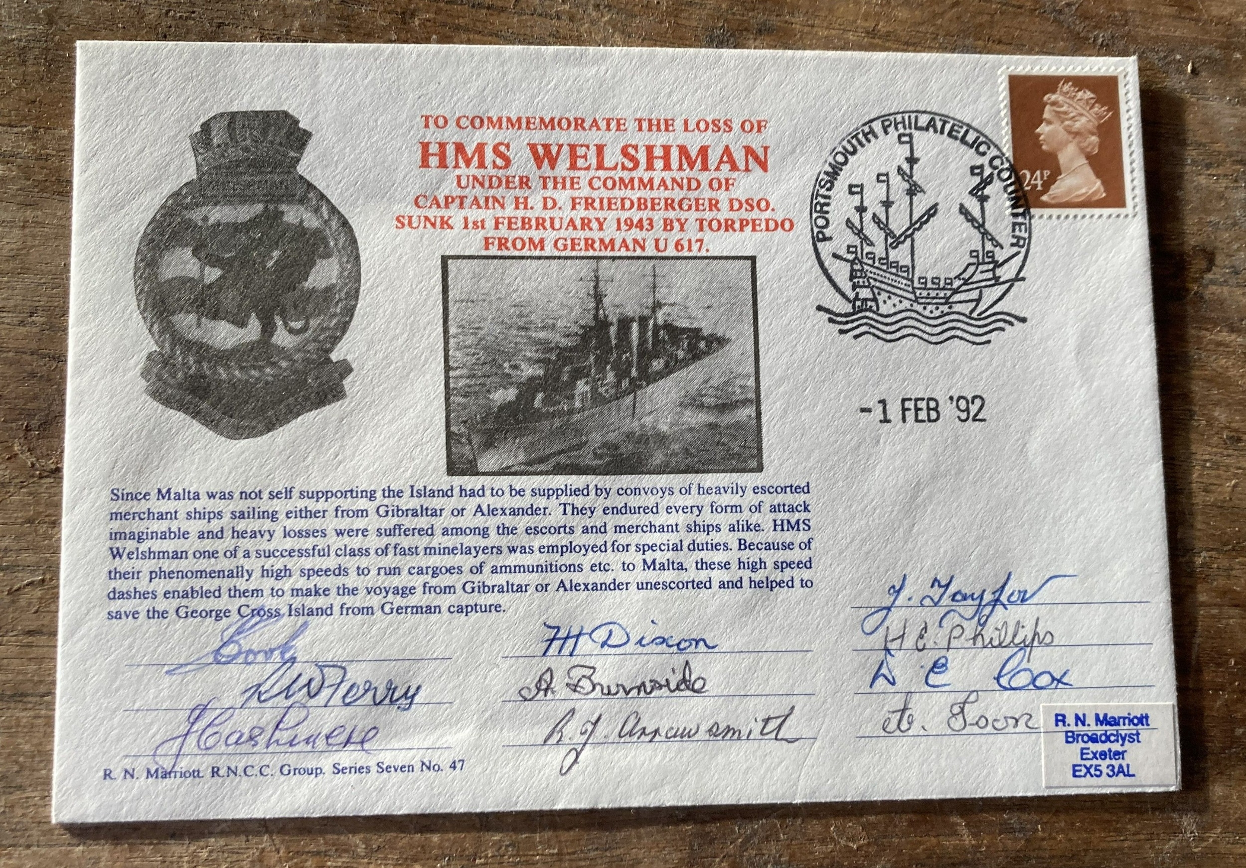 WW2 10 veterans signed Royal Navy cover 49th anniv of the Loss of HMS Welshman under the command of Capt HD Friedberger Sunk 1 Feb 1943 by German U 617 torpedo signed by 10 - Burnside, Cook, Phillips, Taylor, Dixon + 5 Navy WW2 FDC. Single Vendor collection. Good condition. We combine postage on multiple winning lots and can ship worldwide. UK postage from £5.99, EU from £7.99, Rest of World from £9.99.