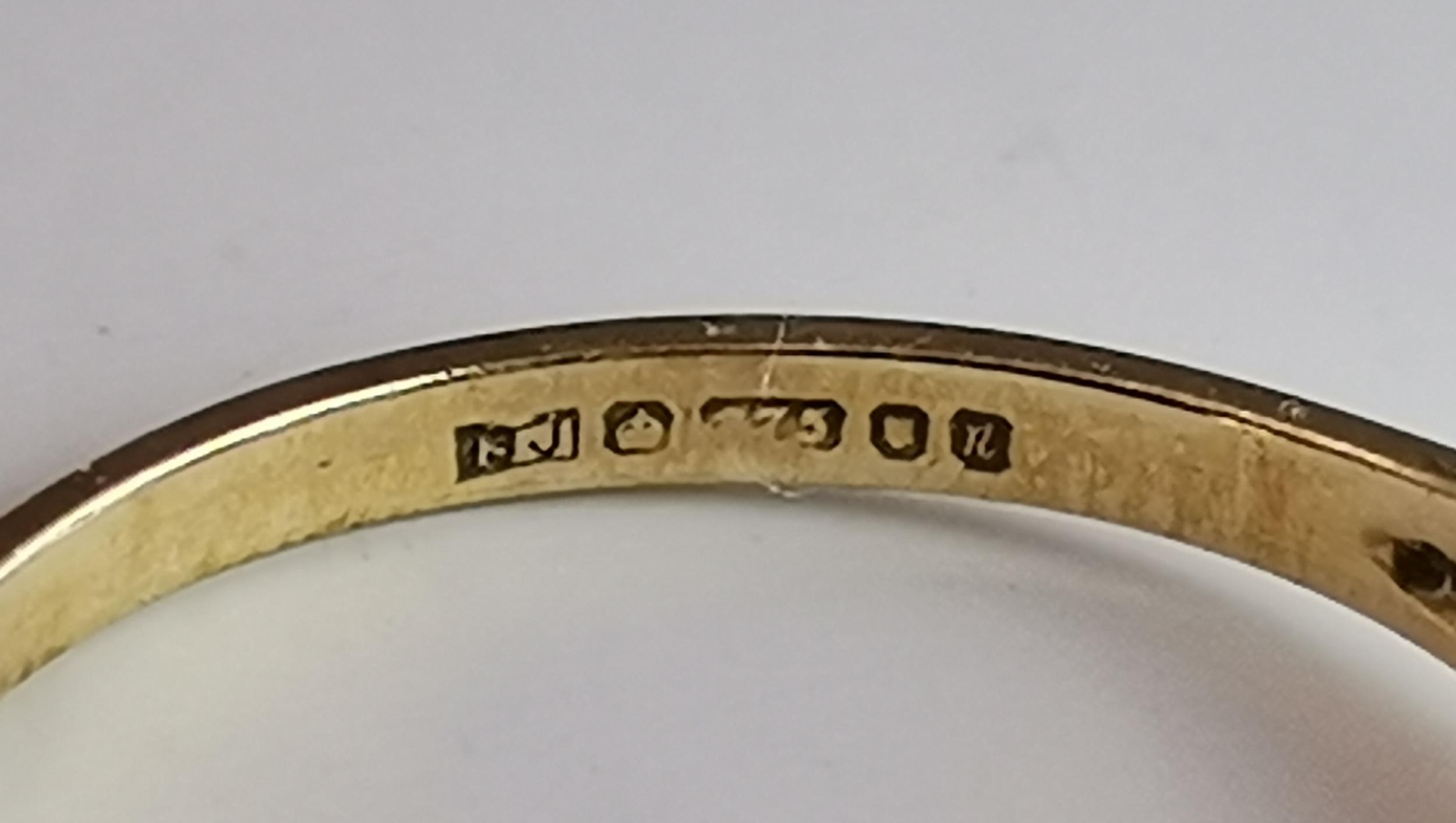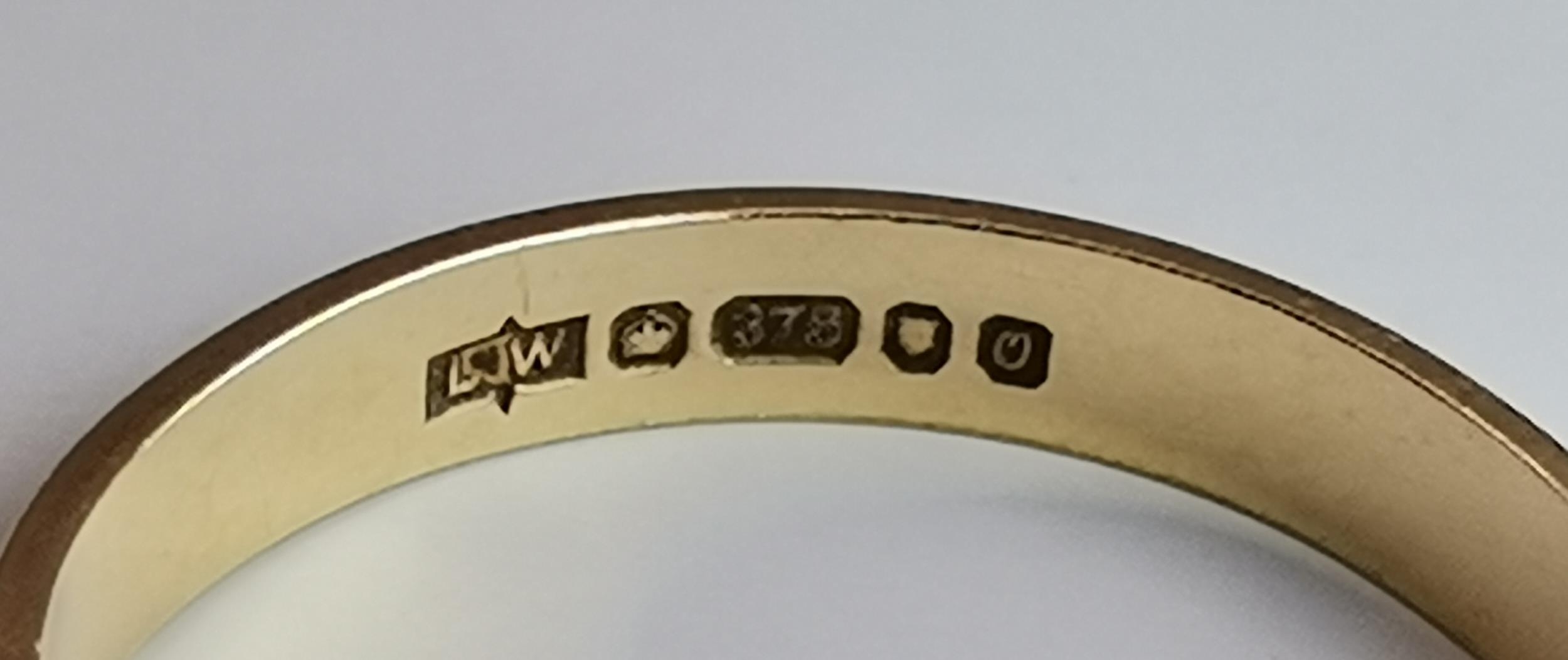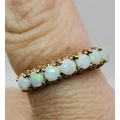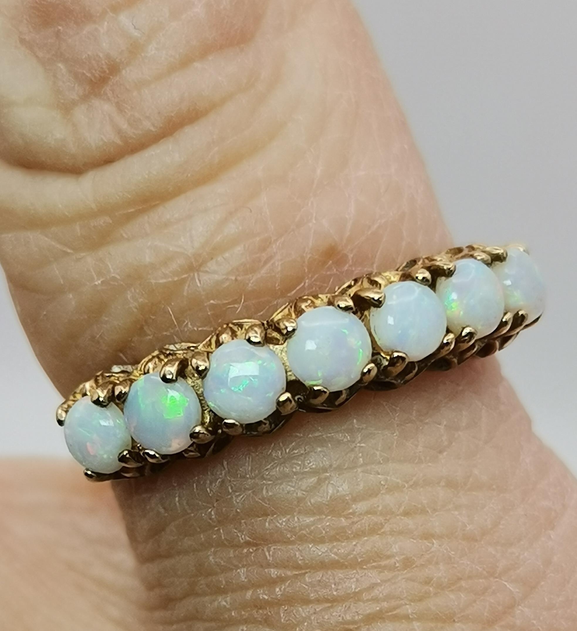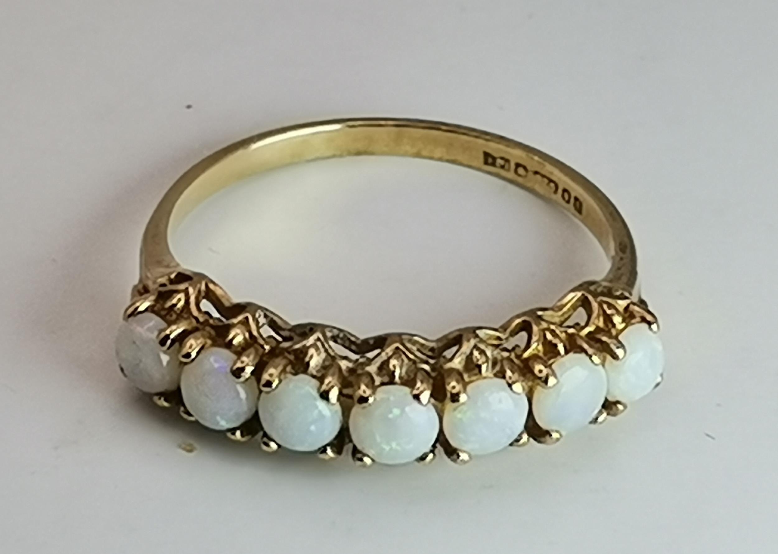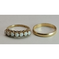 A 9 carat opal half-hoop ring, claw-set with seven stones to a pierced and open-backed gallery setting, hallmarked 375, ring size M; together with a 9 carat gold band ring, hallmarked 375, ring size M. (2) 3.0g gross