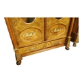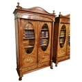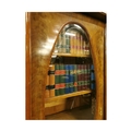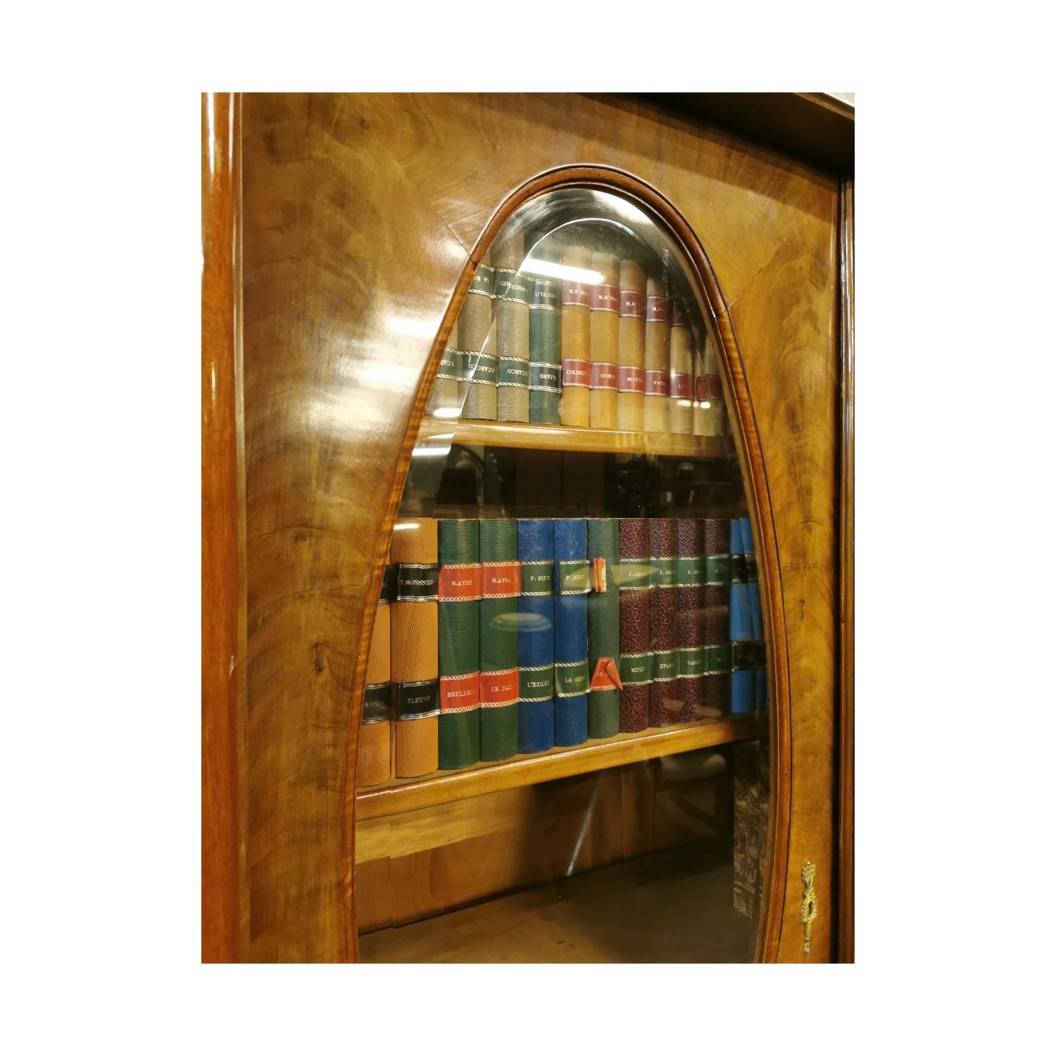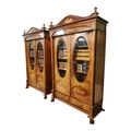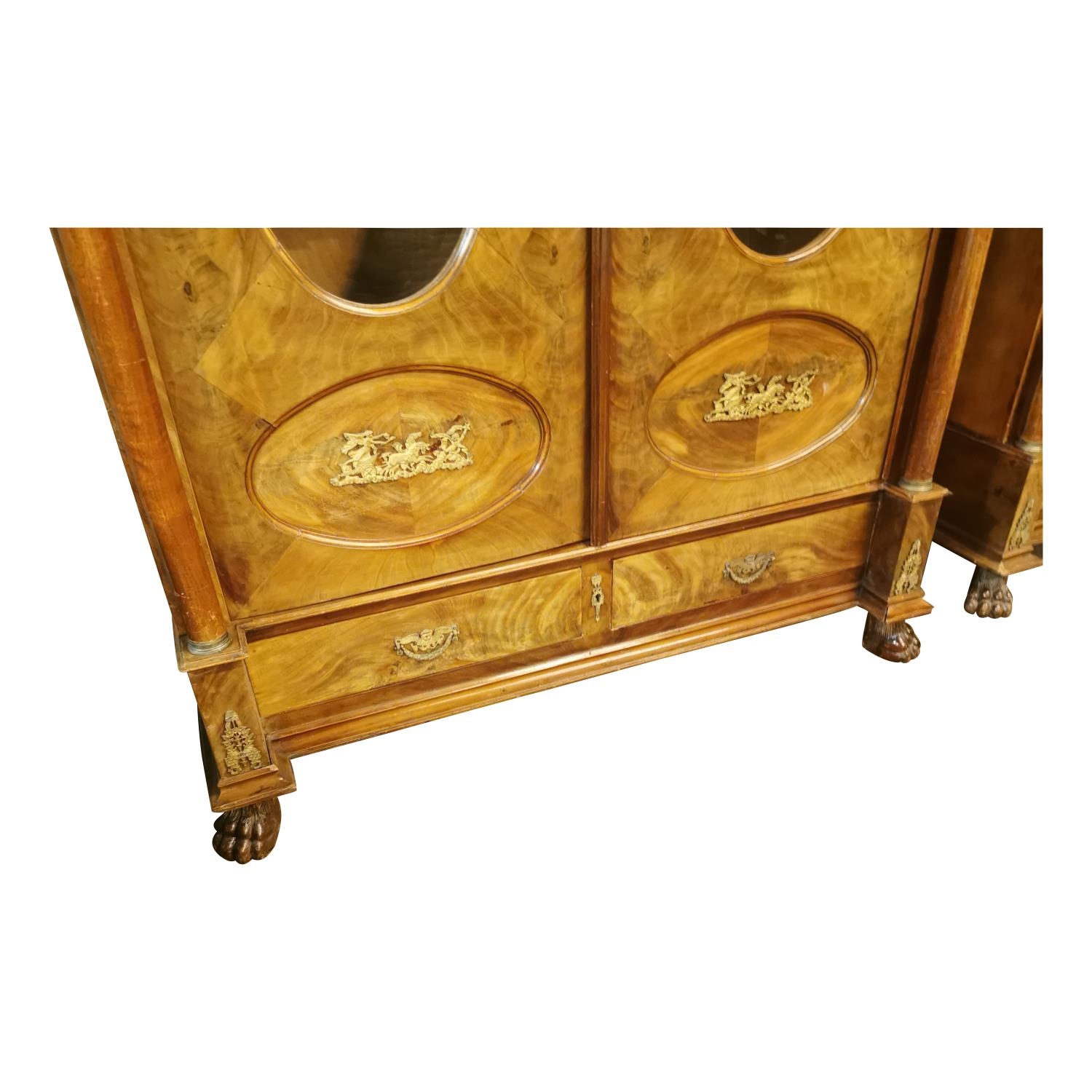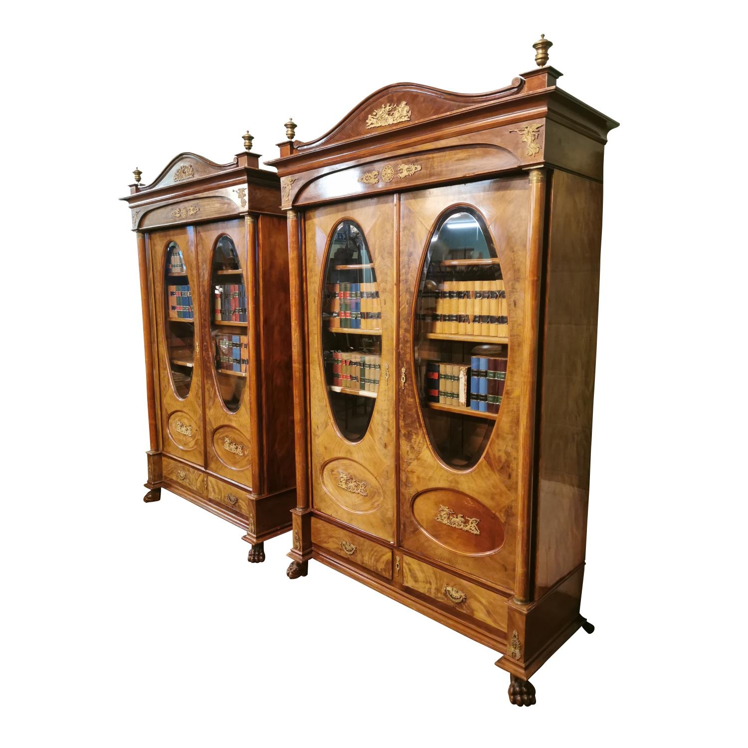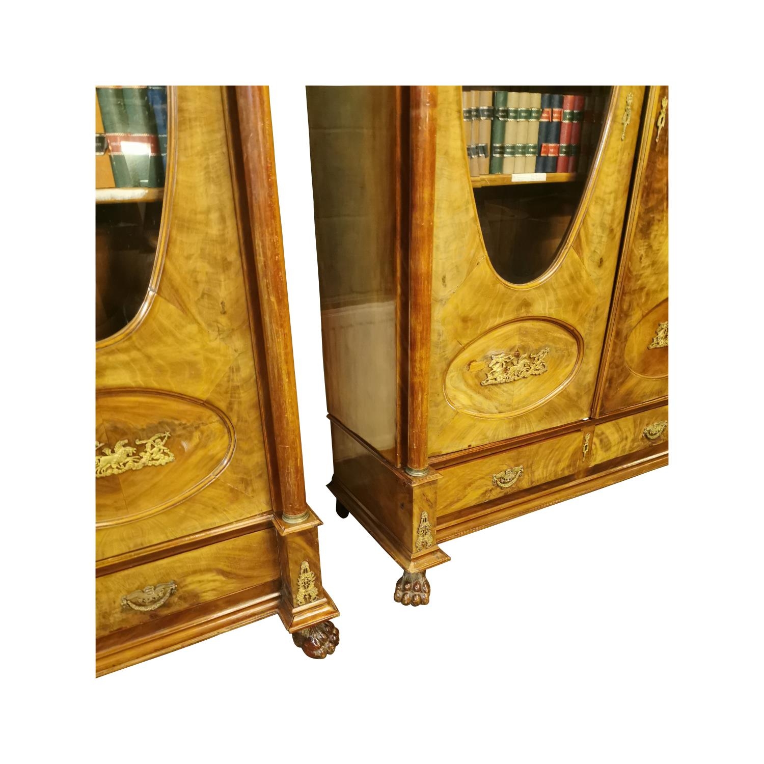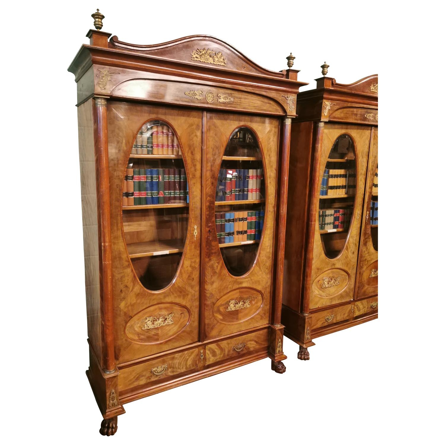 Rare pair of 19th. C. mahogany bookcases with brass mounts, the two doors glazed with oval plates , flanked with columns with Corinthian heads, above two short drawers and raised on paw feet. [ books not included } { 232cm H X 146cm W X 56cm D }.