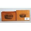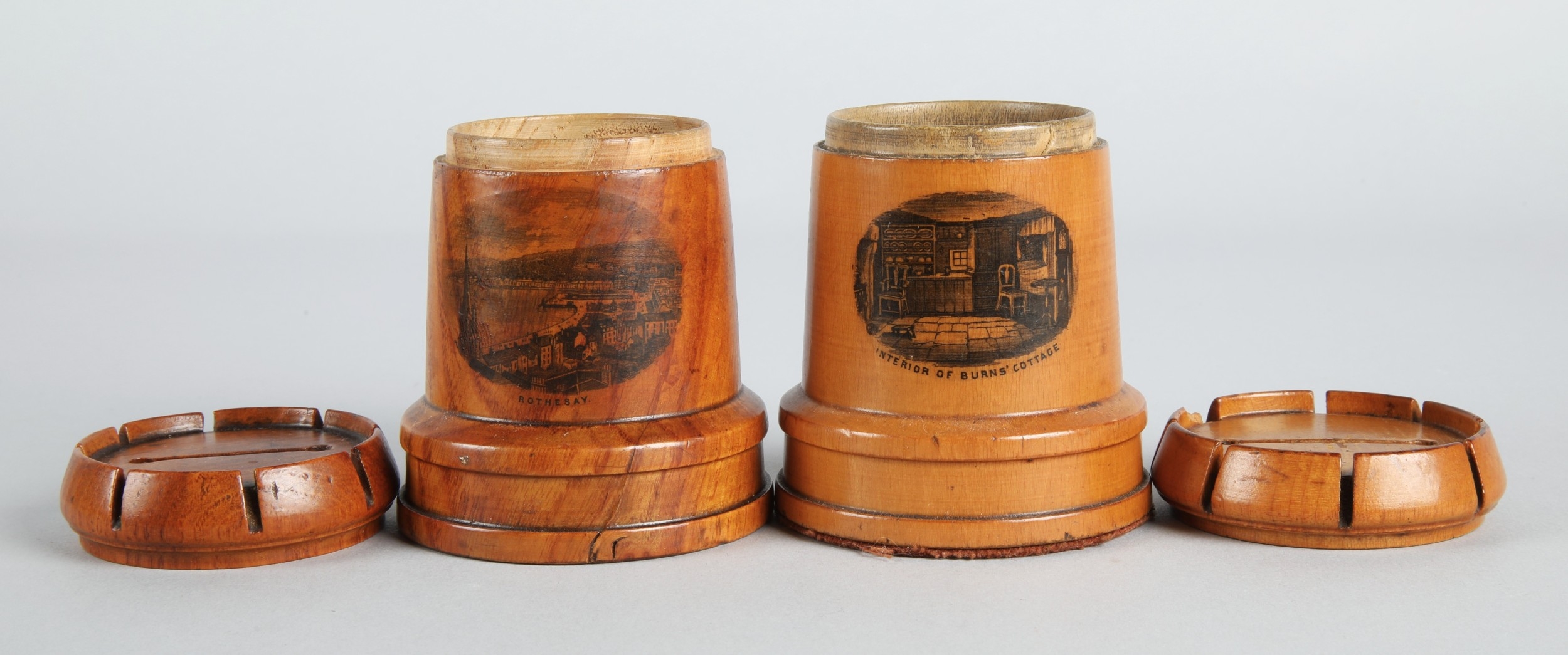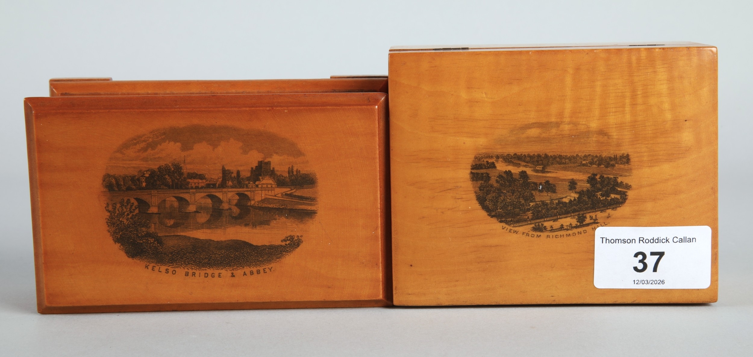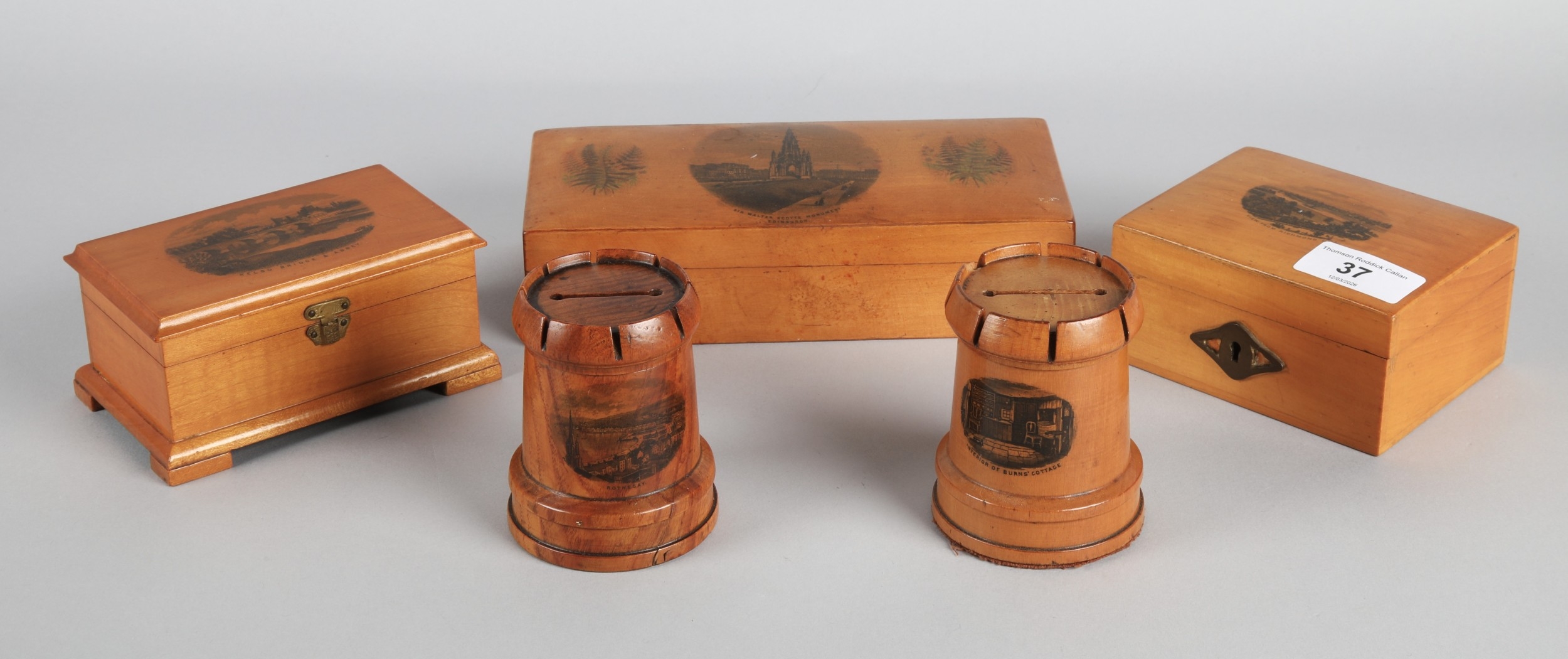 Collection of Mauchline Ware to include three boxes and two money banks (5).