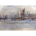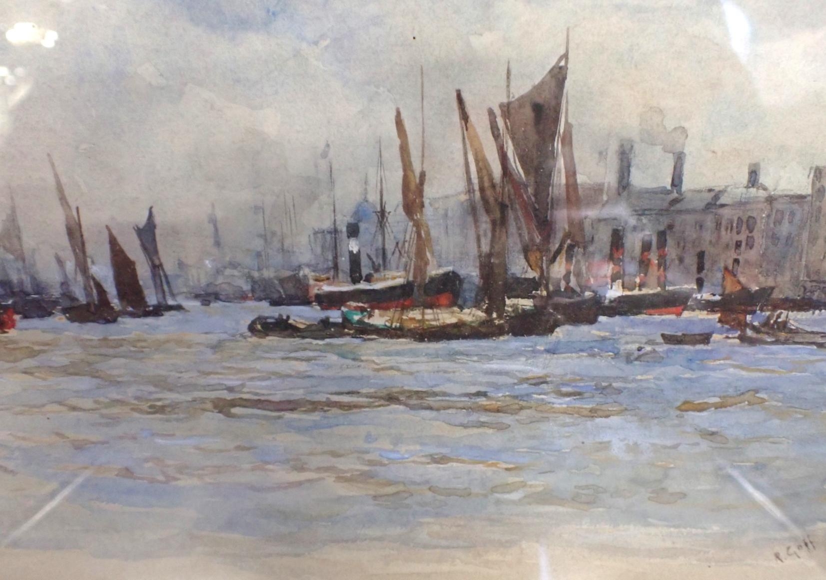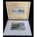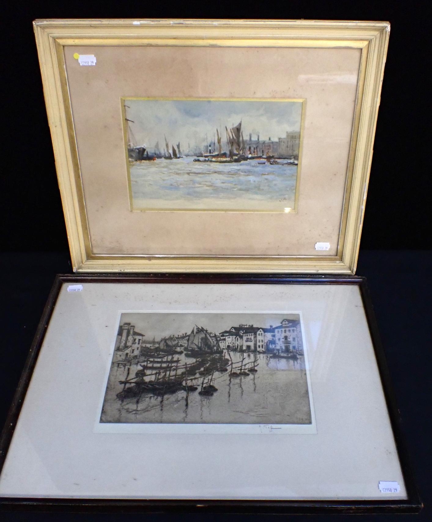 Col. R. GOFF: 'THE POOL, LONDON'watercolour, dated 1923 to back label, framed, 40 x 48cm, and a canal scene etching, 1910, by the same artist (2)