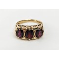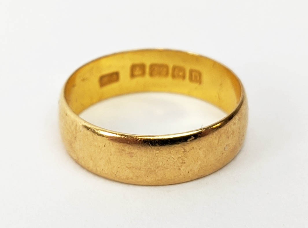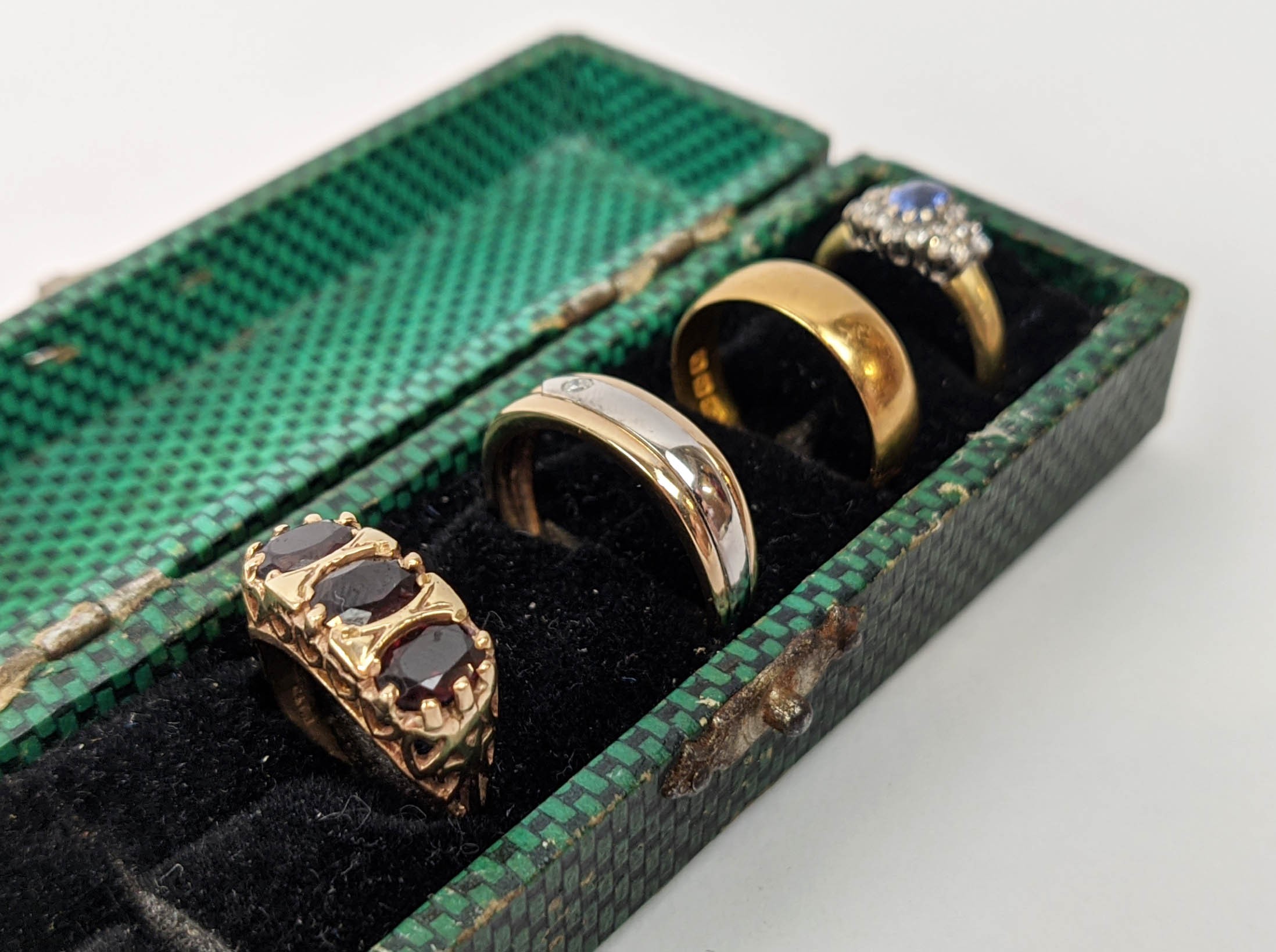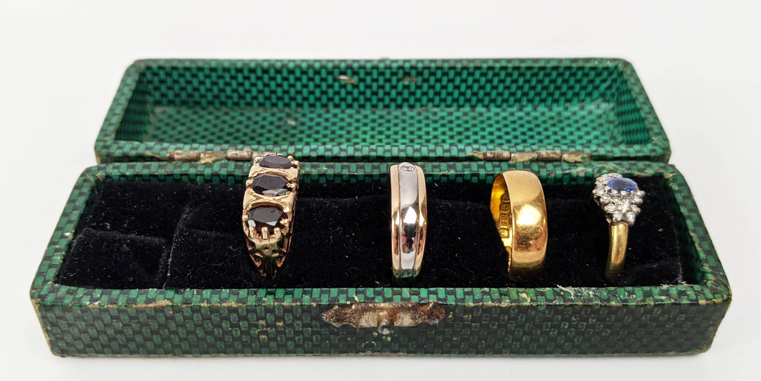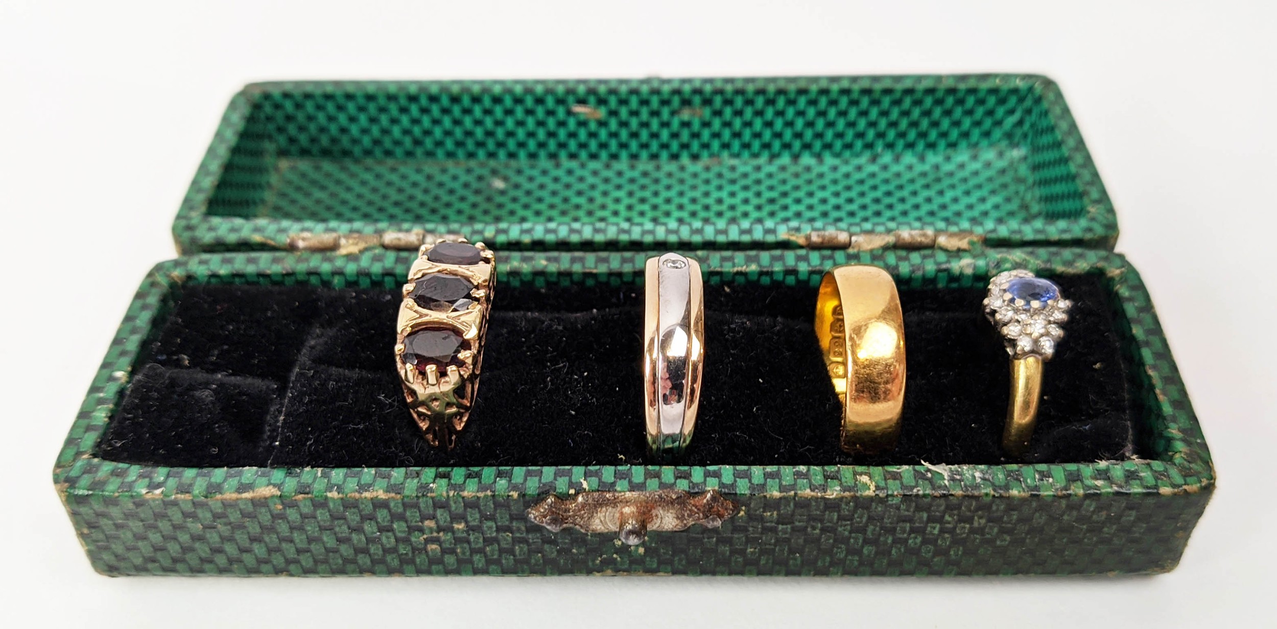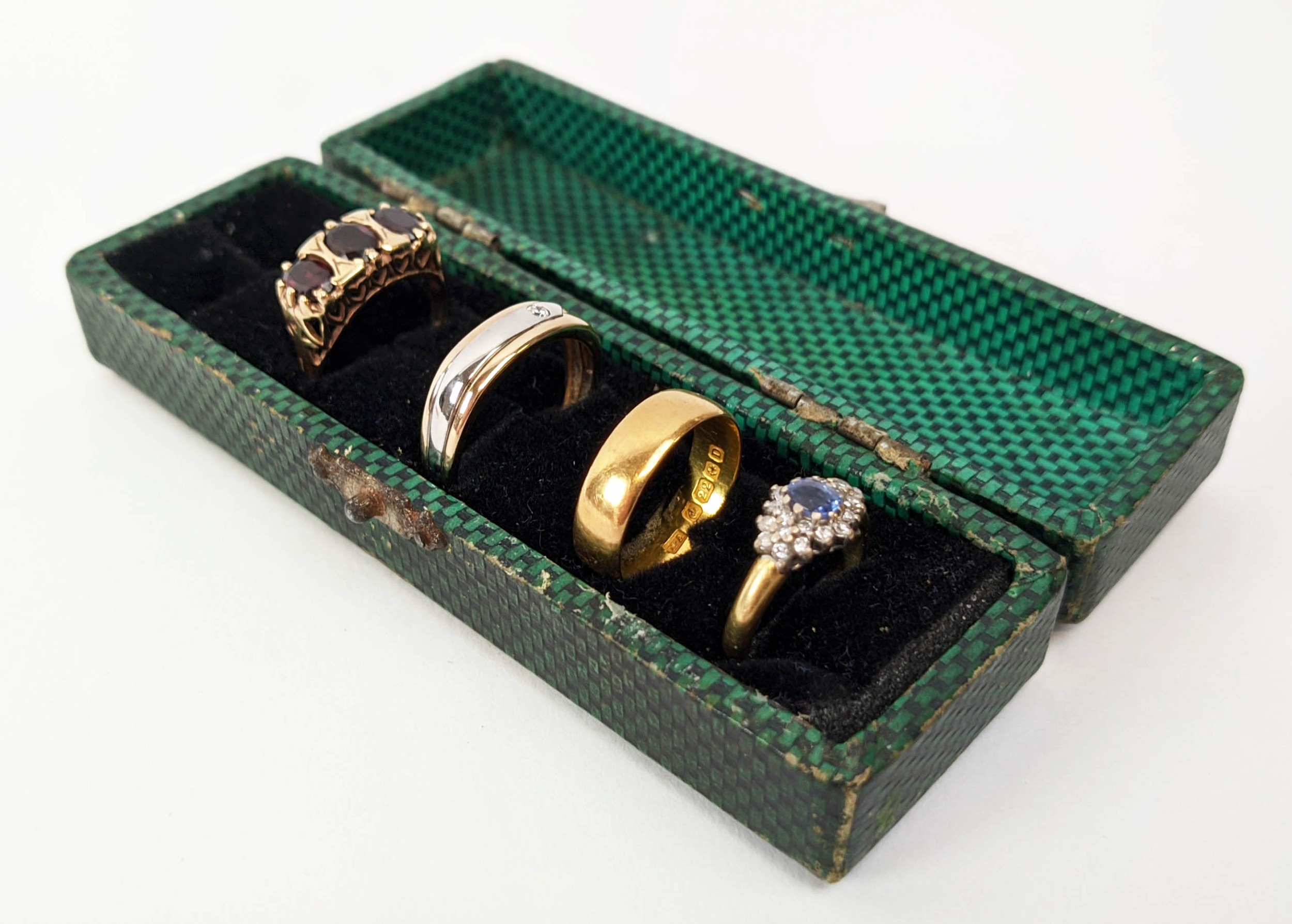 FOUR VARIOUS DRESS RINGS, comprising a 22ct gold wedding band, ring size Q½, 4.64 grams; a 9ct gold single stone diamond ring, 0.05ct, ring size U, 3.02 grams; a 9ct gold three stone garnet set dress ring, heart motif pierced gallery setting, ring size P½; an 18ct gold sapphire and diamond dress ring, central sapphire of approximately 0.20ct with a diamond cluster surround, ring size K½, 3.79 grams. (4)