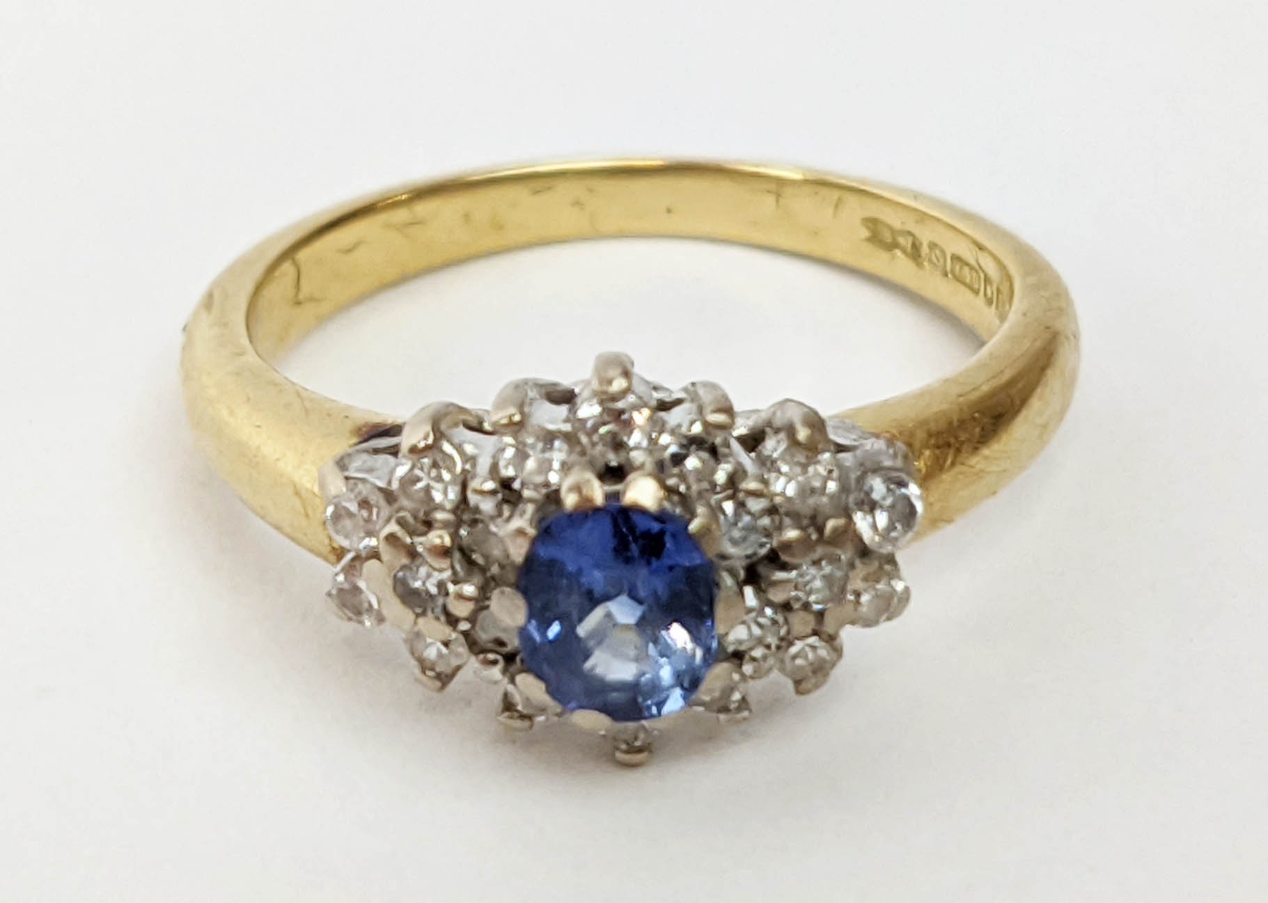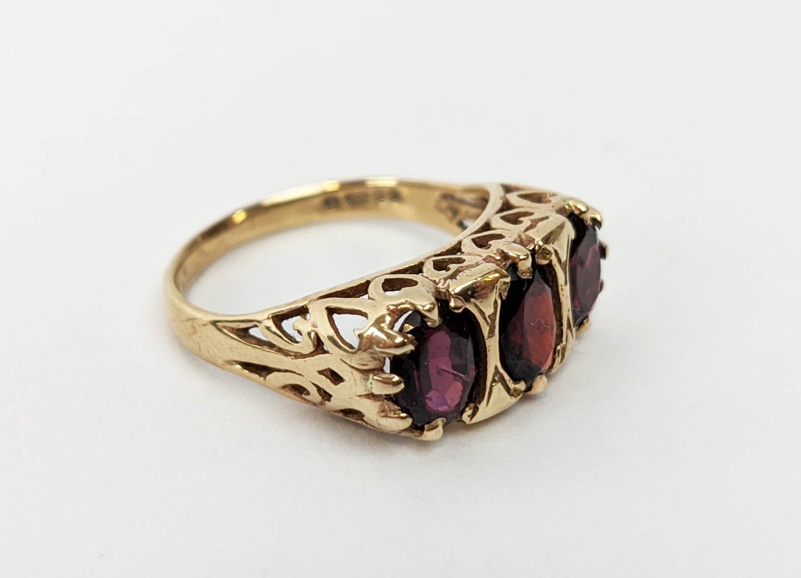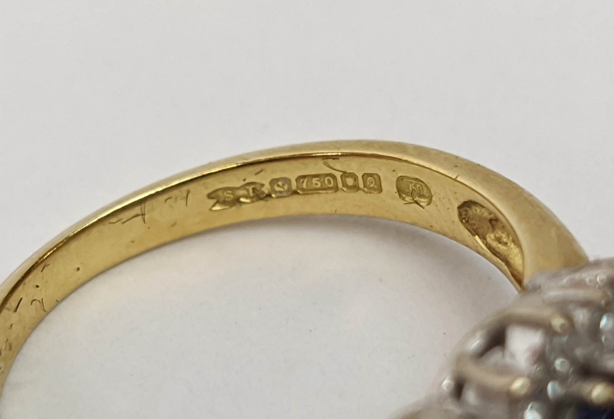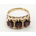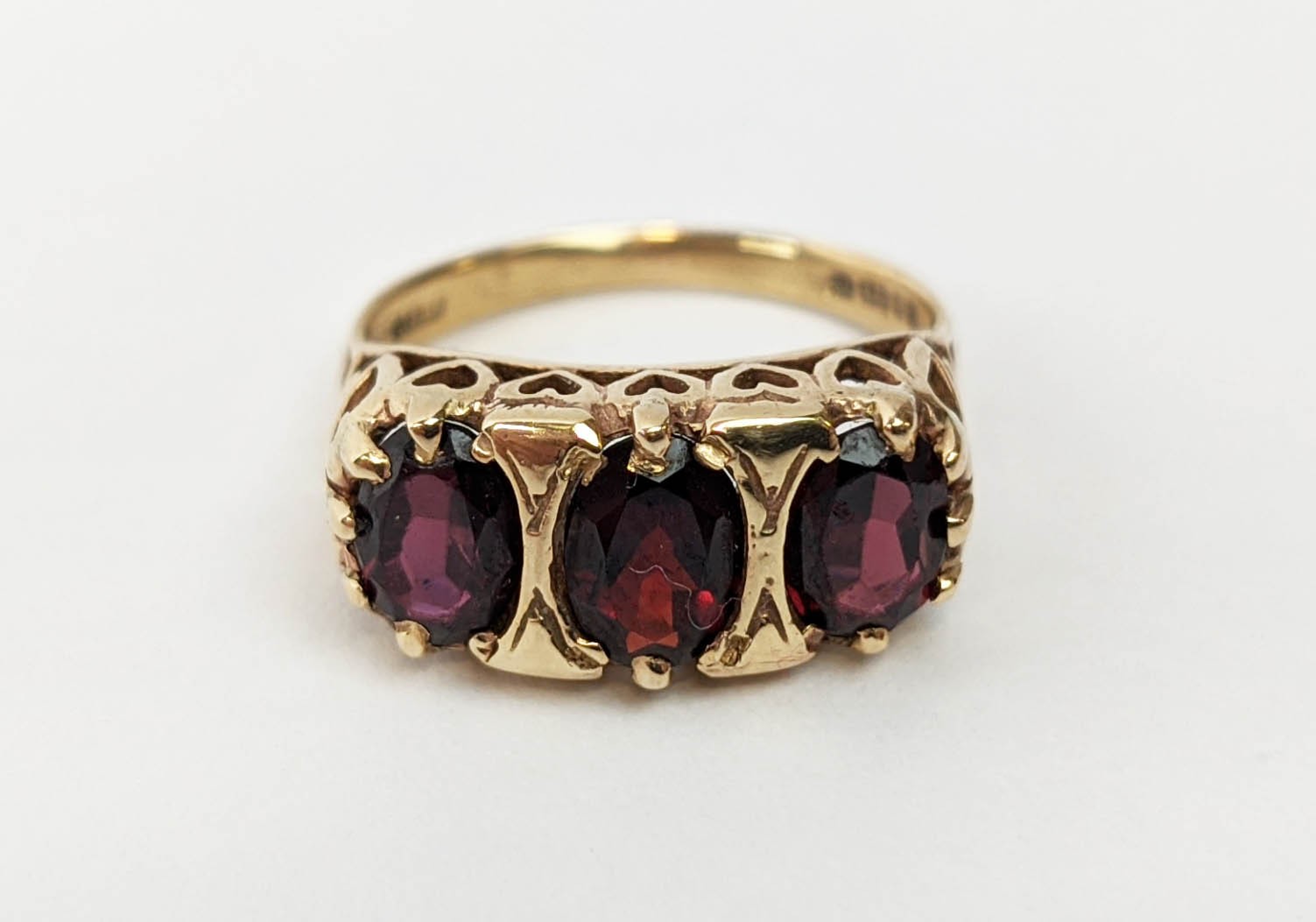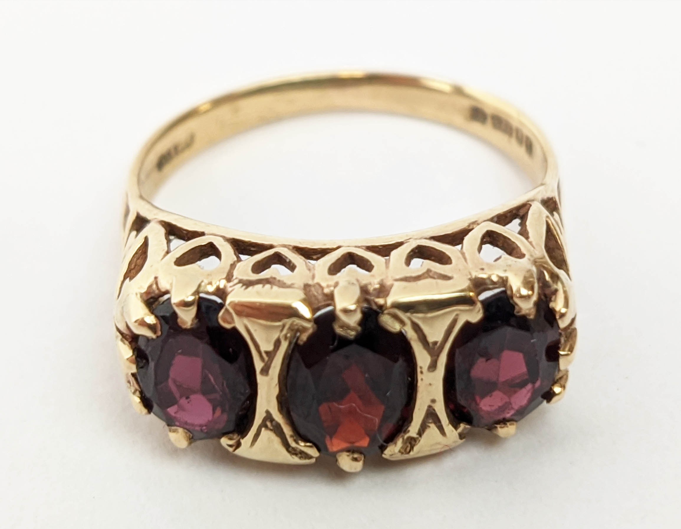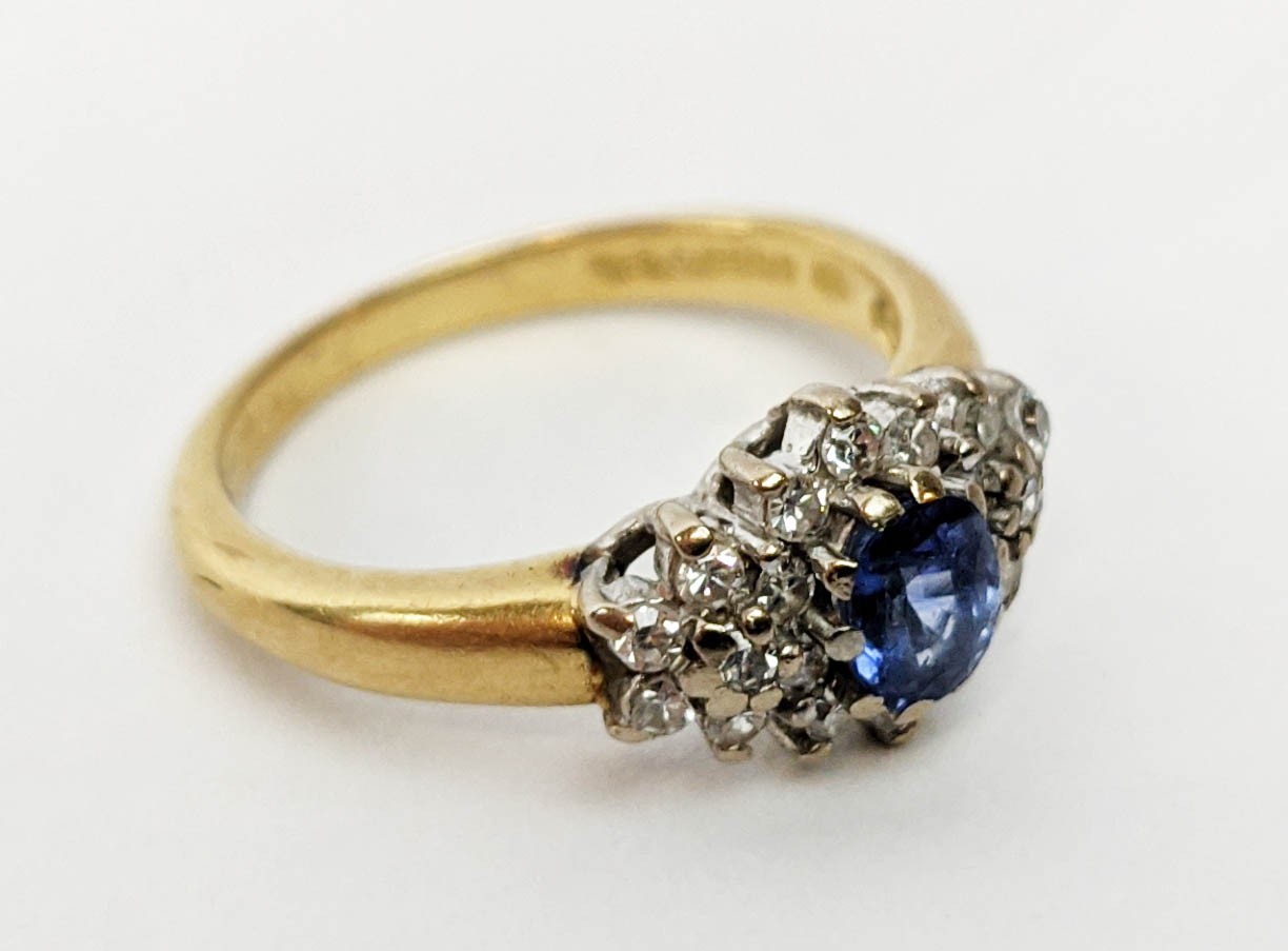 FOUR VARIOUS DRESS RINGS, comprising a 22ct gold wedding band, ring size Q½, 4.64 grams; a 9ct gold single stone diamond ring, 0.05ct, ring size U, 3.02 grams; a 9ct gold three stone garnet set dress ring, heart motif pierced gallery setting, ring size P½; an 18ct gold sapphire and diamond dress ring, central sapphire of approximately 0.20ct with a diamond cluster surround, ring size K½, 3.79 grams. (4)