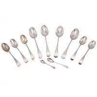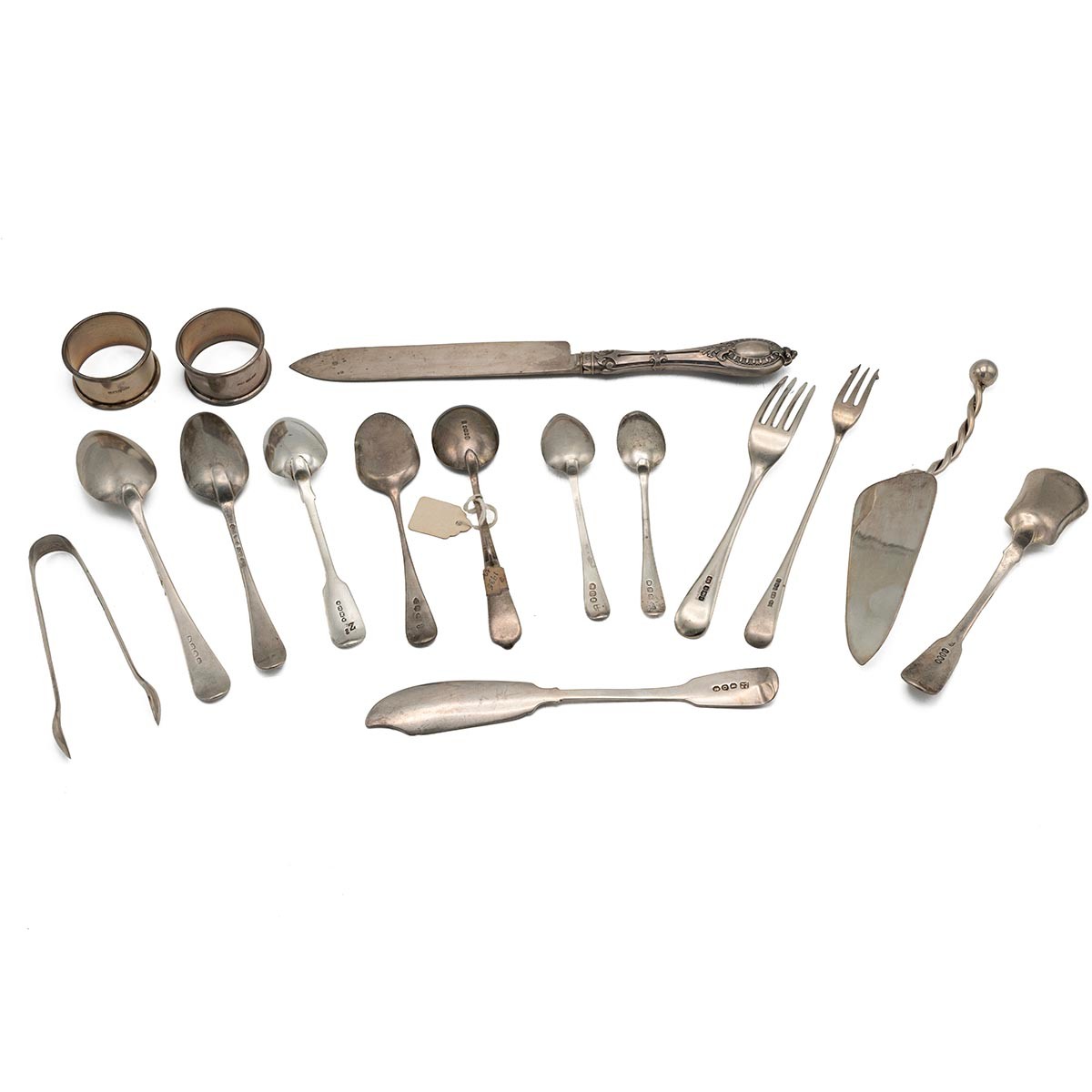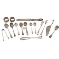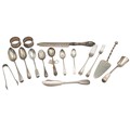A collection of mixed Georgian and Victorian silver flatware to include various spoons, forks, an Irish hallmarked stilton spoon, sugar nips, various other items, to include a modern American 925 silver cake slice and two napkin rings. Gross weight 435 grams