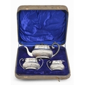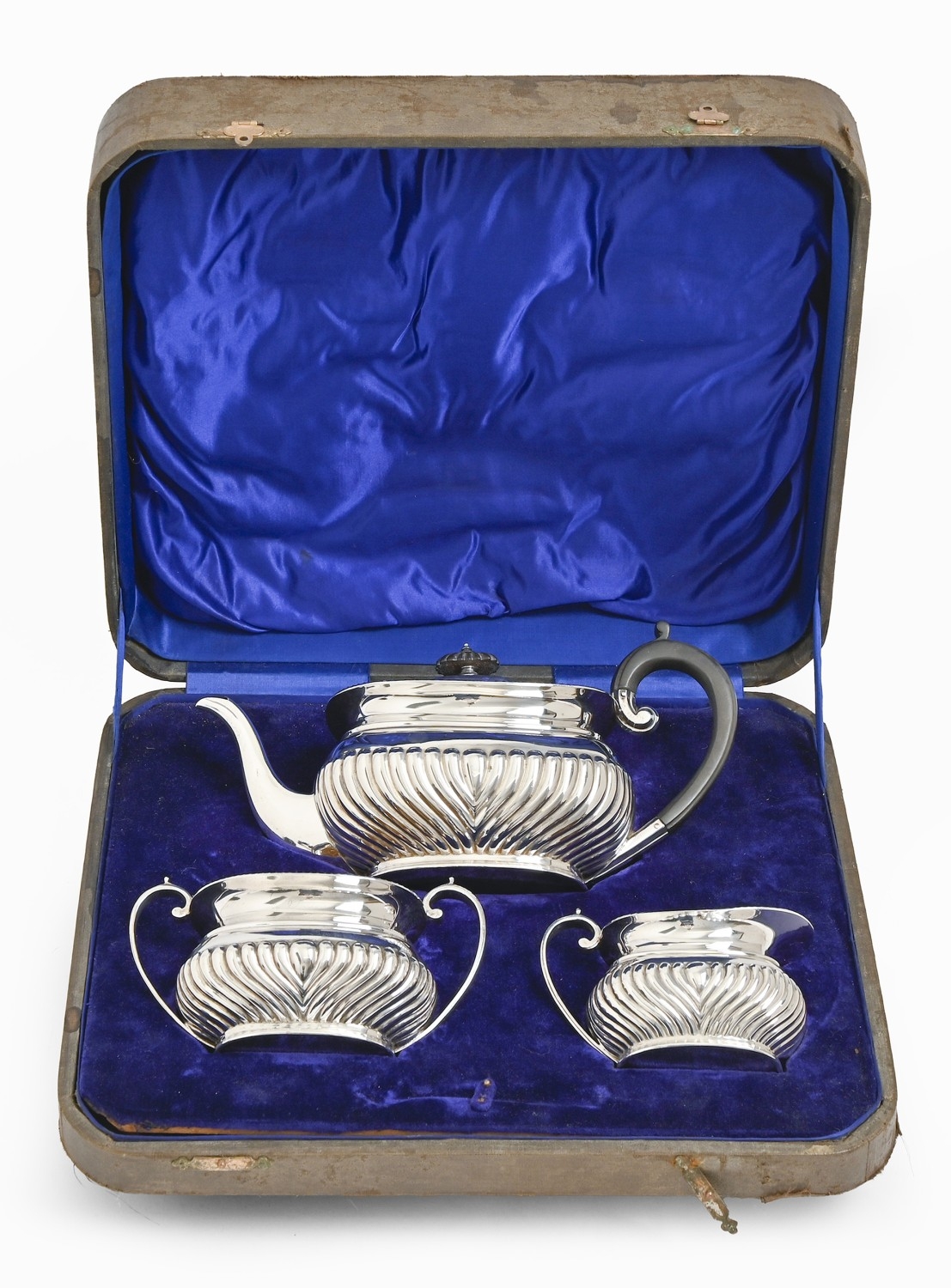 A George V silver tea service, with gadrooned rim, teapot 13.5cm h, by Harrison Bros & Howson, London and Sheffield, 1913 and 1916, cased, 24oz 10dwt (3)