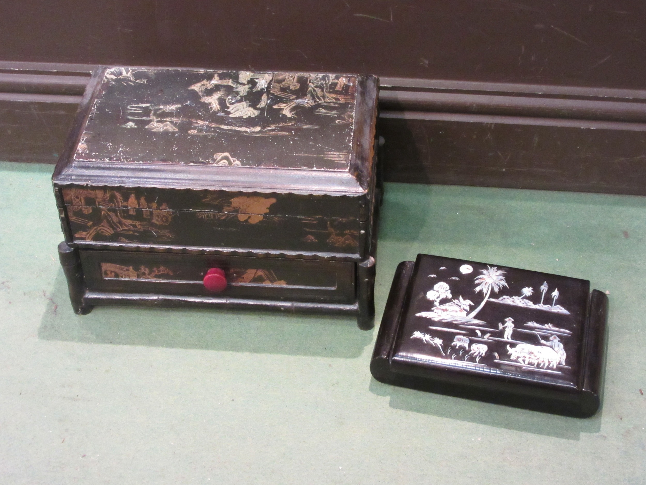 A Japanese lacquered jewellery box together with another set with mother-of-pearl (2)