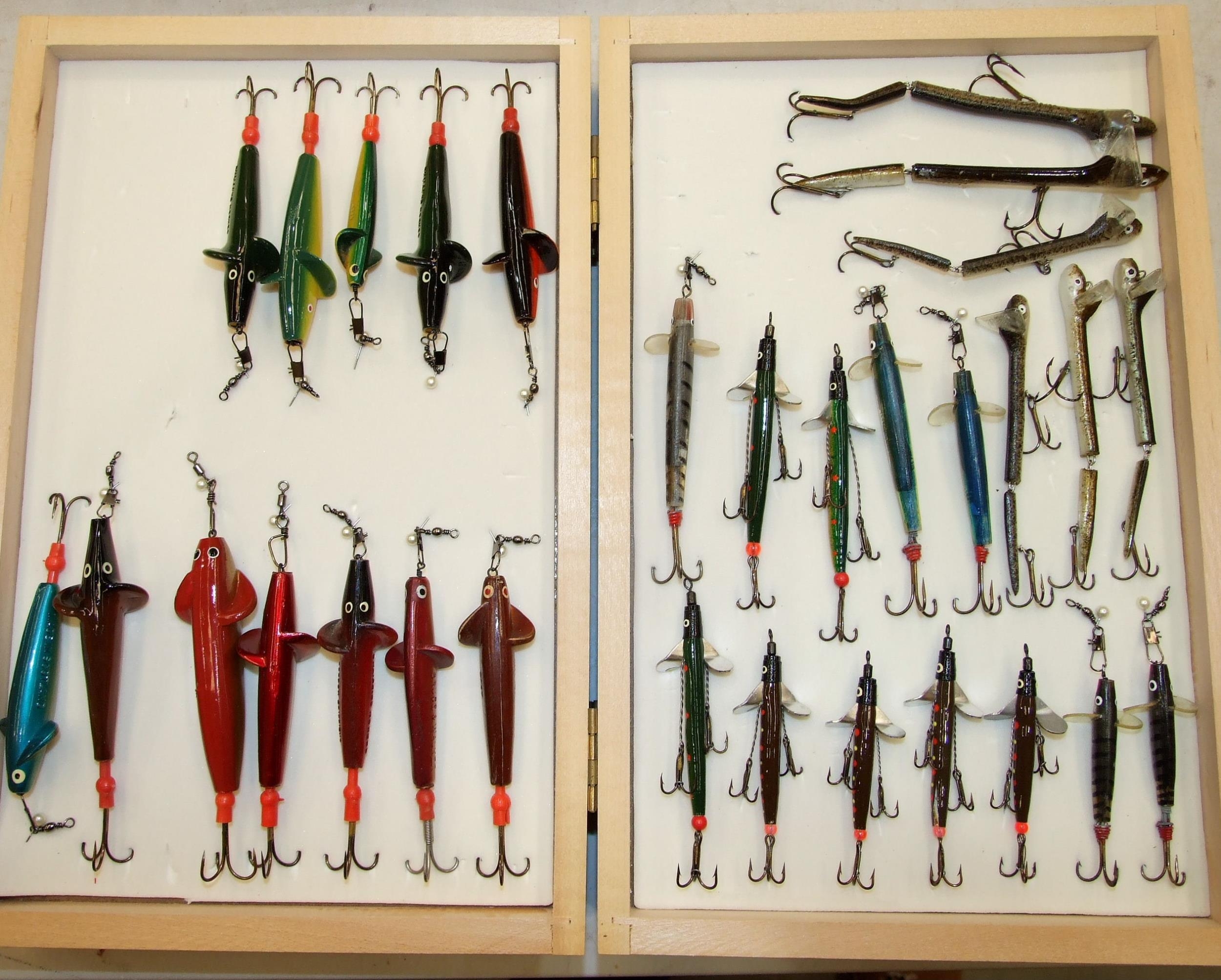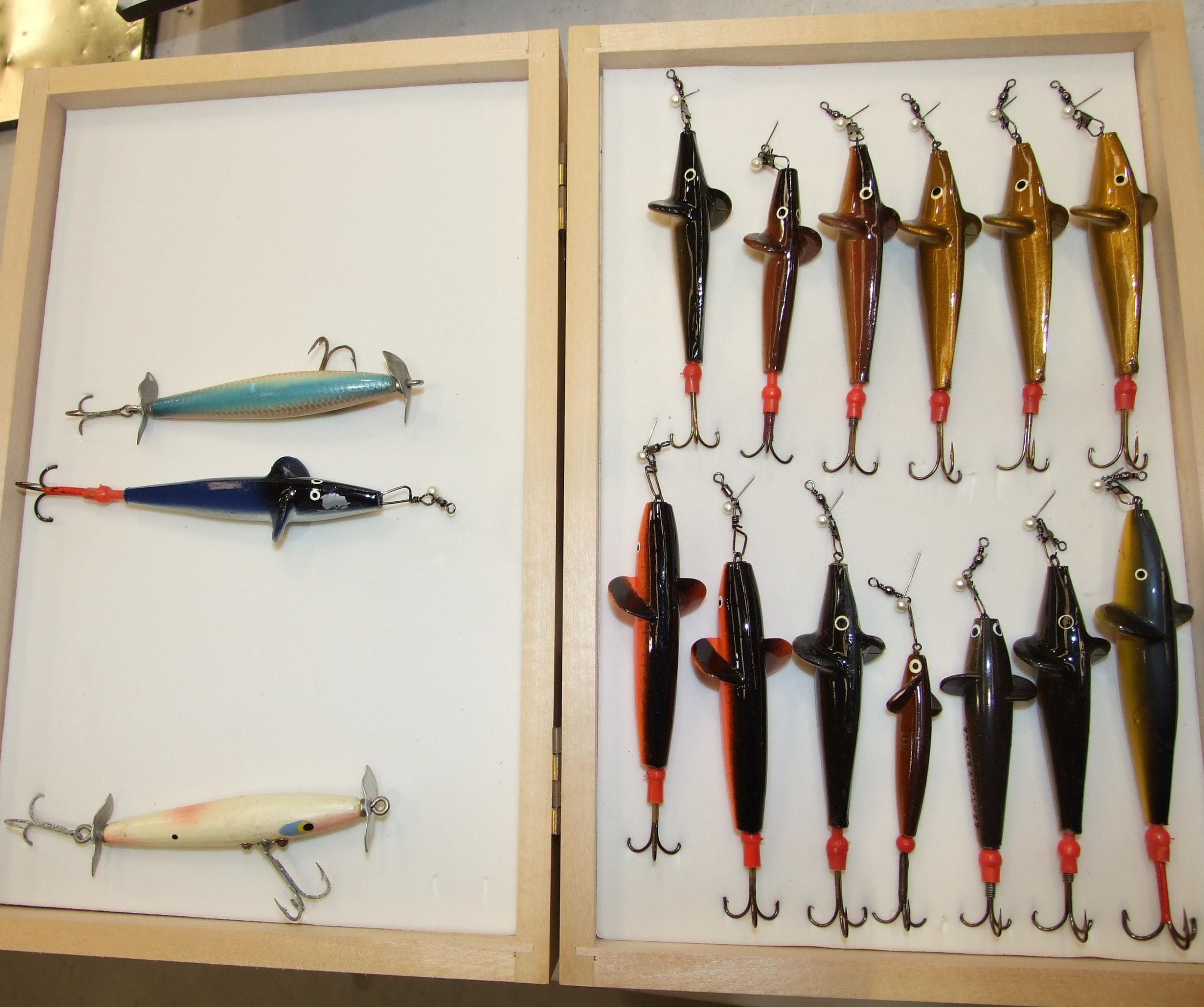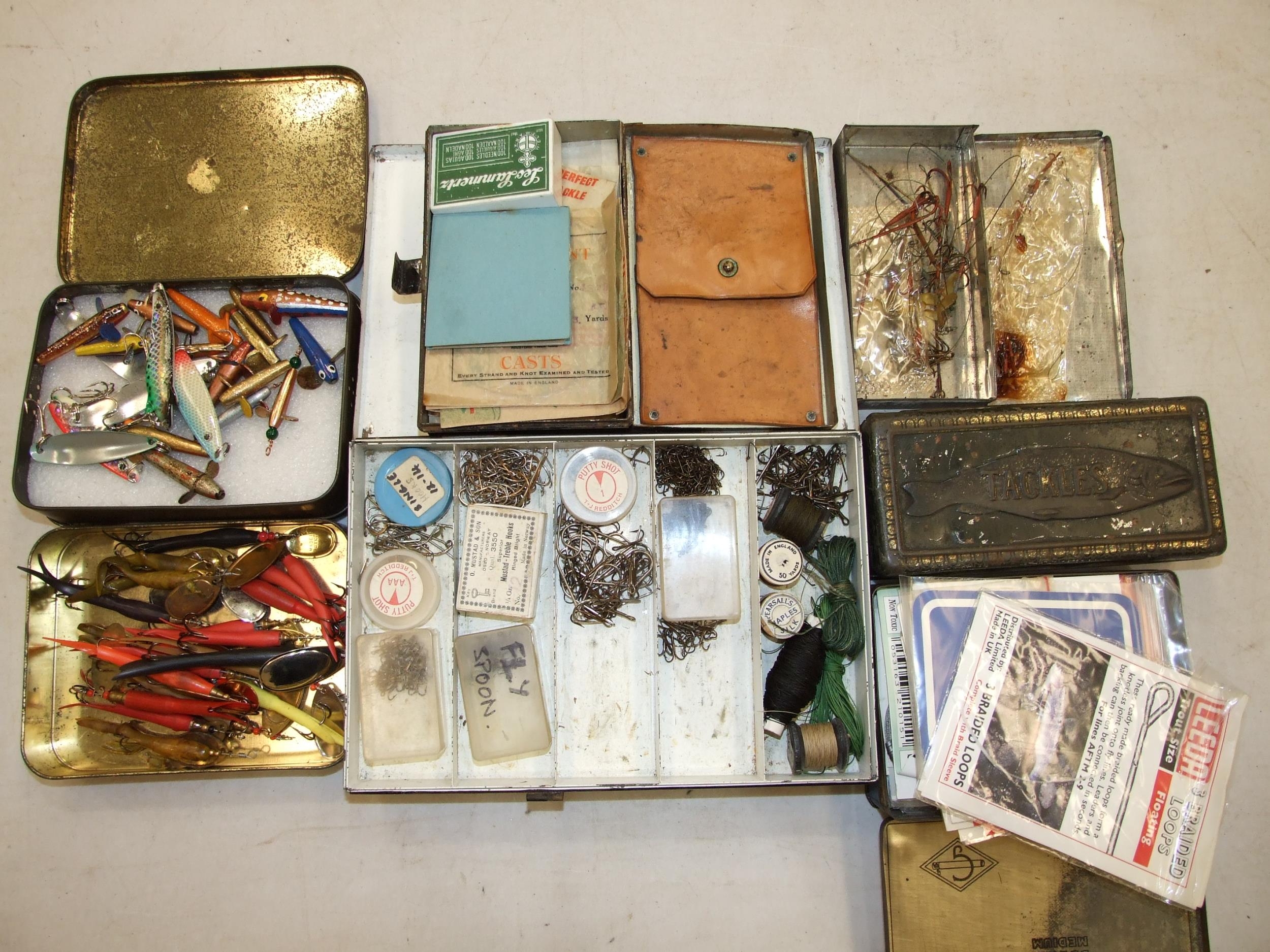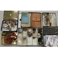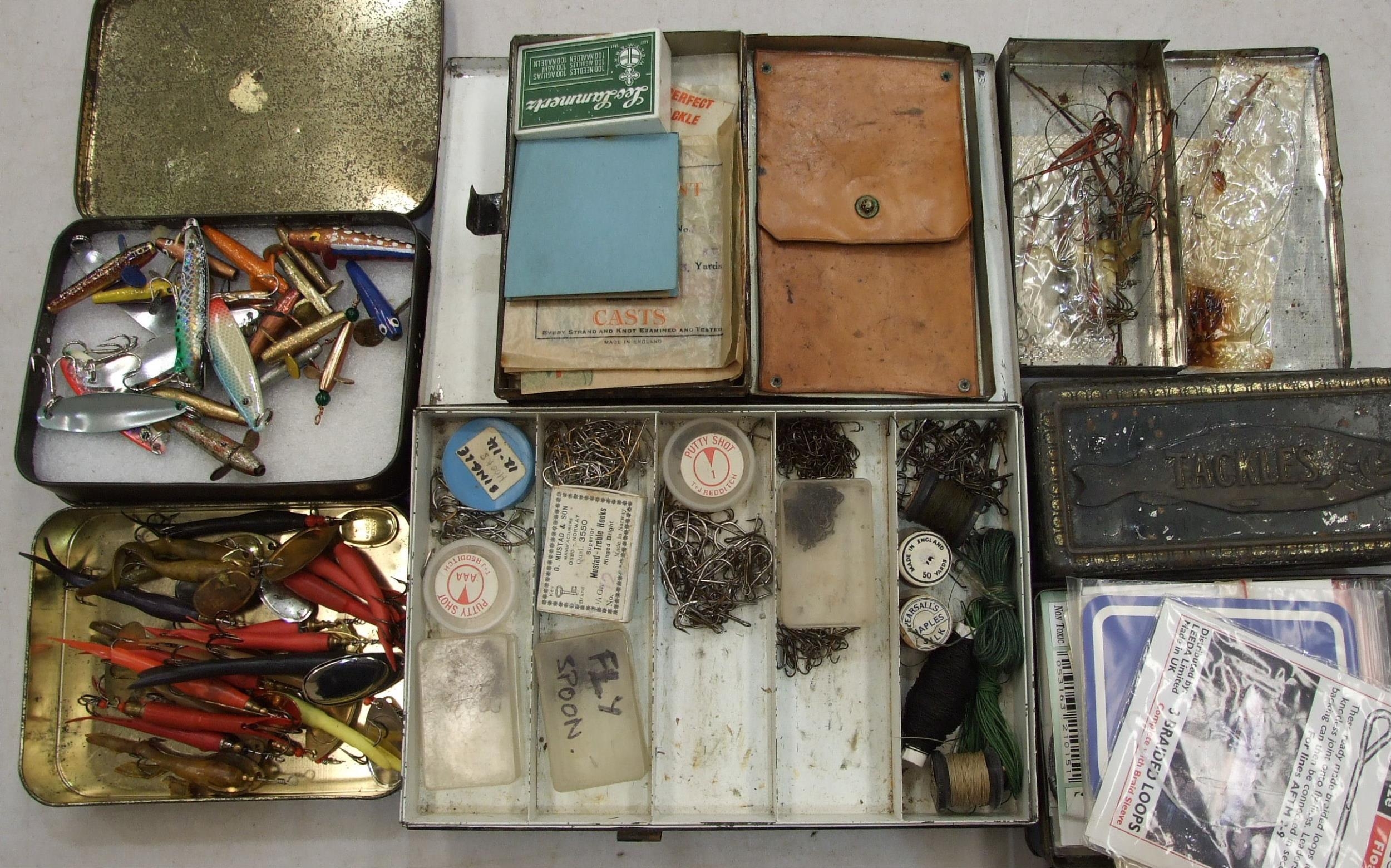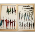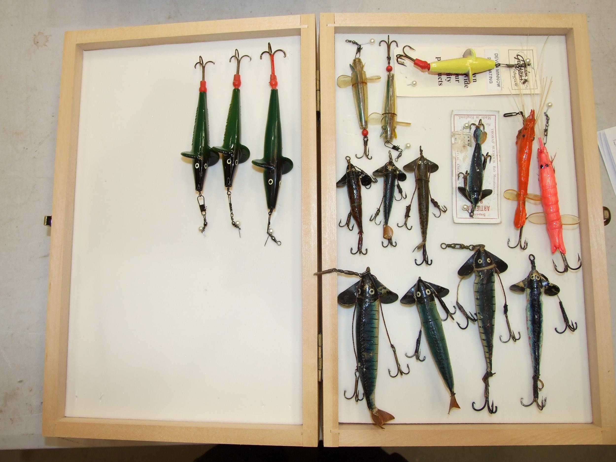 A collection of approximately 60 lures, baits and minnows, in a modern box, together with a collection of hooks, prawn gear and miscellaneous fishing tackle.