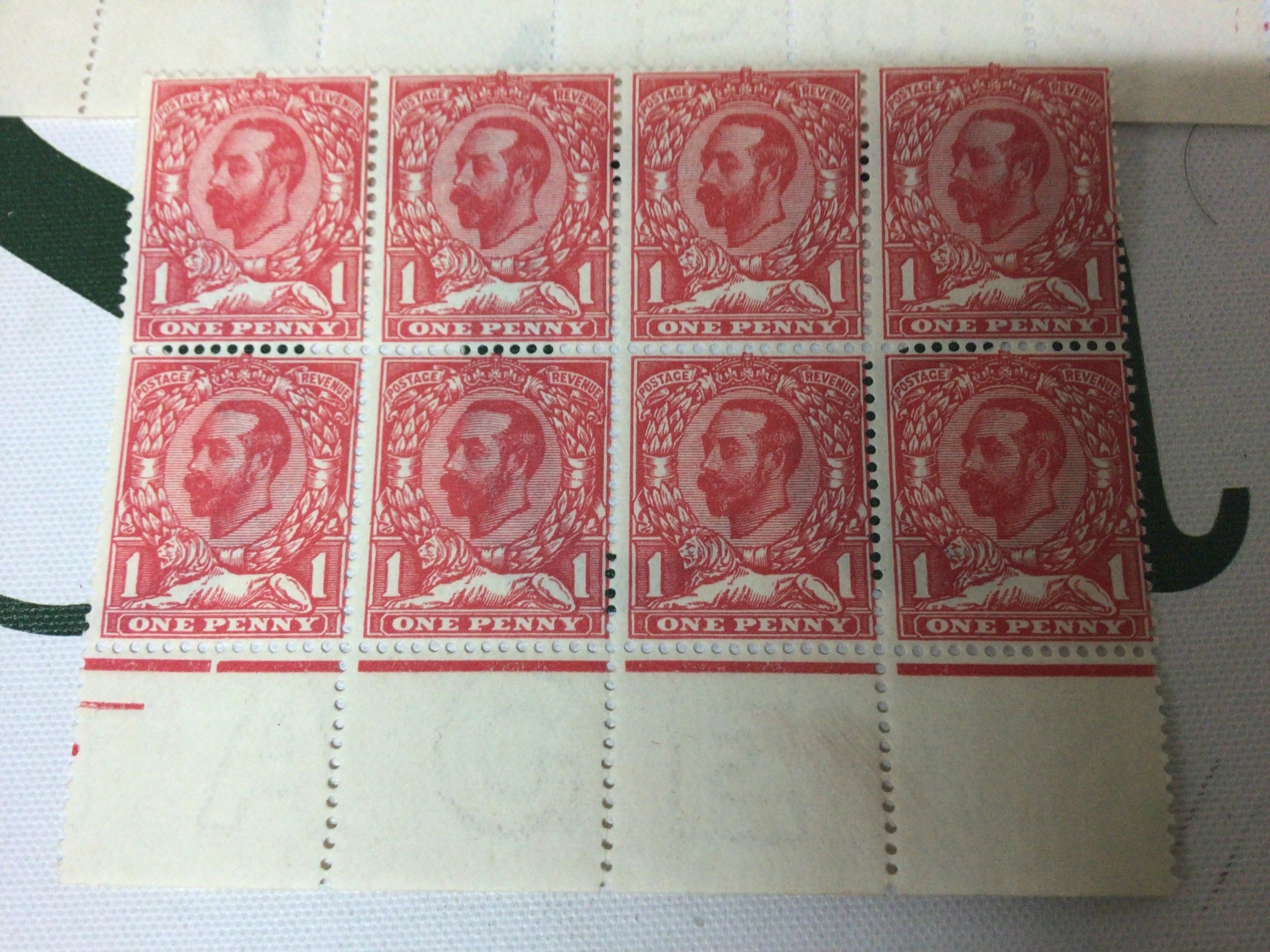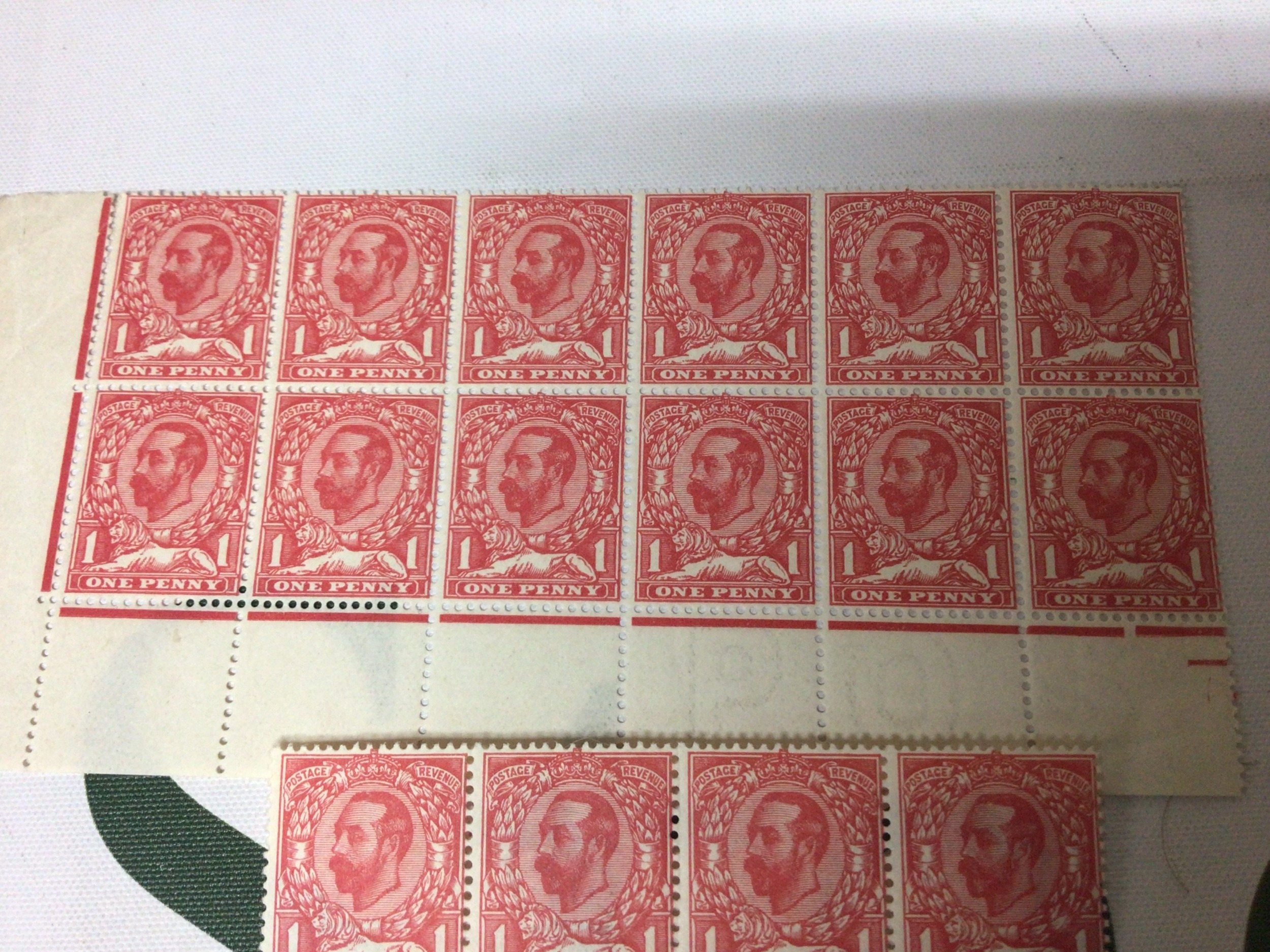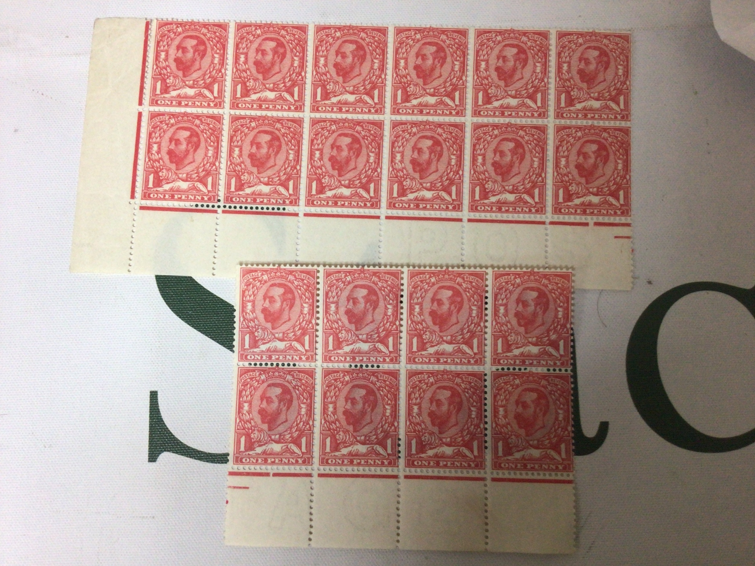 Two unused blocks of 1911 one Penny Stamps Bright Scarlet. A block of twelve with margin and a block of eight.