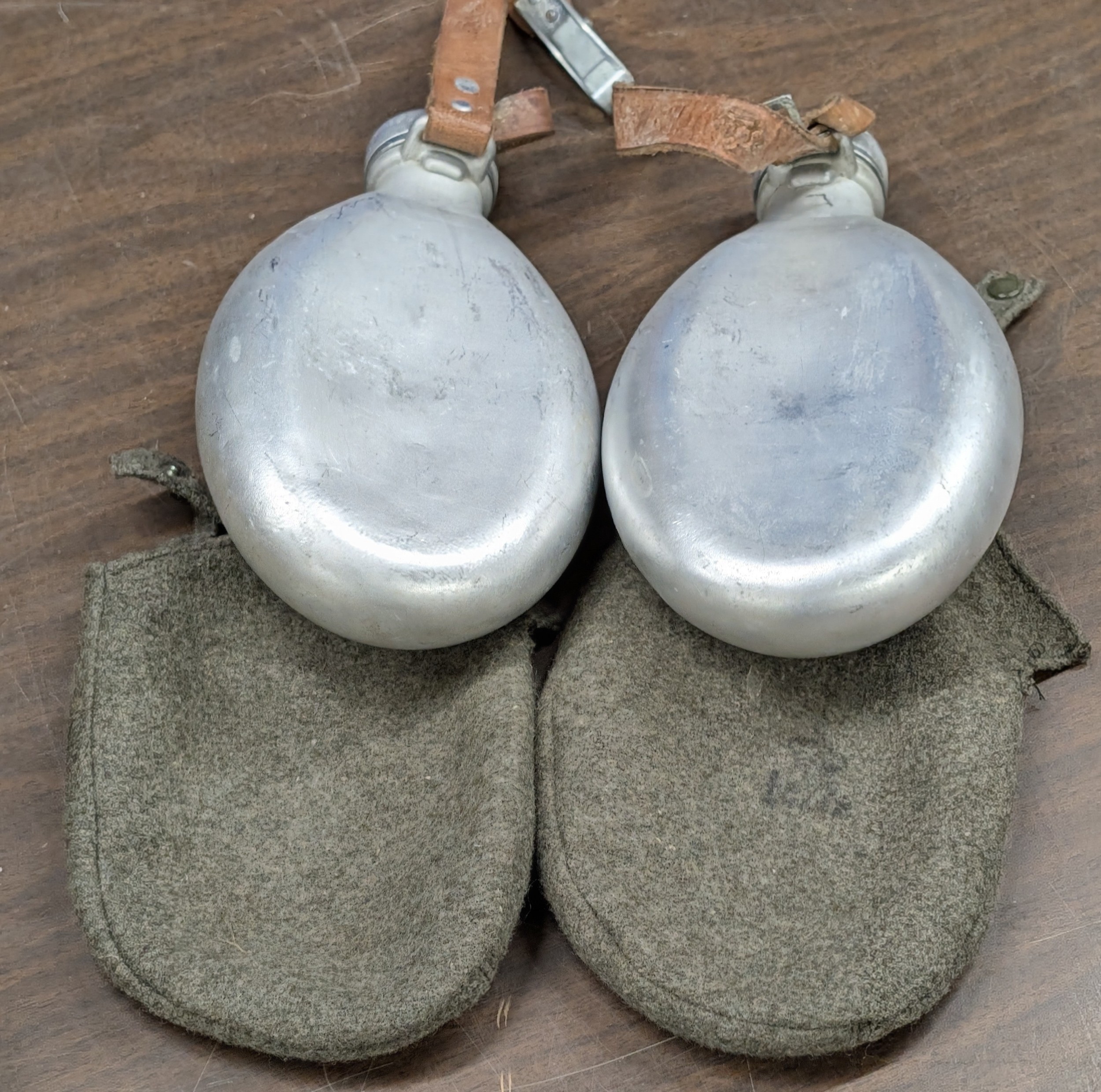 A Pair of NVA Aluminium Field Canteens with Gray Felt Covers