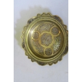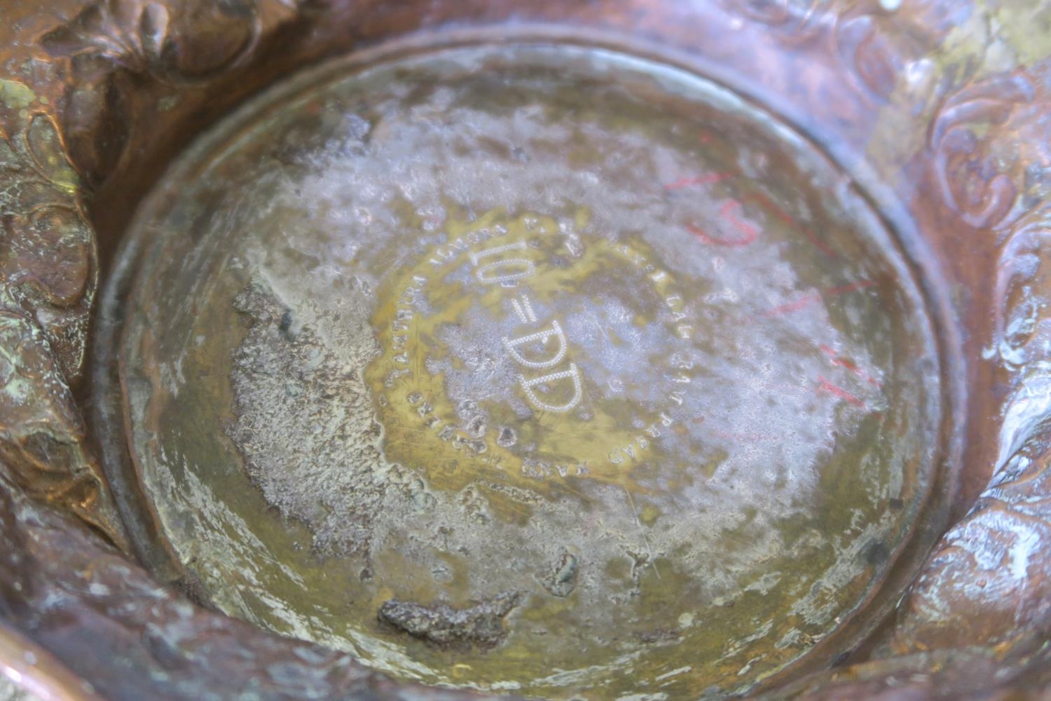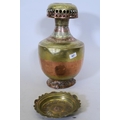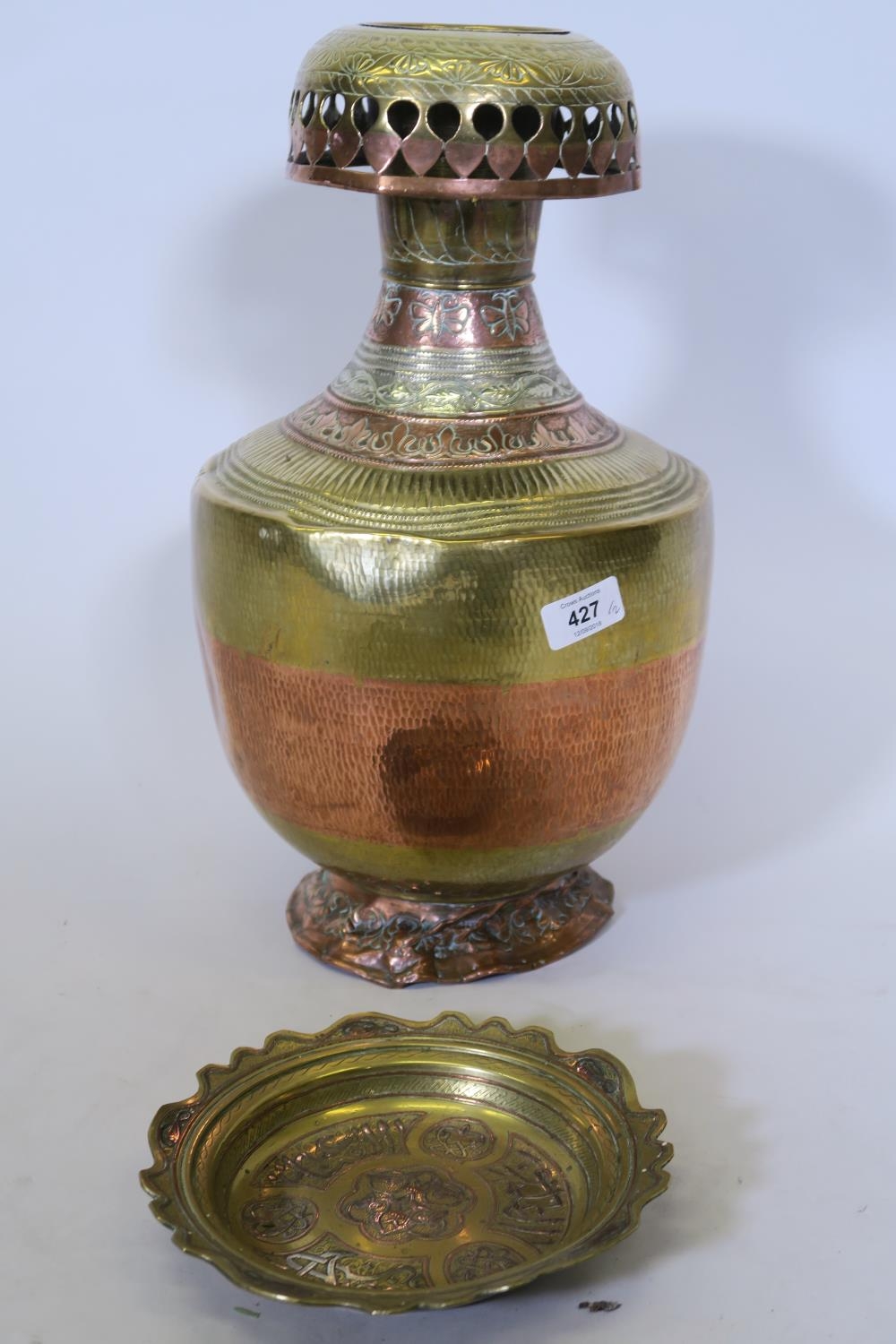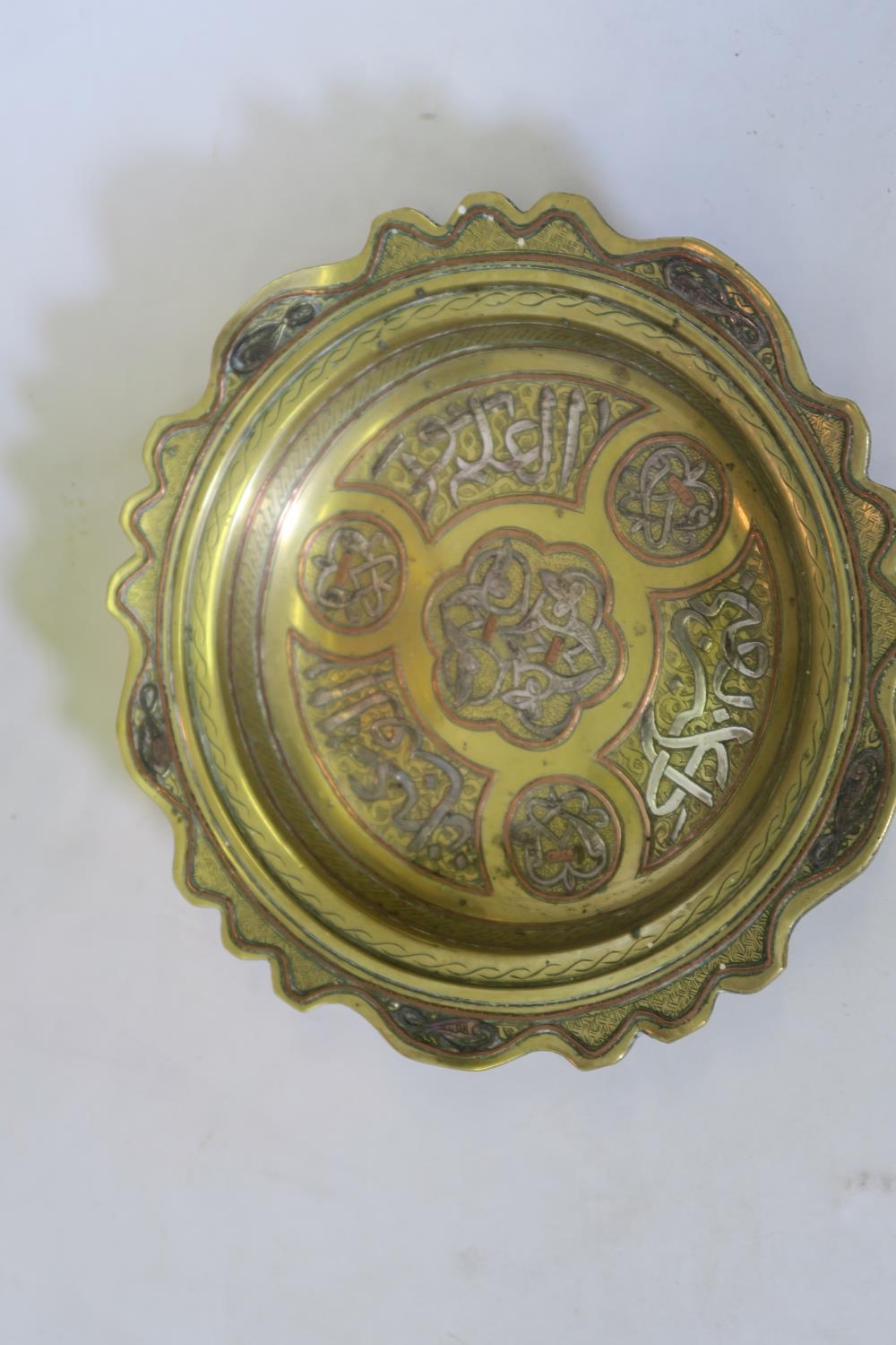 A hand beaten brass, copper and white metal vase, and a Cairoware dish inlaid with Islamic calligraphy decoration, 8" diameter