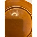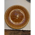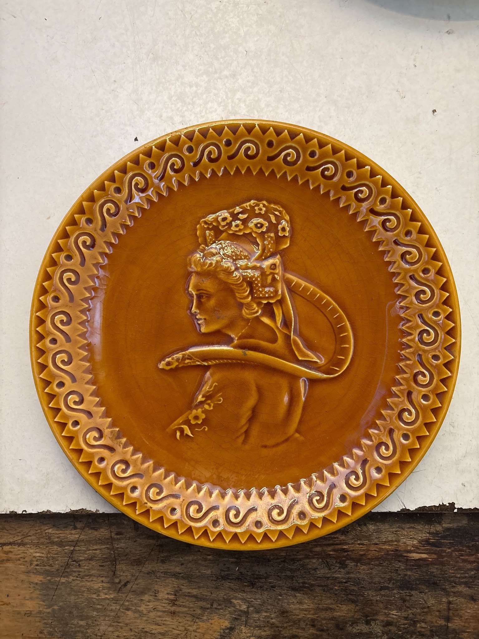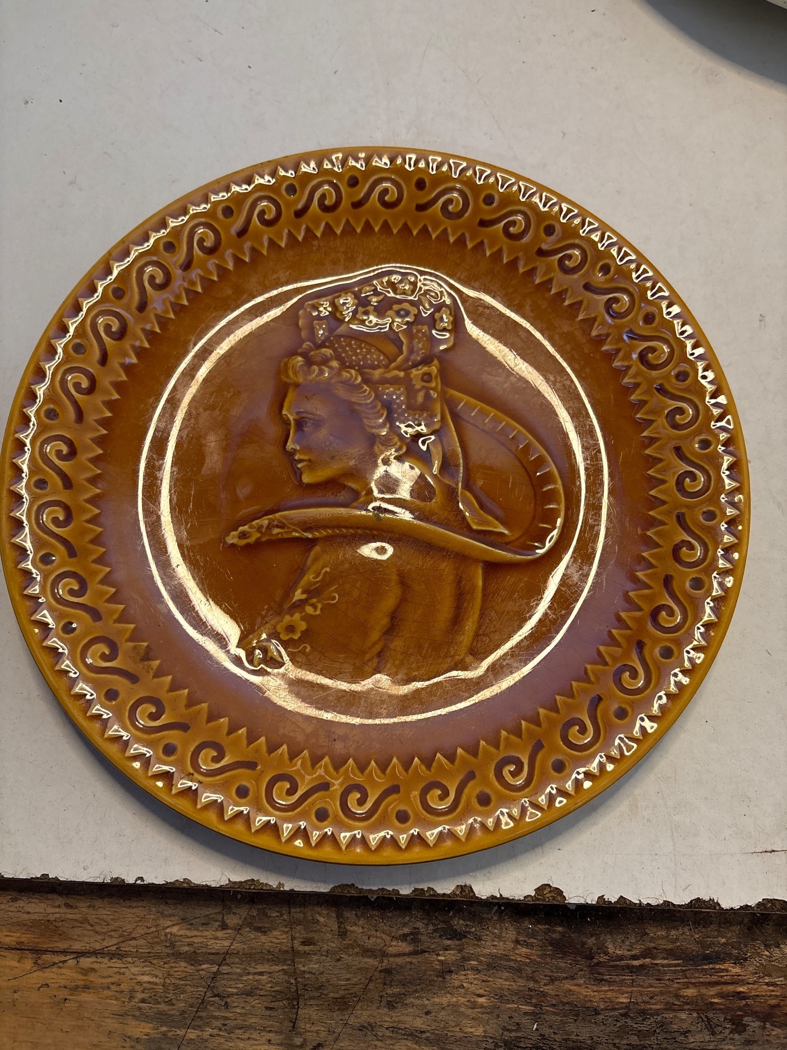 Circular ceramic plate with embossed figure, glazed amber finish