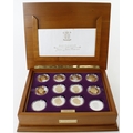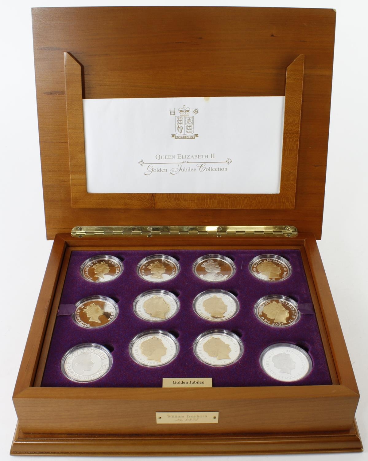 Queen Elizabeth II Golden Jubilee Collection. The 24 coin set of Silver Crown sized coins from around the world 2002-2003 some with the portrait in 22ct gold all cased FDC in an impressive wooden box with the purple velvet bag and a selection of certificates
