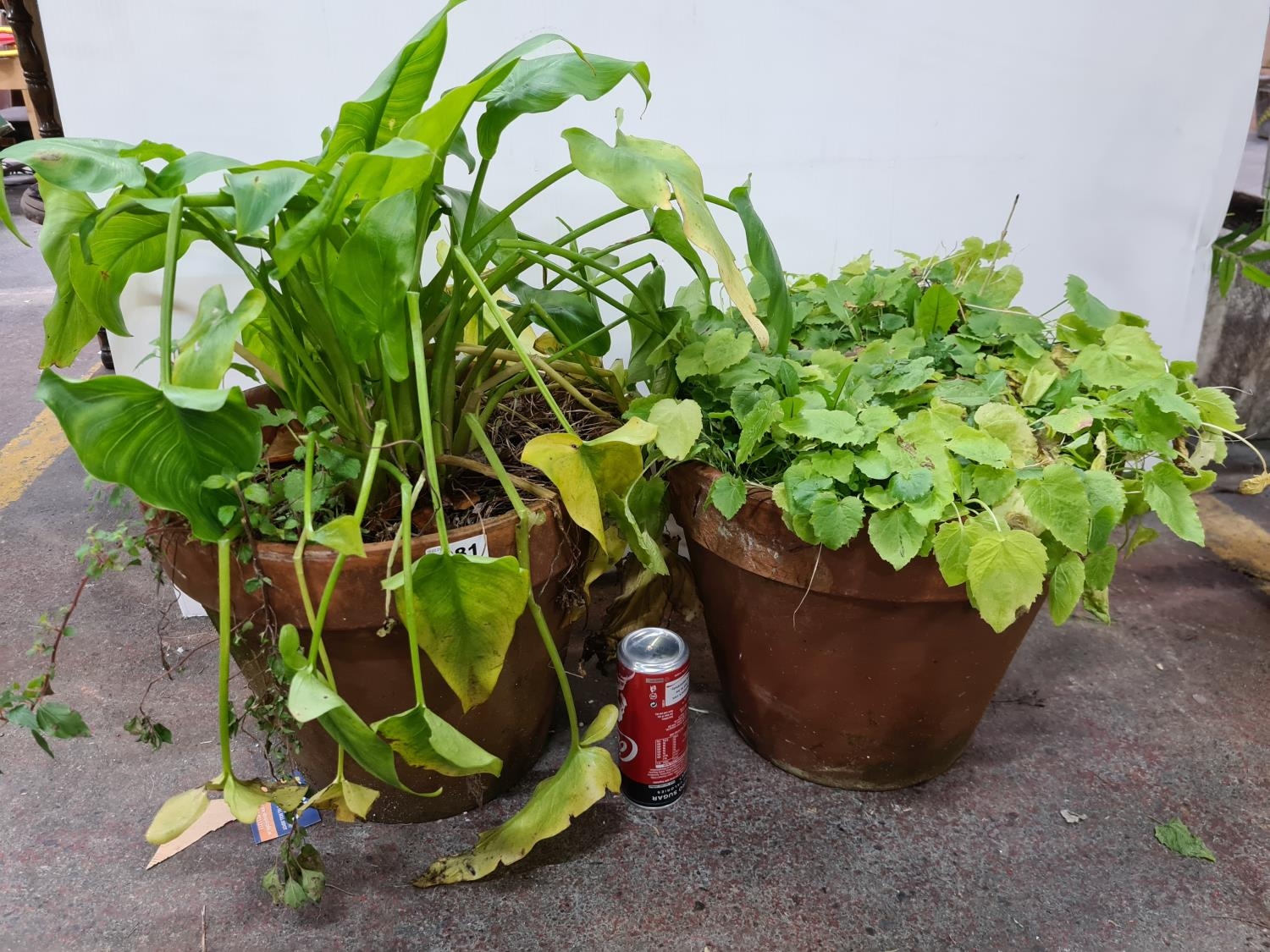 Two large heavy Terracotta plant pots and plants.