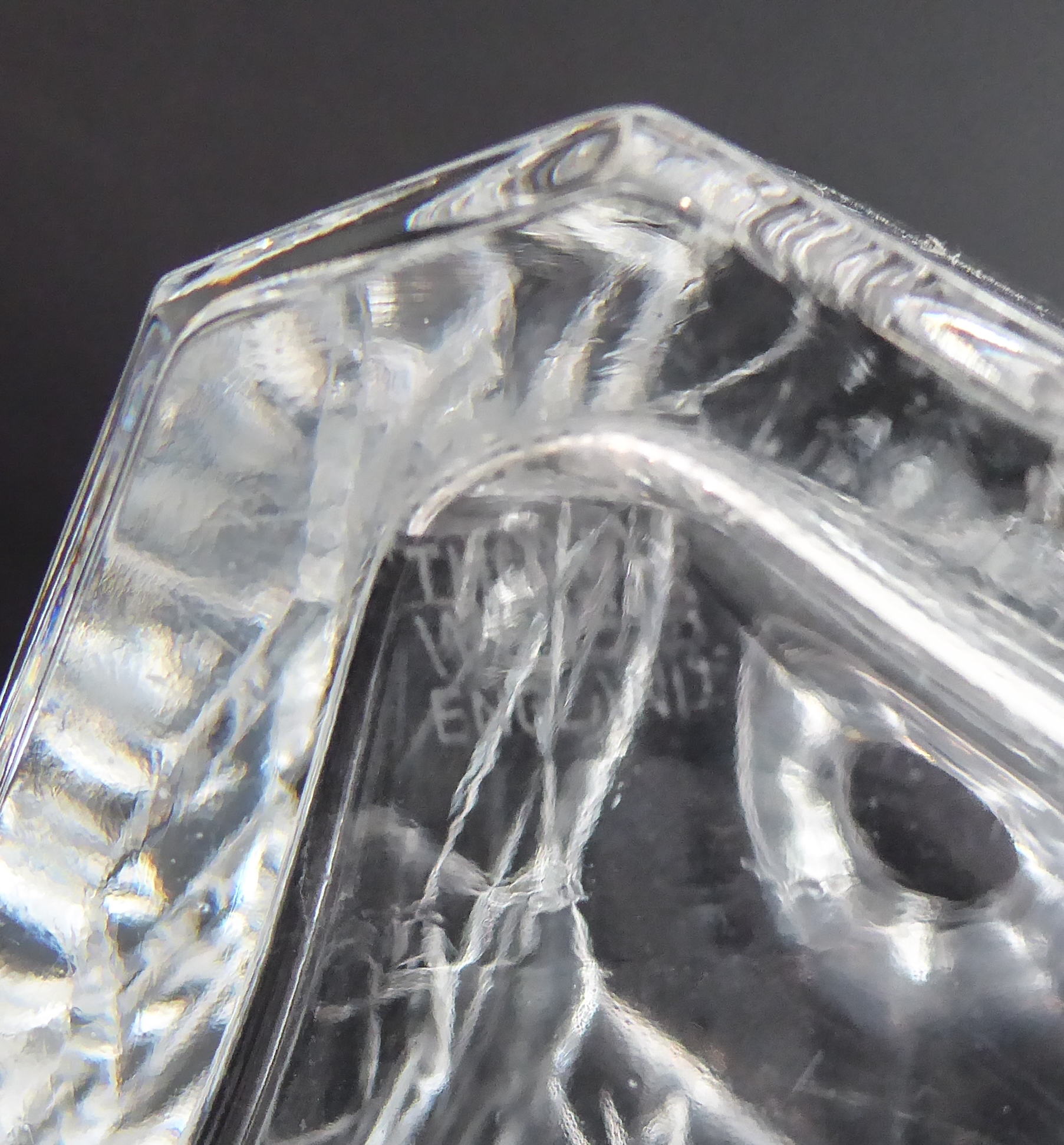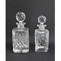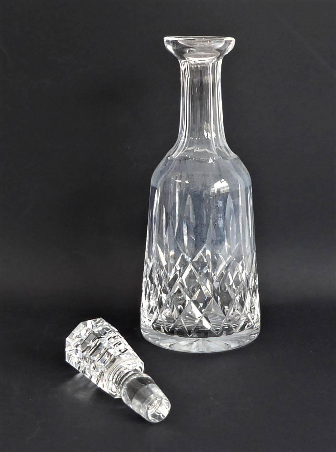 a modern hand-cut mallet-shaped decanter and stopper ;
