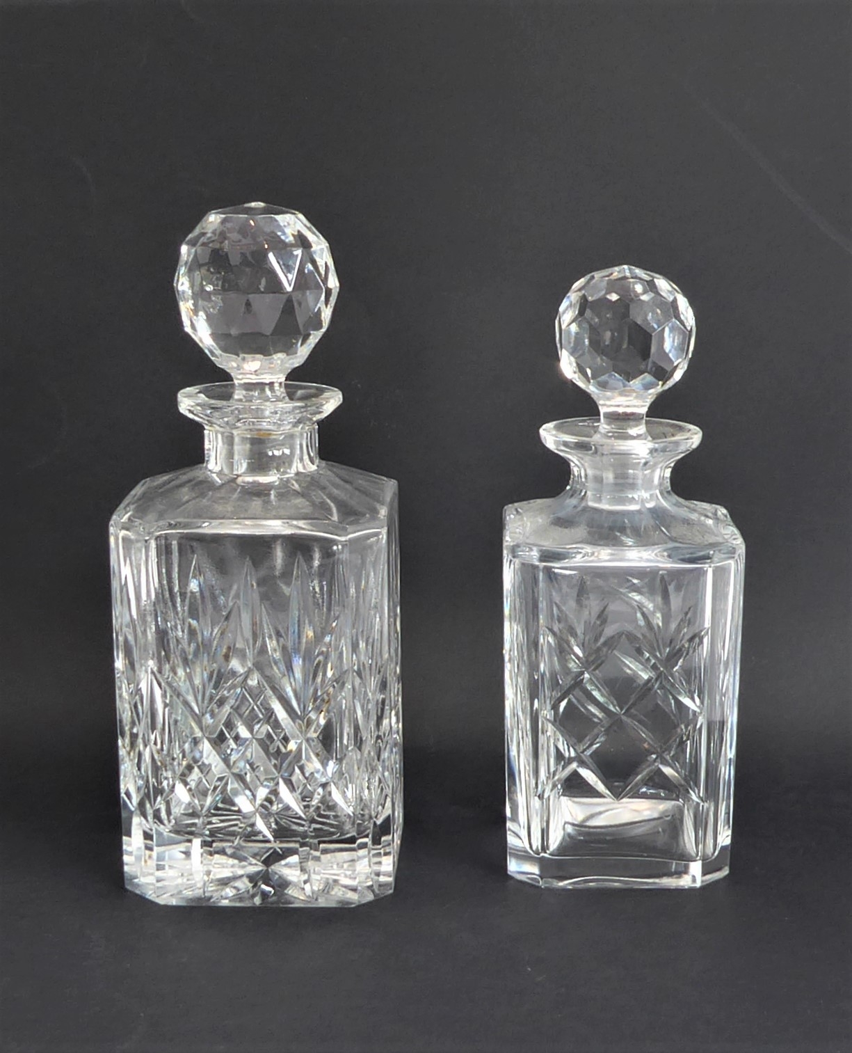 Four quality glass decanters: a modern hand-cut mallet-shap...