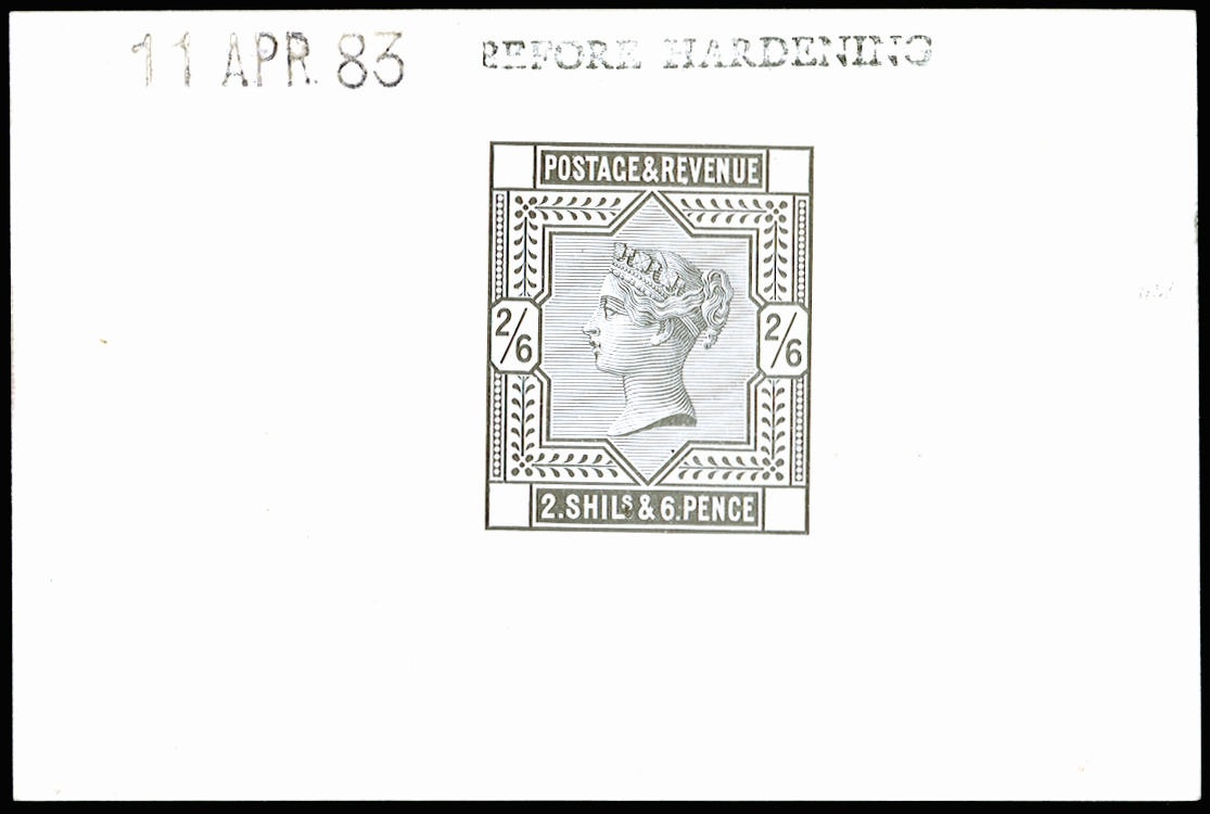 1883 2s6d Die proof. Very fine and fresh example printed by DLR in black on white glazed card (92 x 60mm) endorsed "BEFORE HARDENING" and dated "11 APR. 83". Scarce.