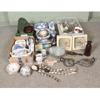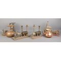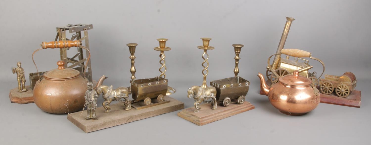 A collection of metalwares, to include two pairs of candlesticks, mining figures and copper kettle.
