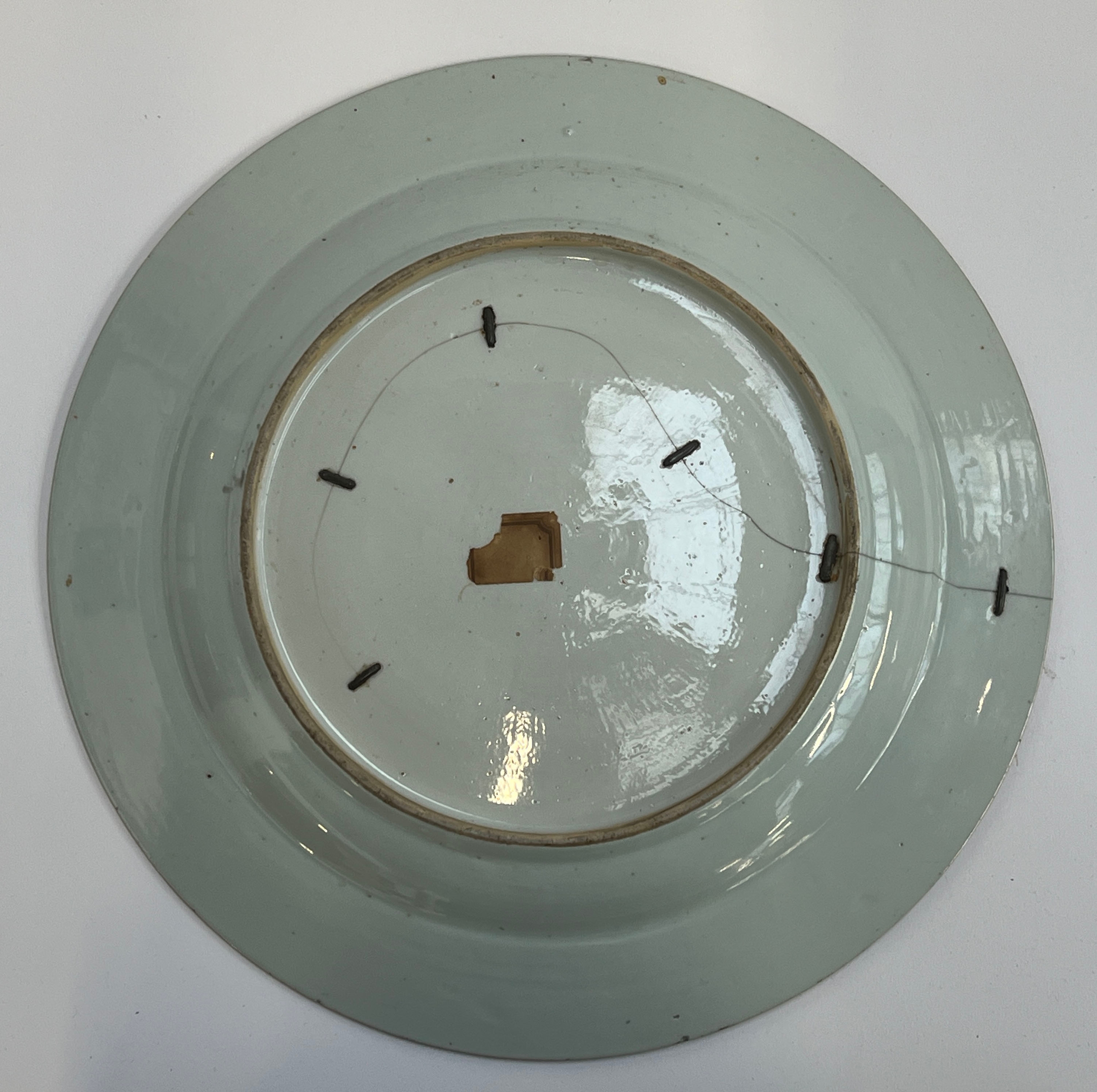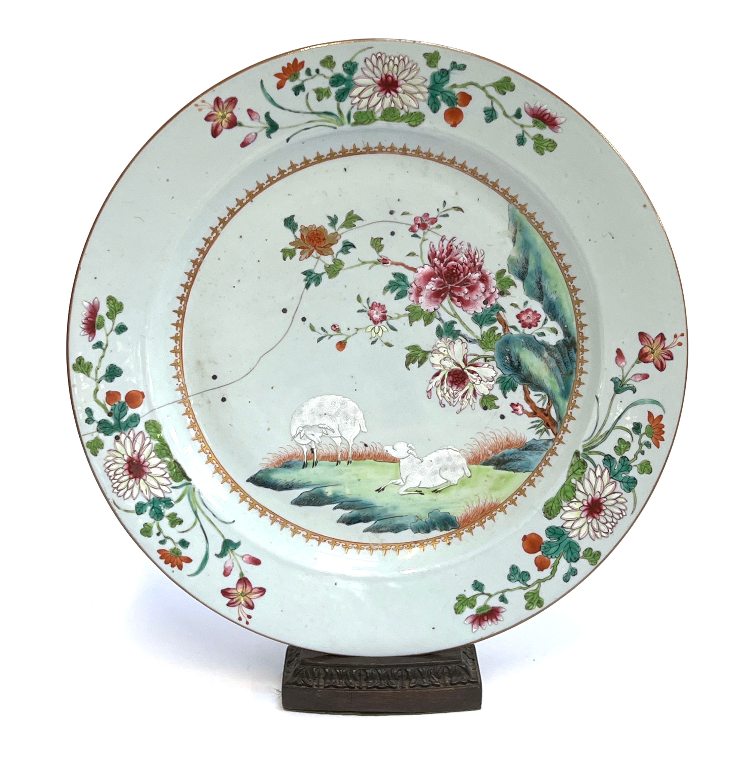 A large Chinese famille rose porcelain charger (af, staple repairs), decorated with sheep and flowers, 38cmD
