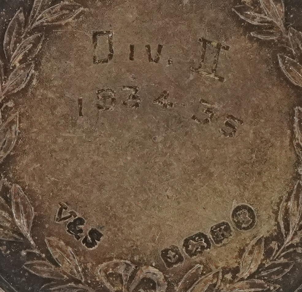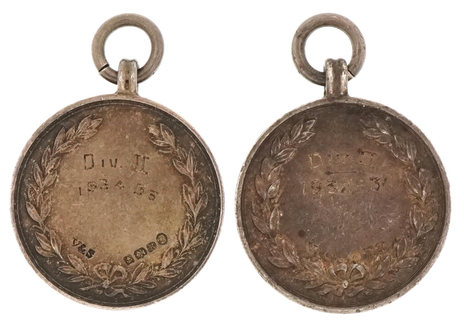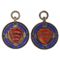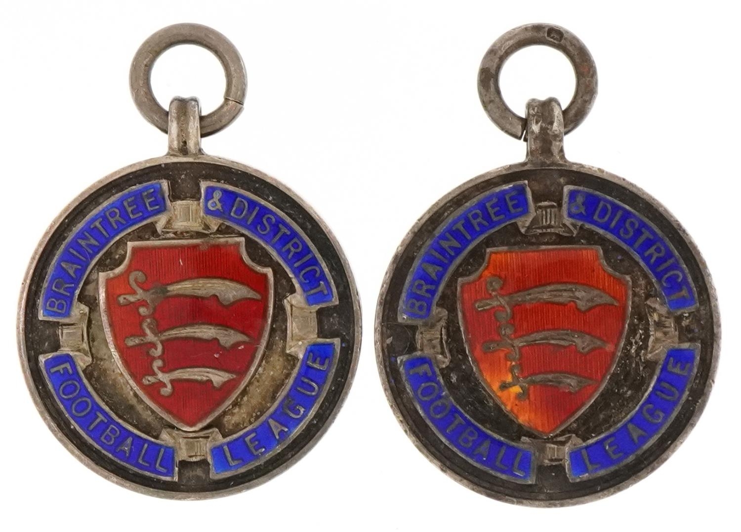 Two silver and enamel Braintree & District Football League sports jewels, 2.8cm in diameter, 30.2g