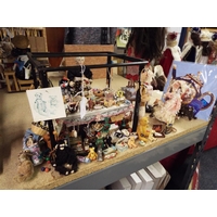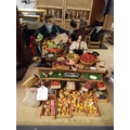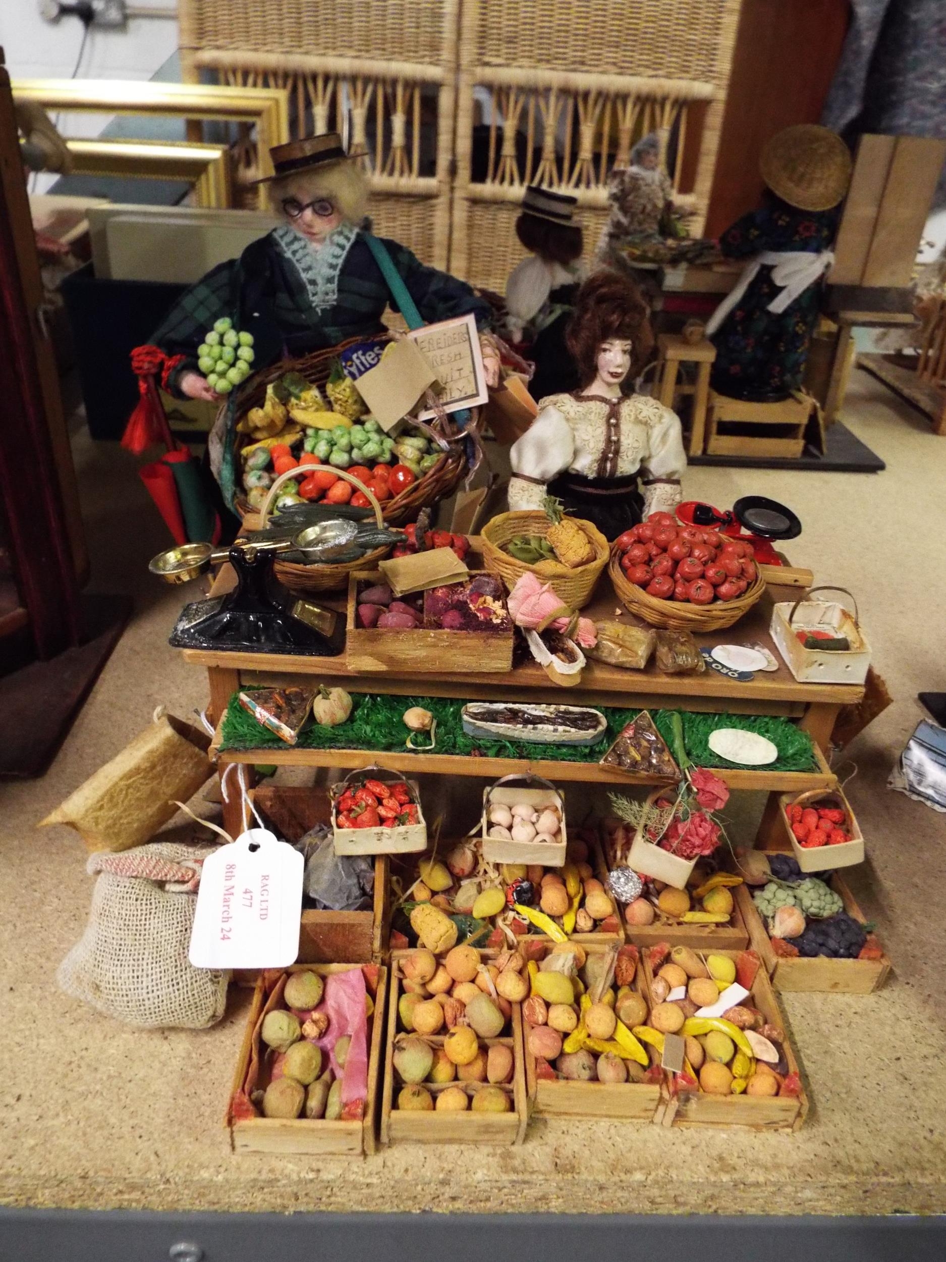 A vintage model of a market greengrocers stall (largest doll 23 cm high)