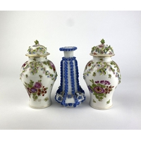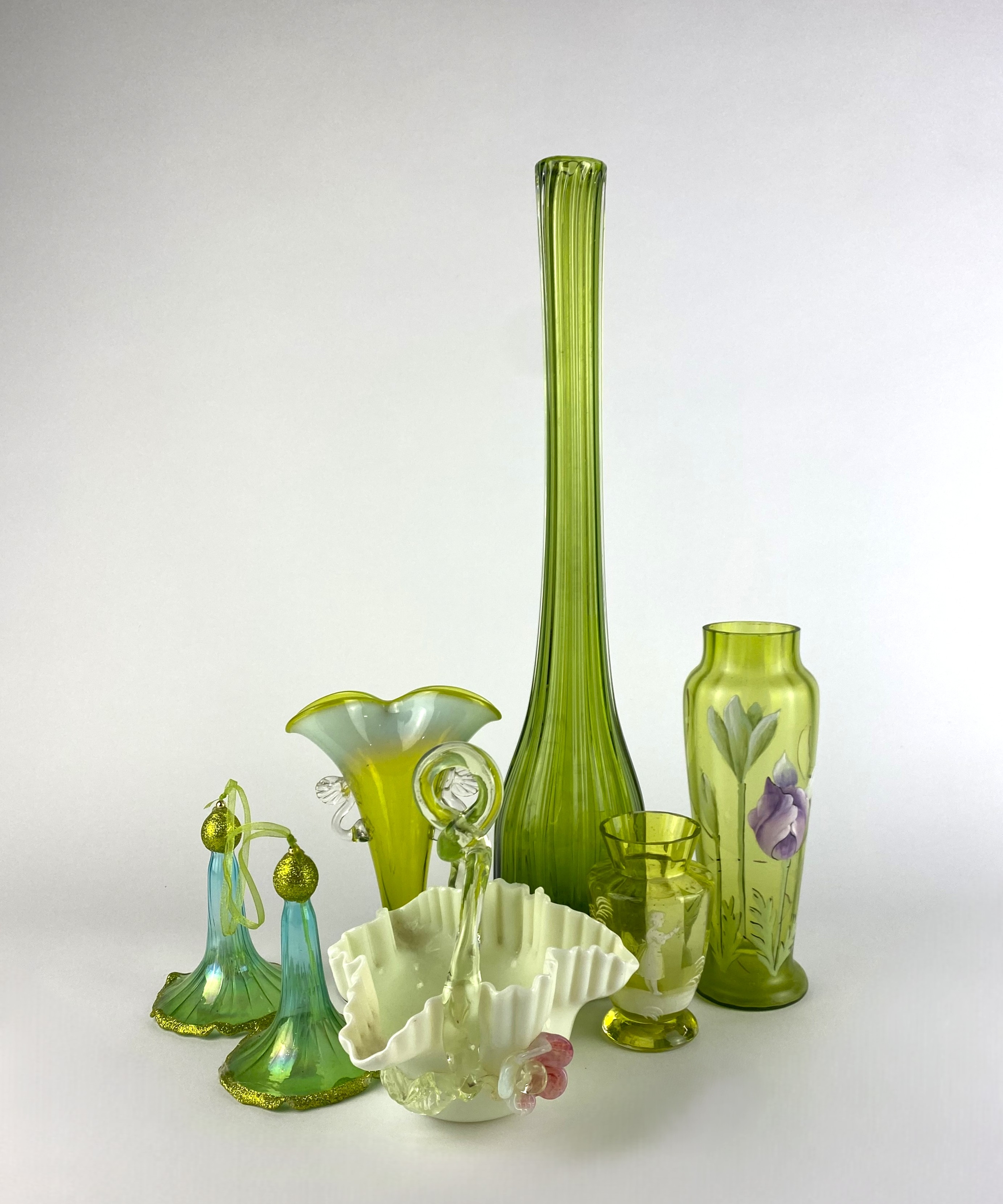 A Mary Gregory style vase, in lime green glass, of shaped form, height 9.7cm, together with continental glass vase, of shaped form, enamel decorated with flowers, height 18.25cm, a pair of glass bell decorations, edged with glitter, height 10.5cm, a green glass vase, of ribbed form, mid century style, height 40cm, an art glass basket and handle, milk glass with green glass handle and applied flower, ground pontil to base, height 16cm and a vaseline green glass vase, two handled with shaped rim, ground pontil to base, height 15.5cm (7)